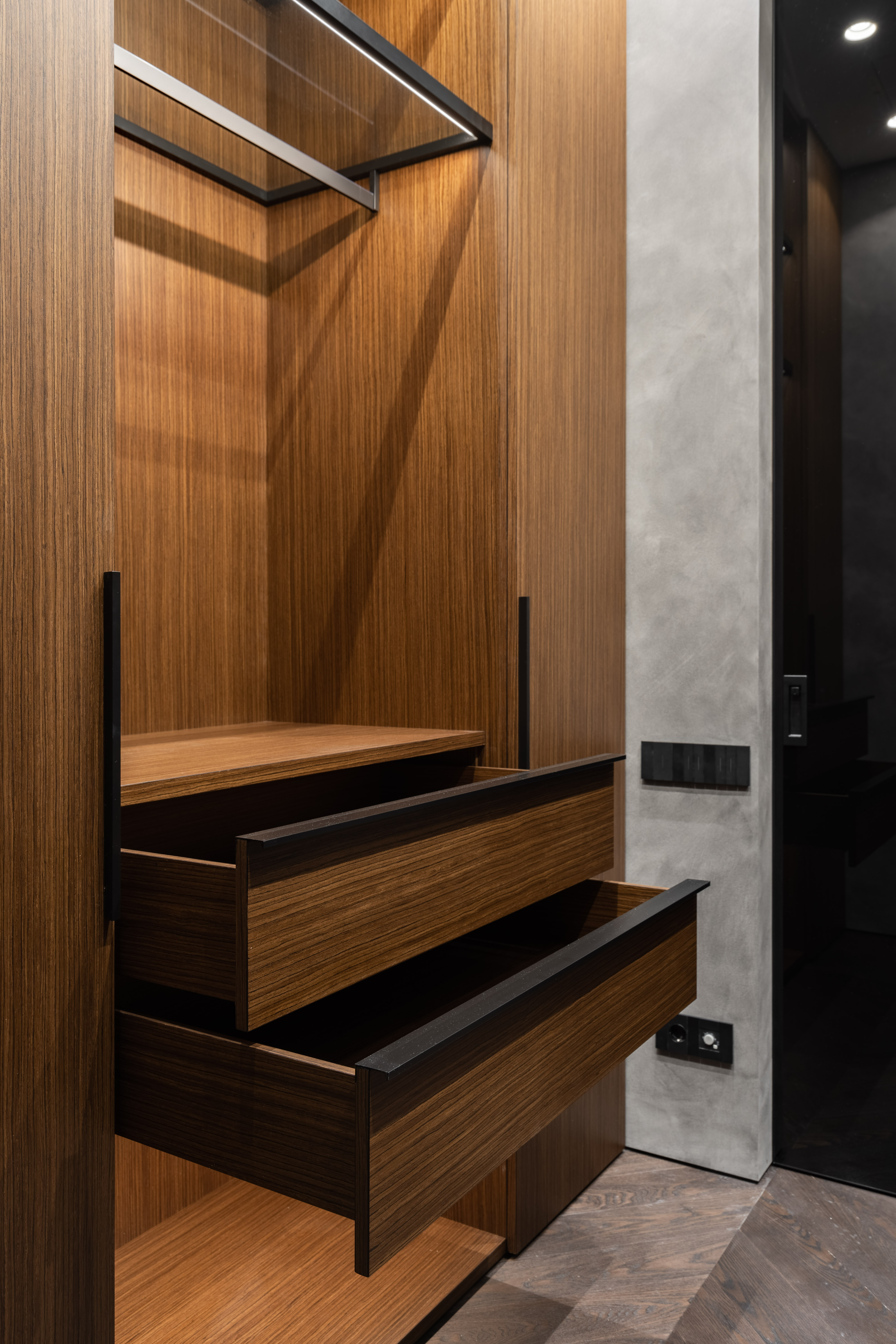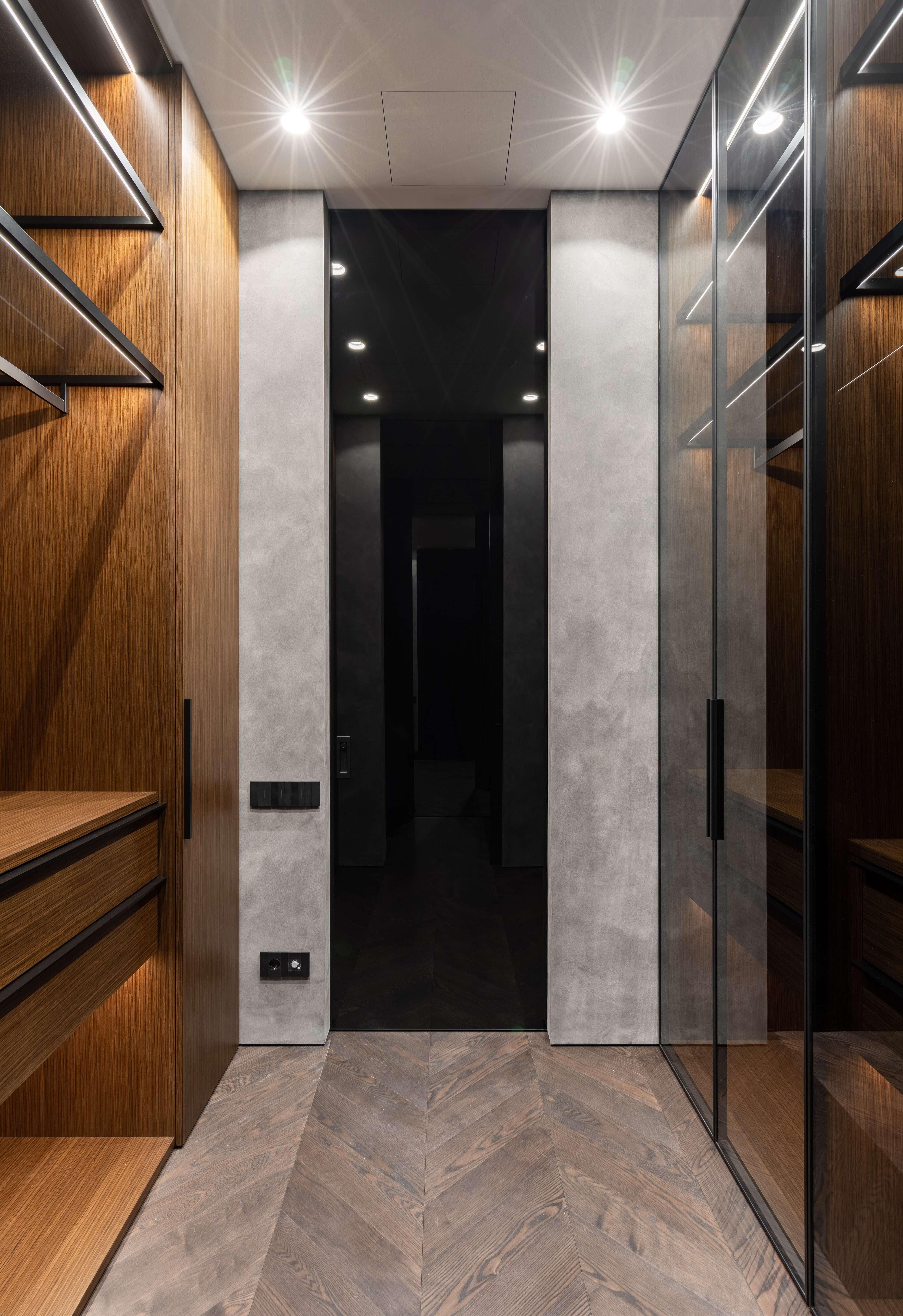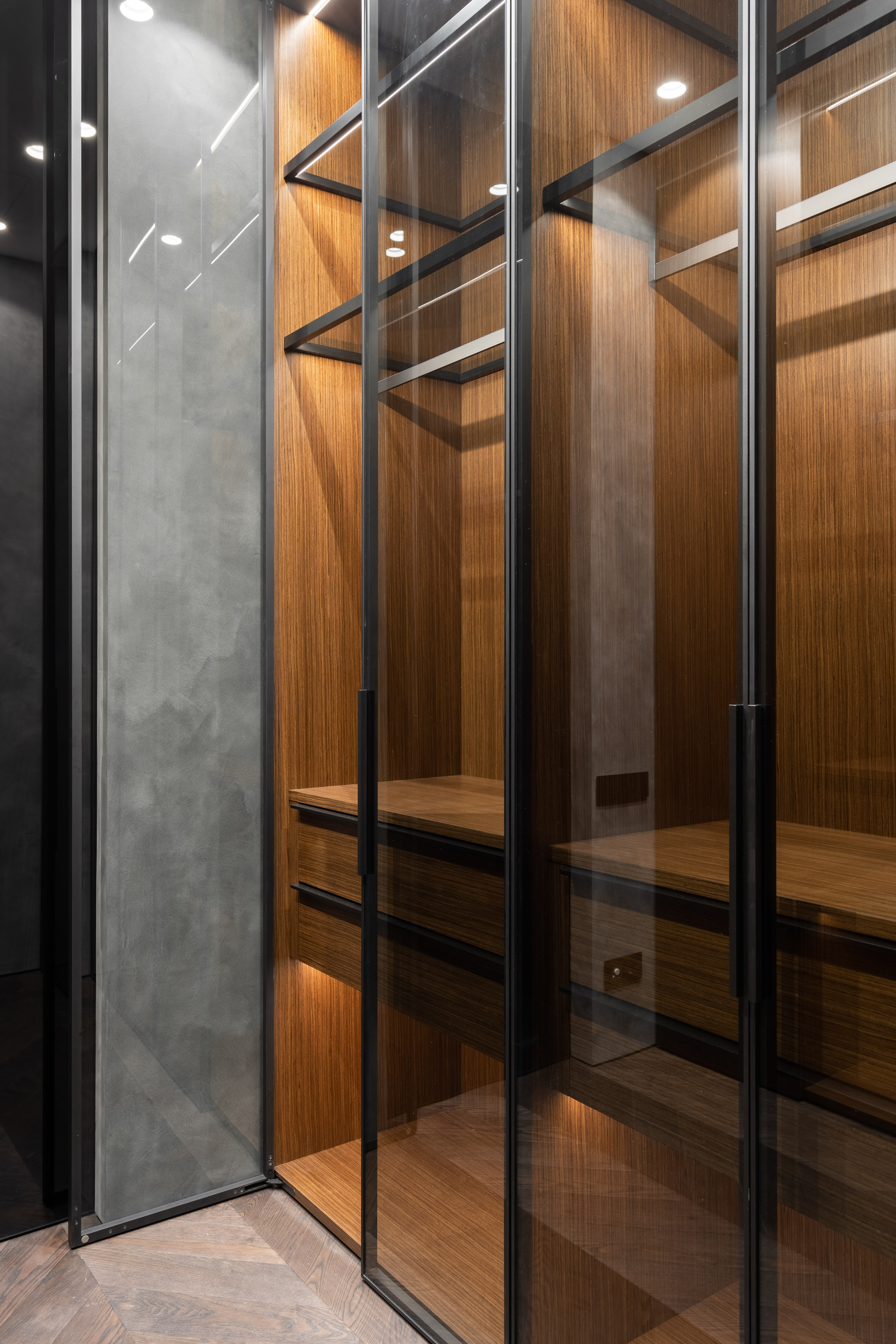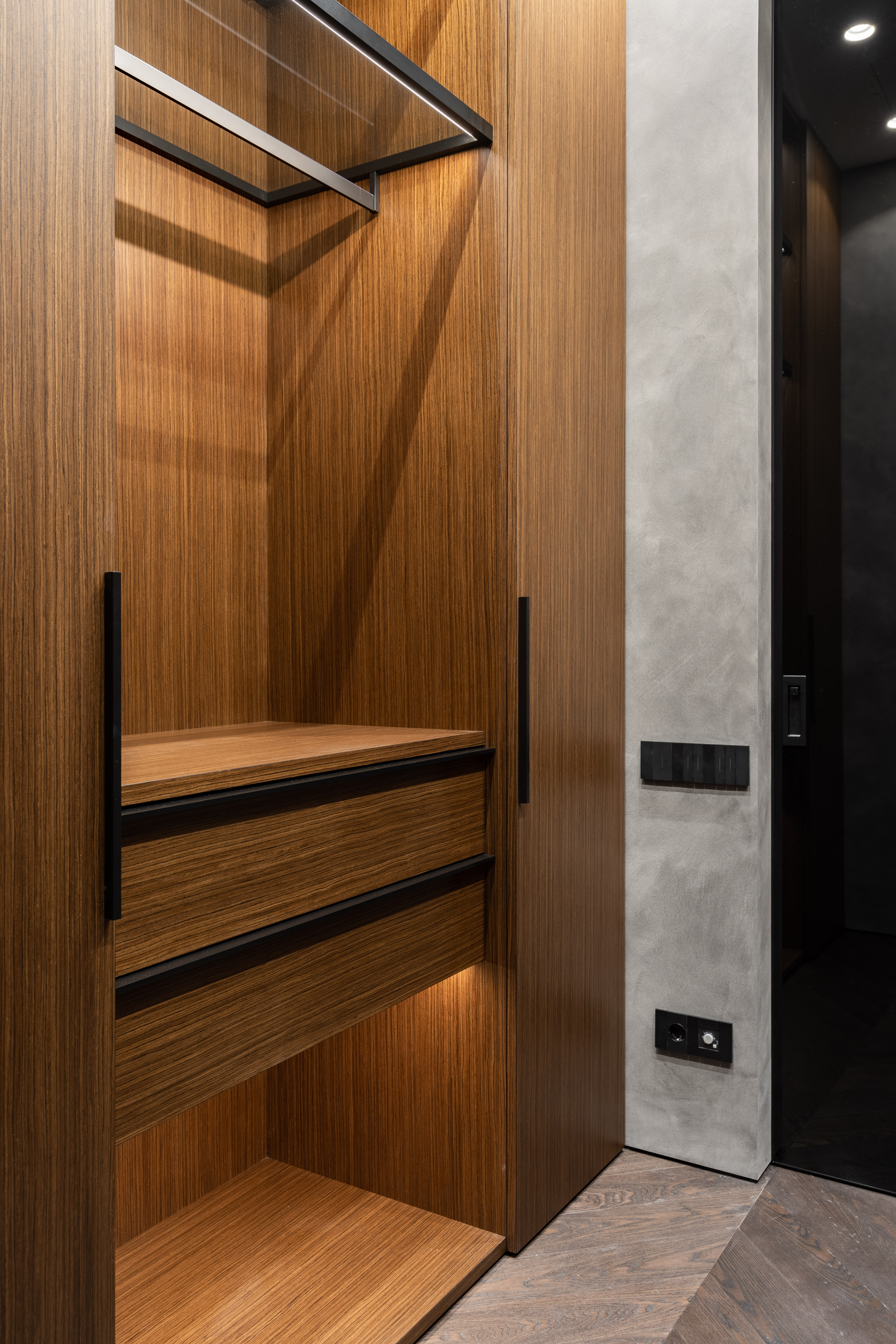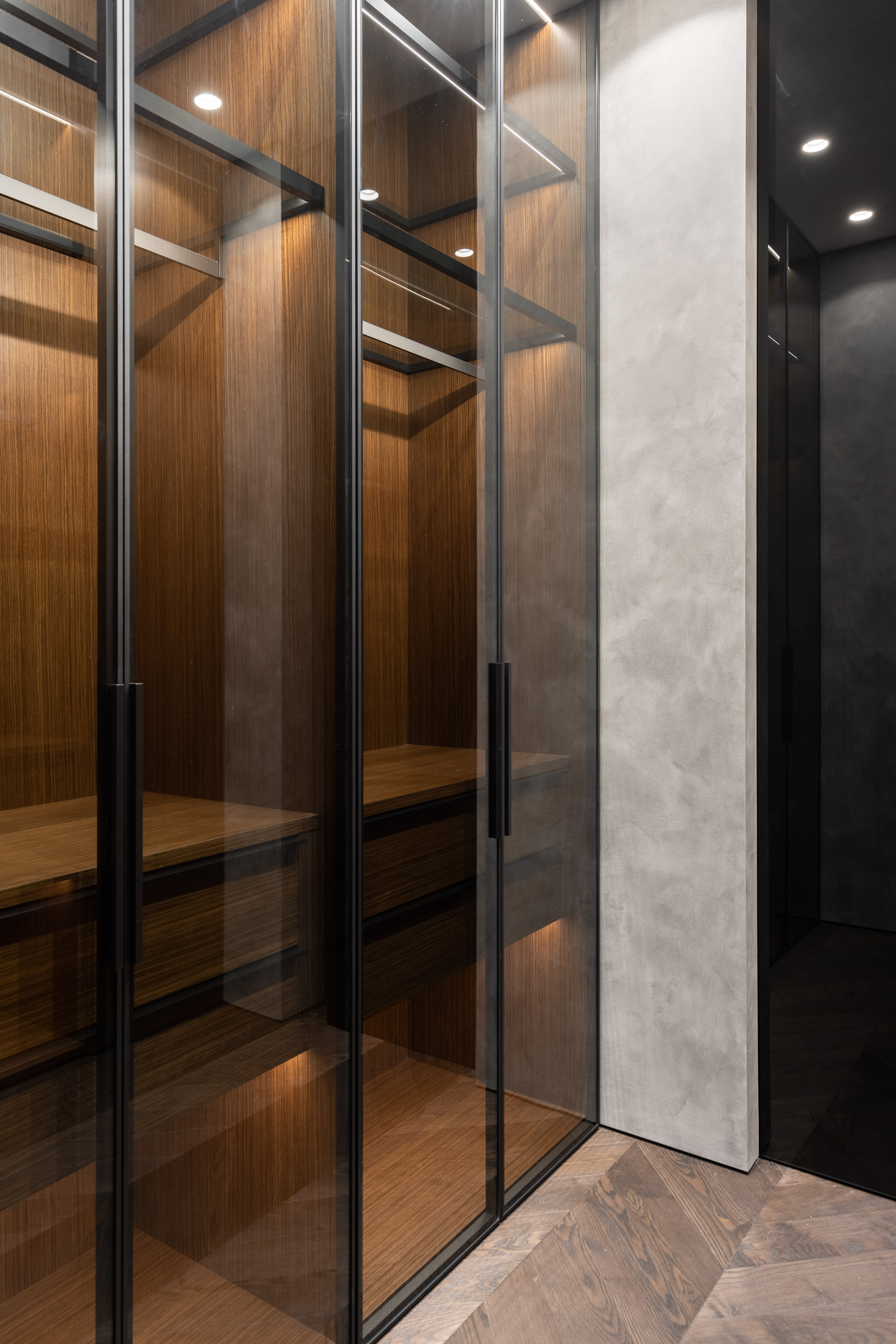 Surrounding this innovation is a composition of natural walnut veneer and matte black aluminum. Integrated architectural lighting adds atmospheric depth, emphasizing the wardrobe’s sculptural quality and inviting interaction.