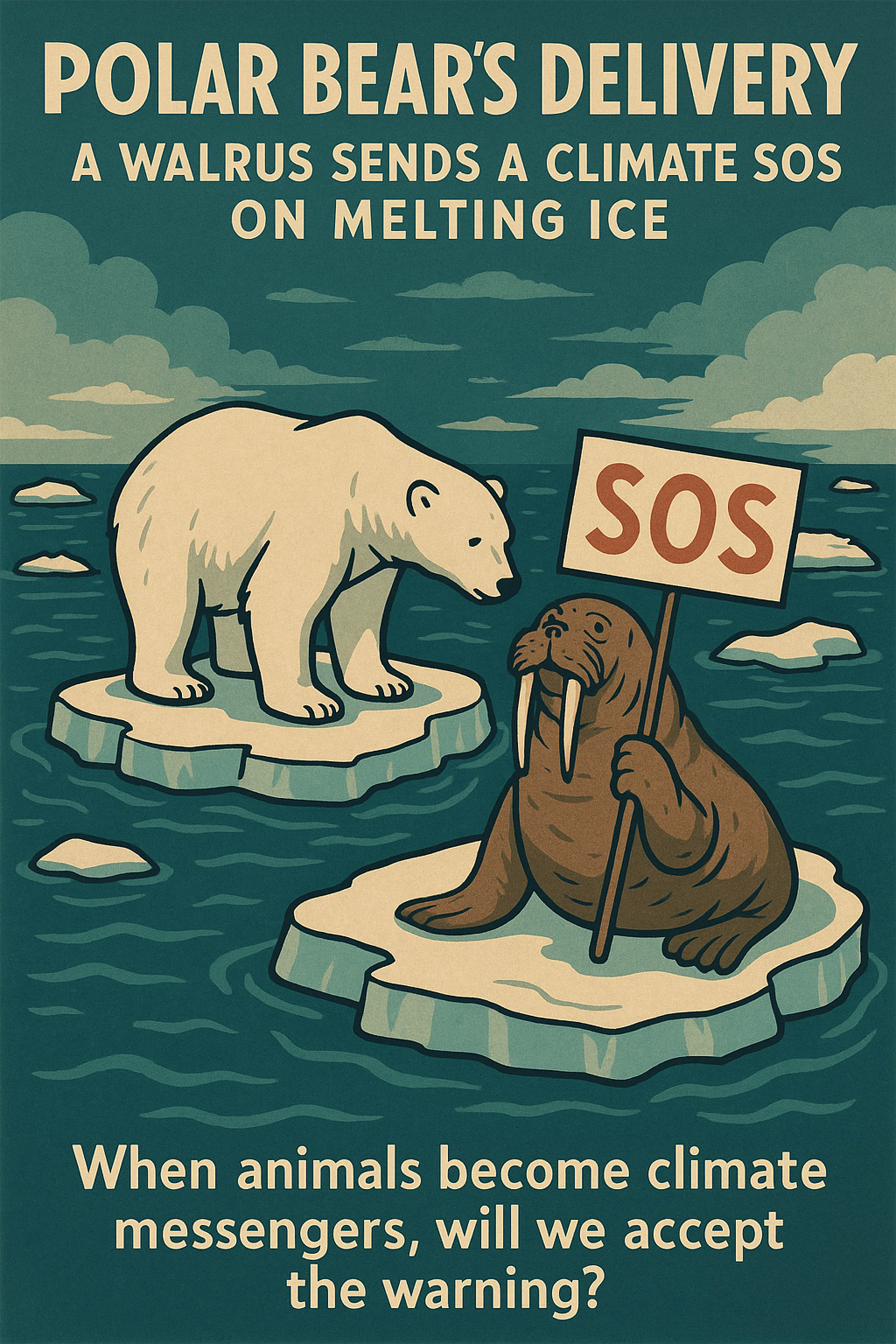 "Polar Bears Delivery: A Walrus Sends a Climate SOS on Melting Ice" - This poster uses the imagery of polar bears and walruses to vividly illustrate the threat climate change poses to polar ecosystems.