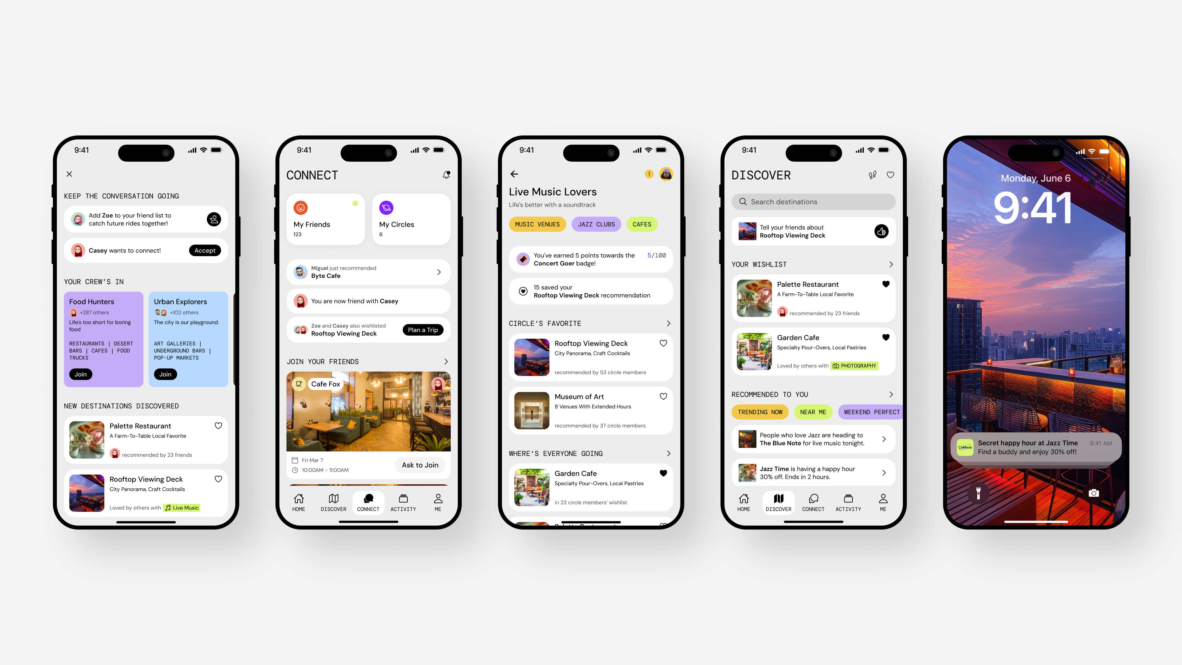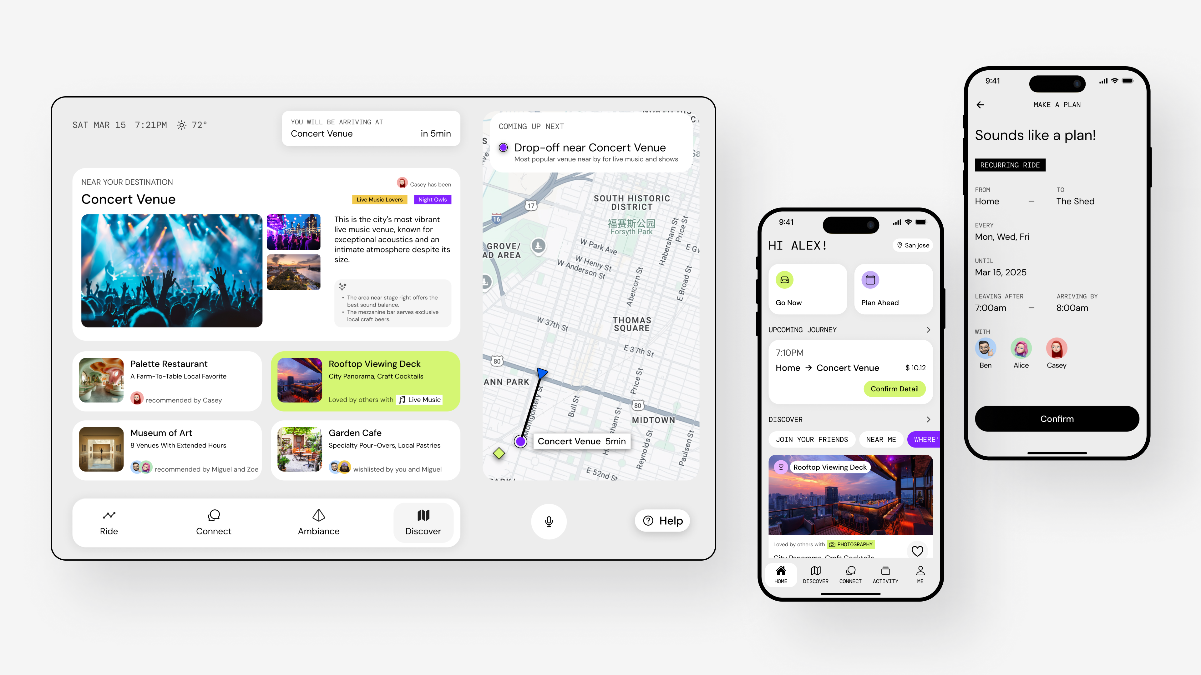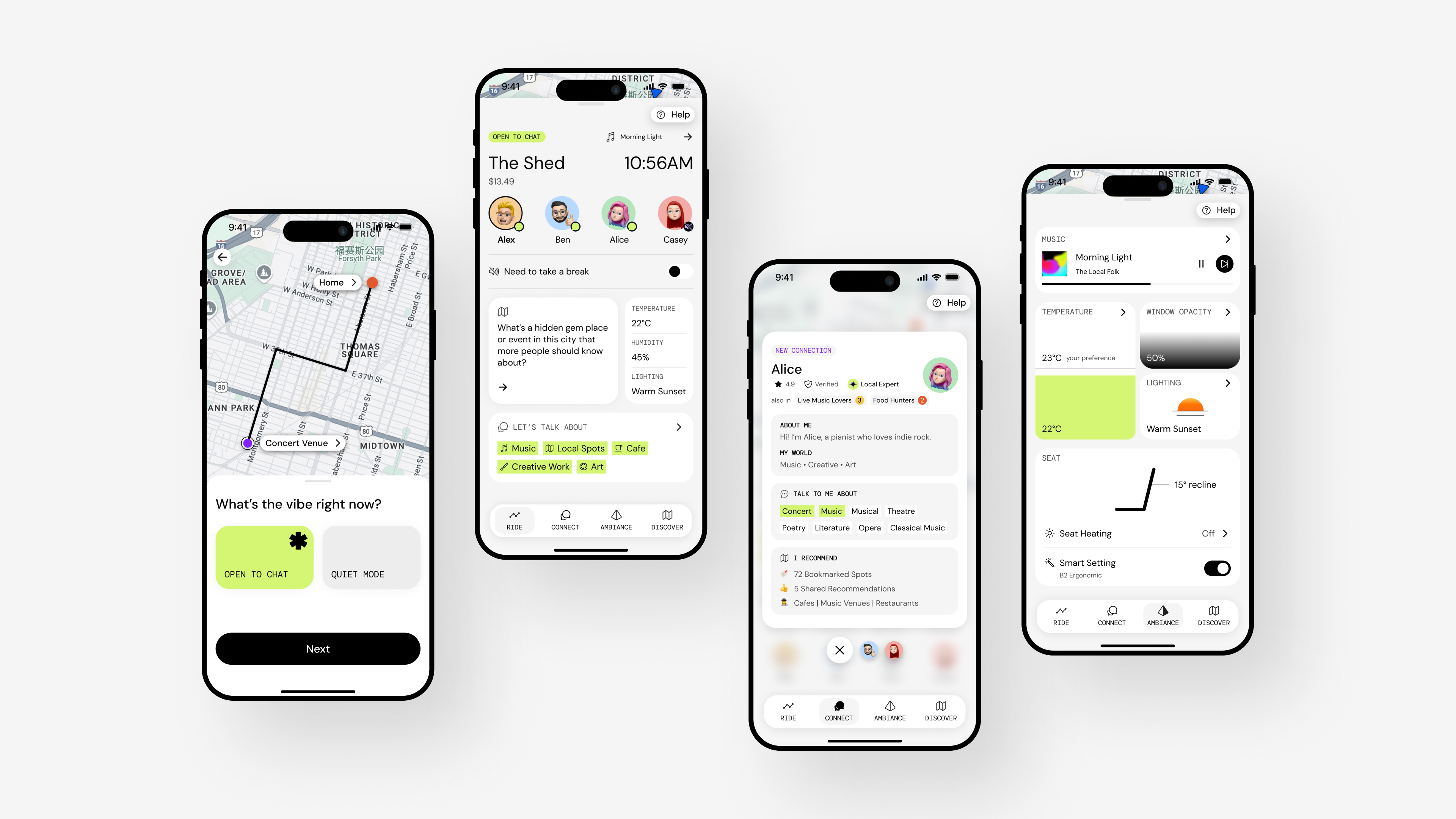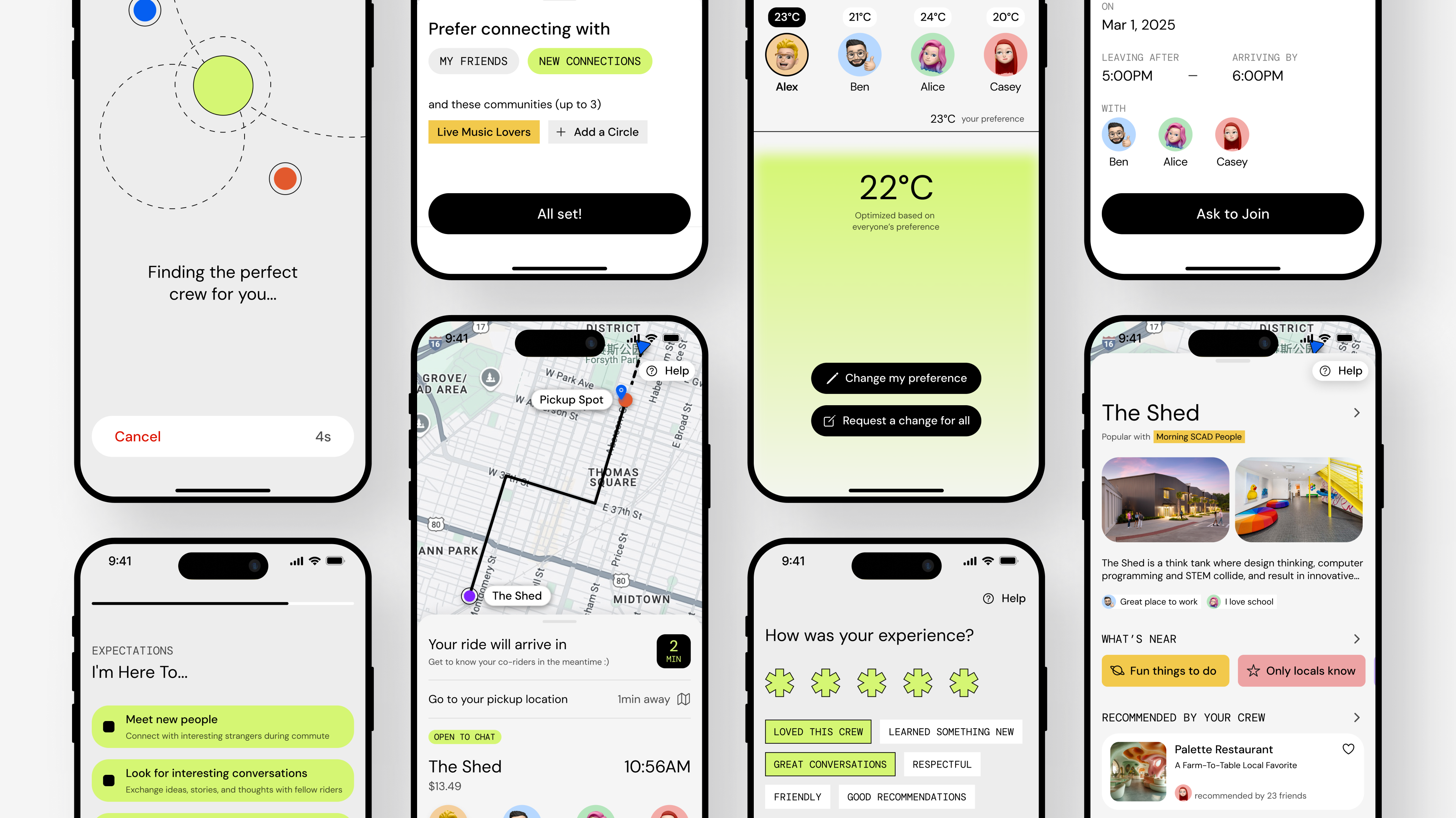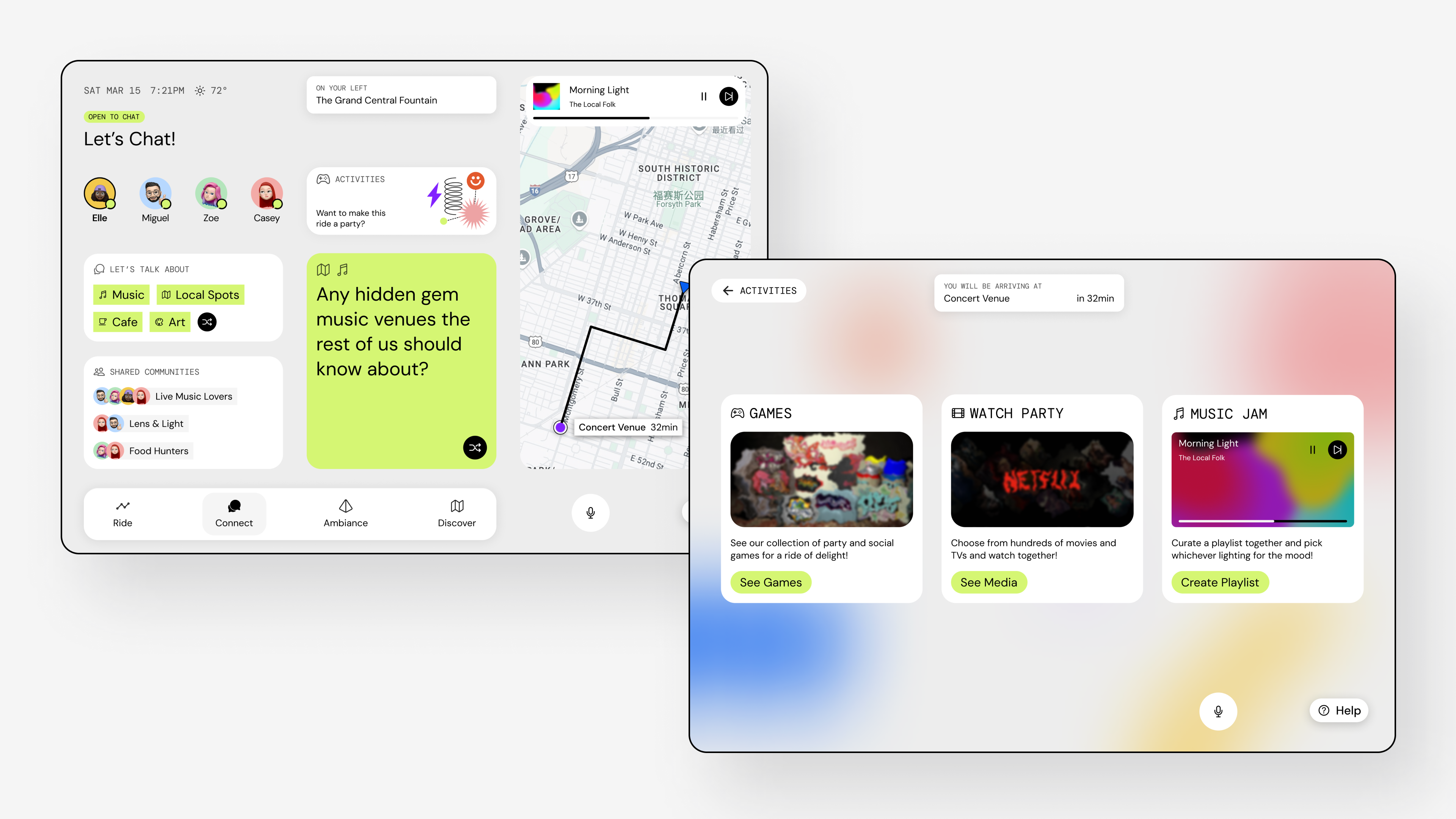 The system matches riders based on conversation compatibility, destination knowledge, community affiliations, and travel context. Users can join interest-based communities, establish themselves as local experts, and organize group adventures to favorite spots. The in-vehicle experience features conversation starters, destination highlights, and interactive elements that make journeys more engaging.