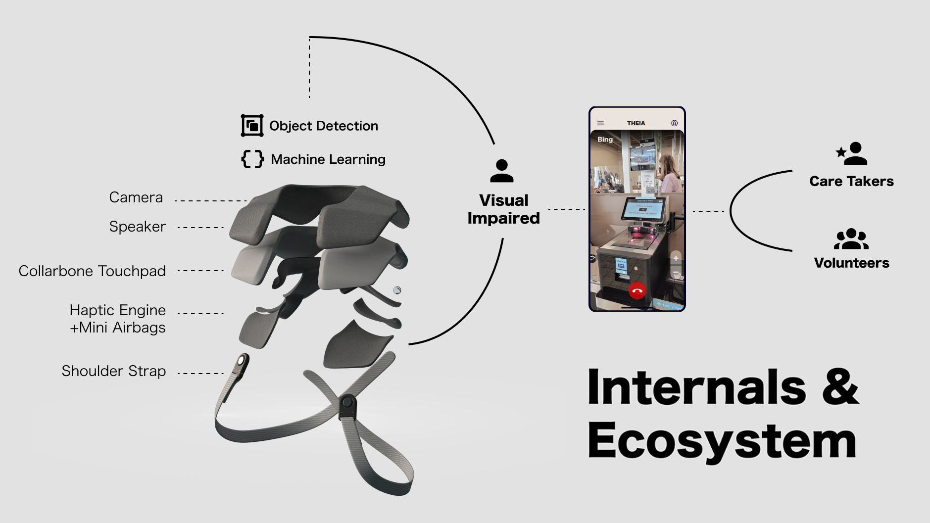 Unlike a traditional white cane, THEIA would be worn like a scarf, keeping users’ hands free, seamlessly blending into everyday wear. Complementing the hardware, its companion mobile app connects users to a trusted network of caregivers and volunteers, enabling real-time monitoring and support. This added layer of connectivity offers peace of mind and reassurance for both users and their loved ones.