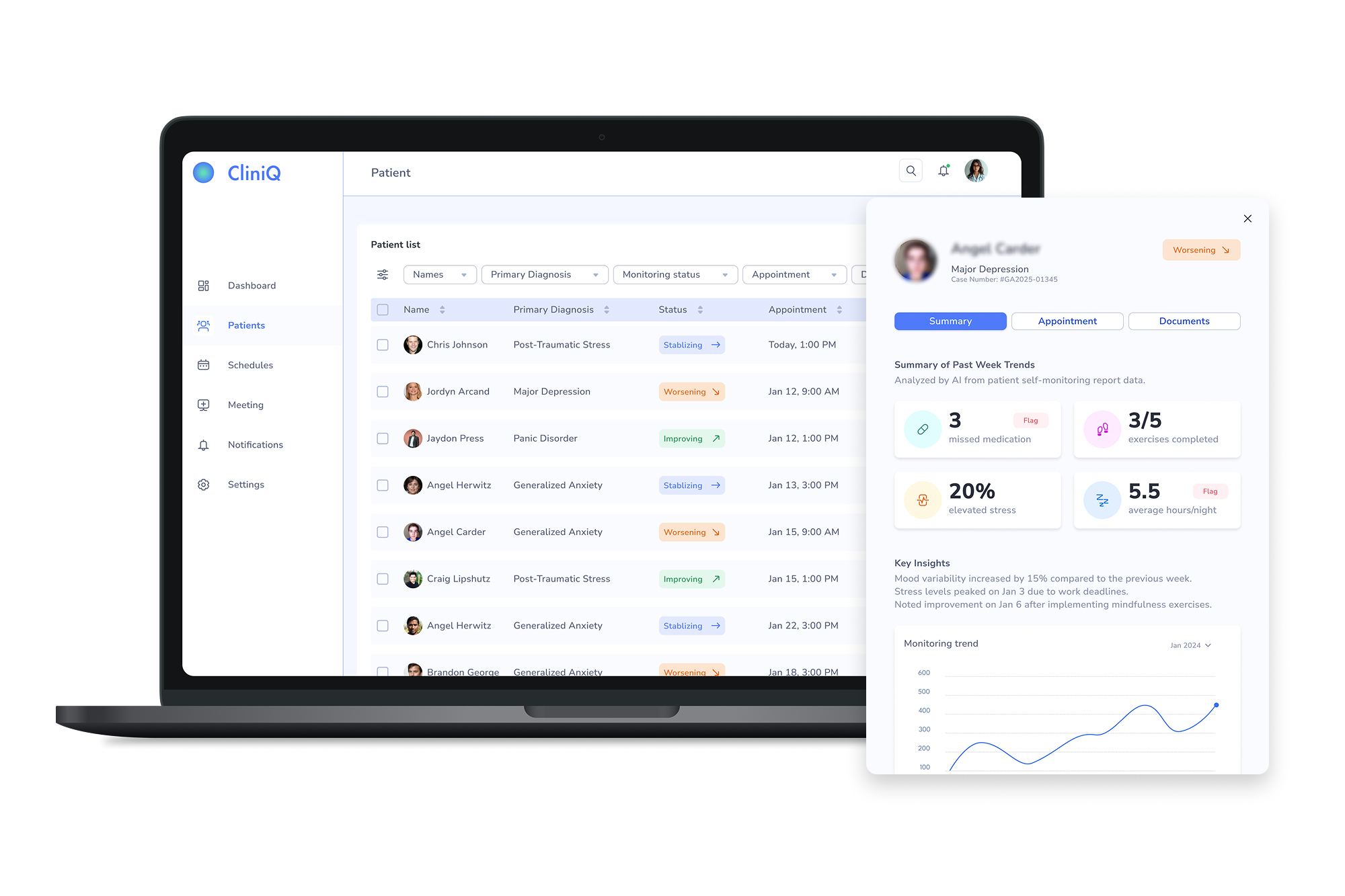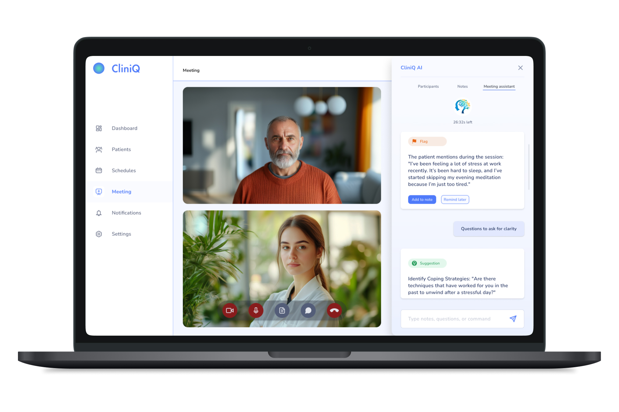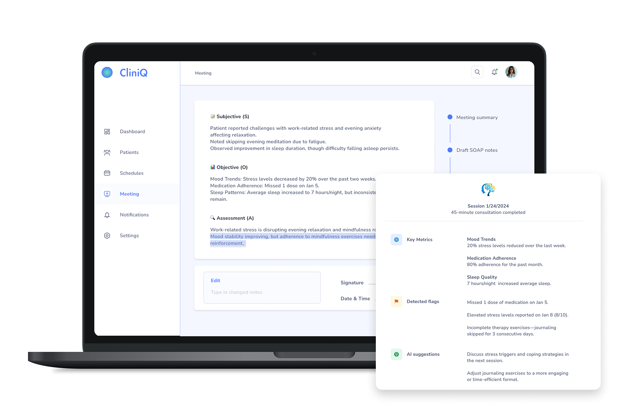 CliniQ redefines mental health consultations by seamlessly integrating AI-driven insights throughout the clinical workflow. From pre-session patient history analysis to real-time support during meetings and automated SOAP note generation post-session, CliniQ clears administrative clutter, empowering clinicians to focus on more meaningful and compassionate connections with their patients.