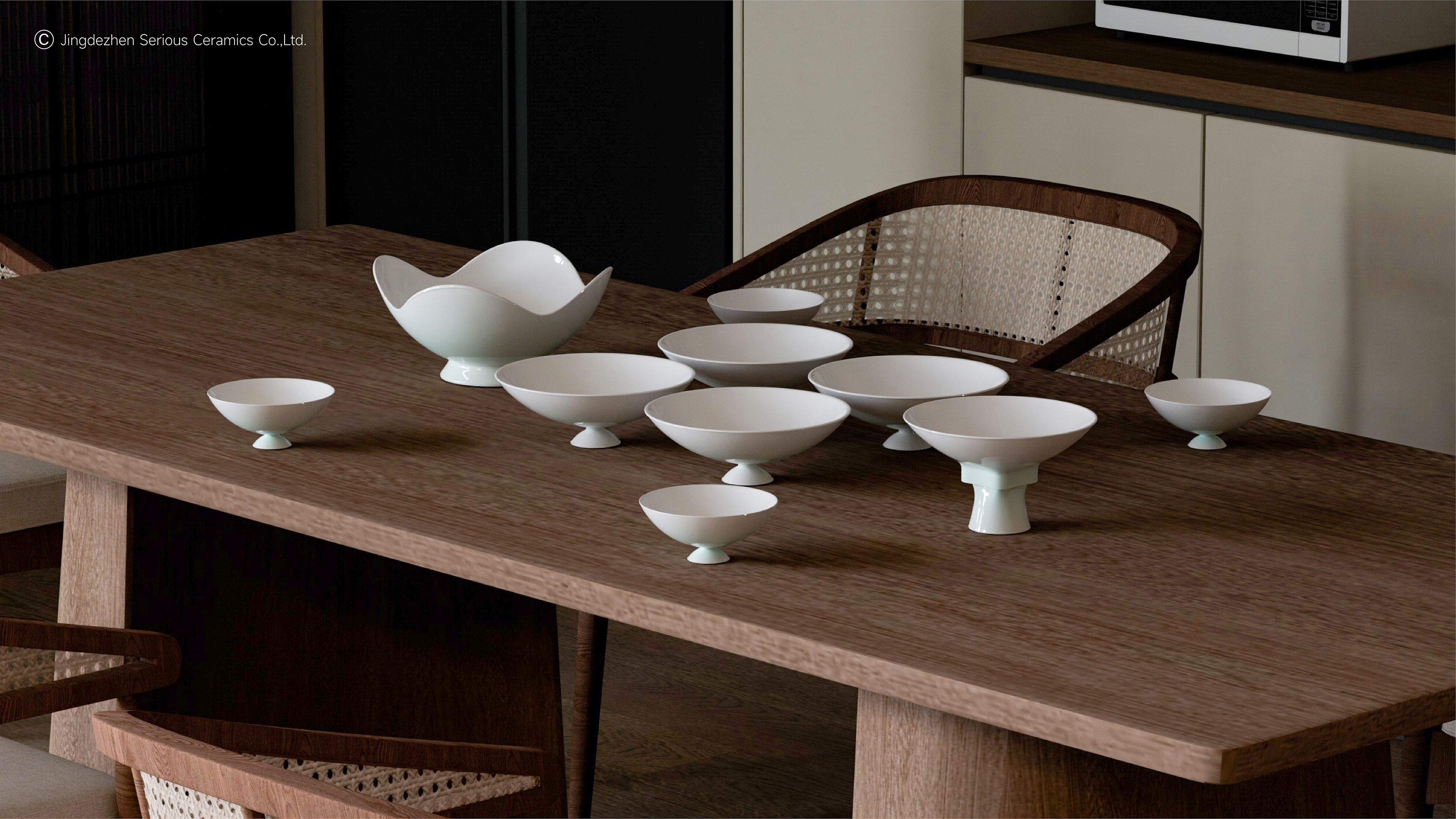 The set is crafted from Jingdezhen premium white clay, fired at 1200°C in a reduction flame. A 98% vitrified glaze forms a natural antimicrobial shield, while triple-dipping techniques infuse each piece with a jade-like luster. The 2mm ultra-thin arched foot—precisely engineered via digital kiln control—boasts 8kg load-bearing capacity with less than 0.3% deformation, marrying delicacy with durability. Fluid-dynamic curved plates enable one-handed stacking/unstacking, designed for modern fast-paced life.