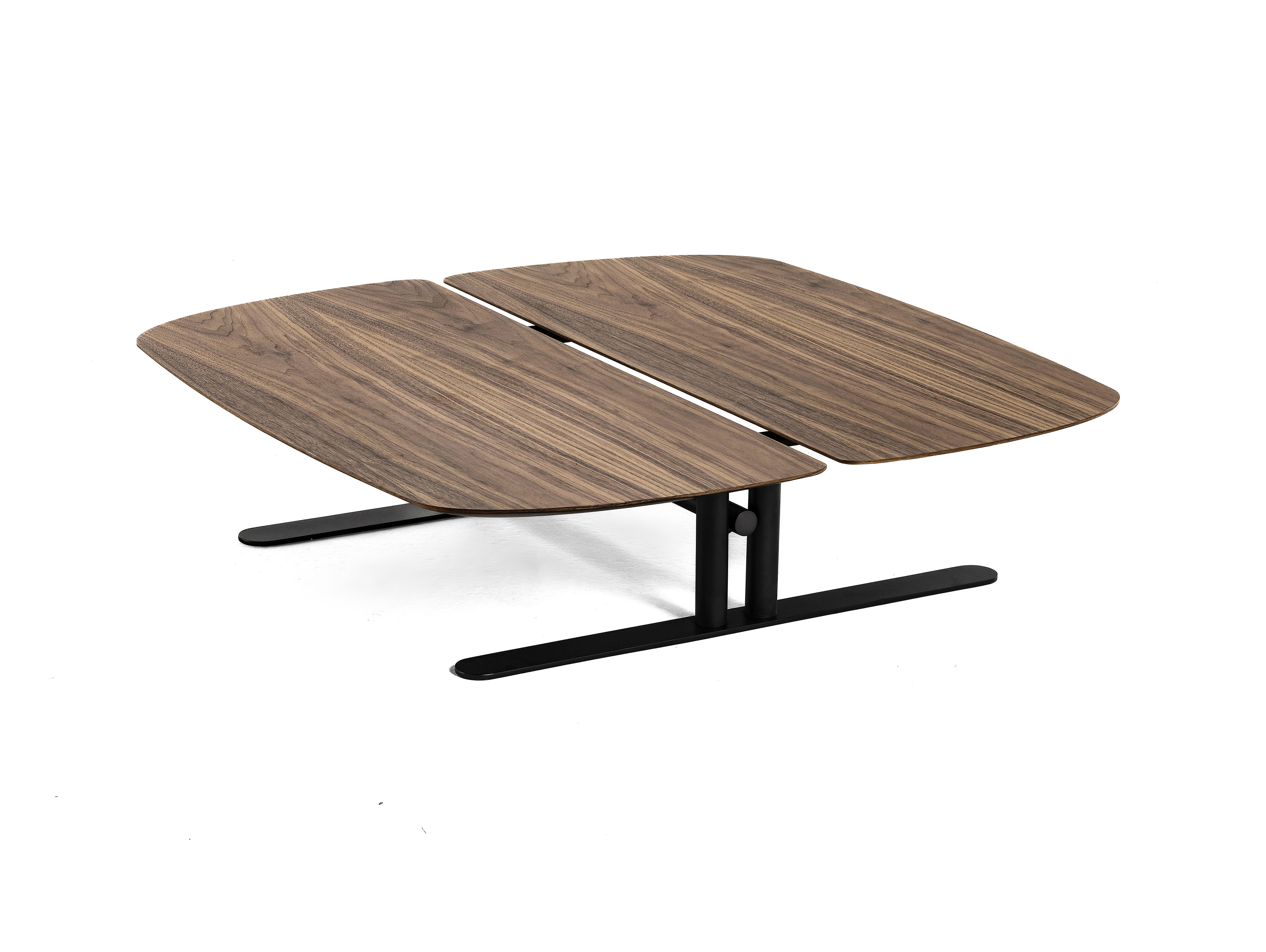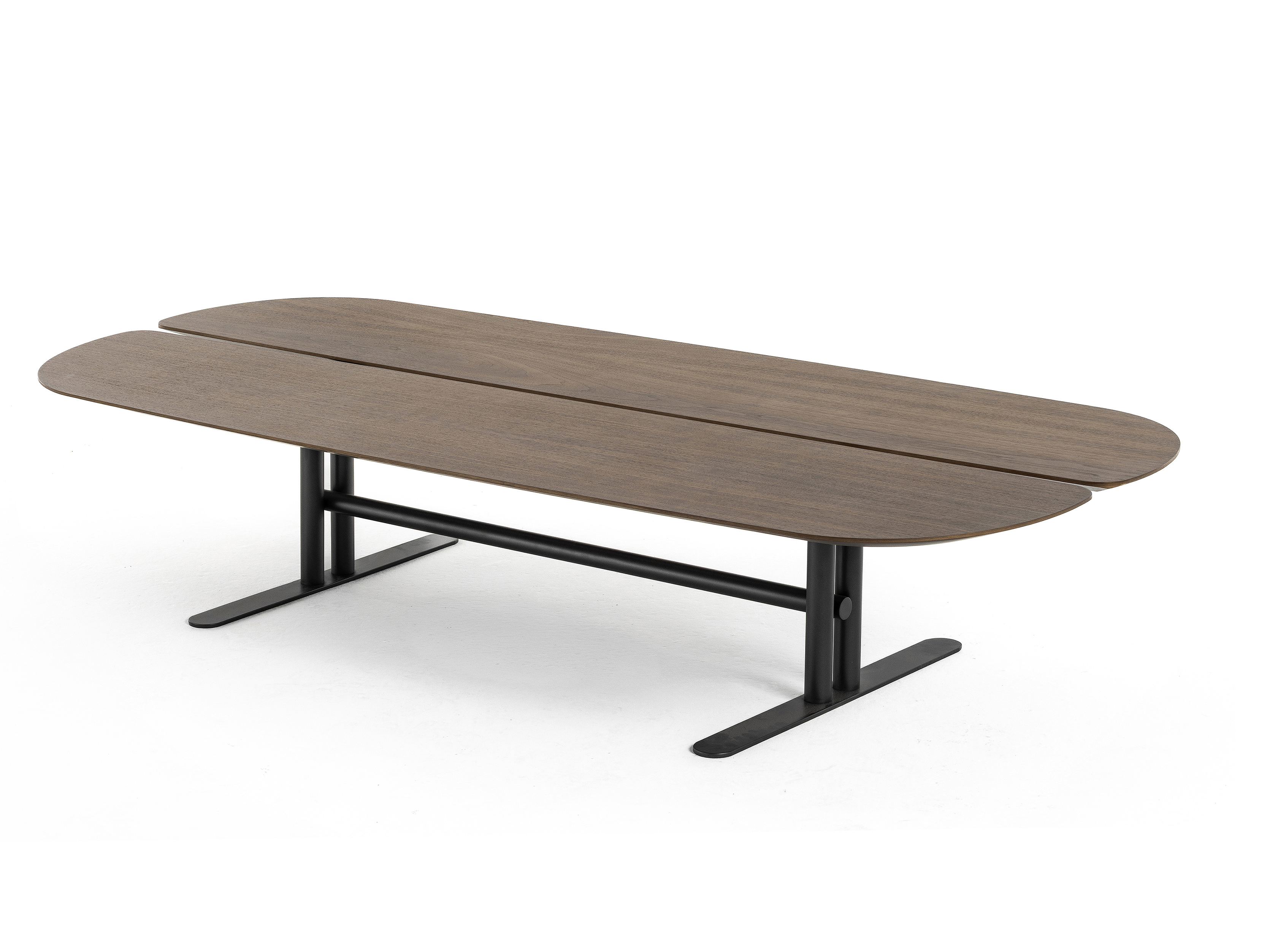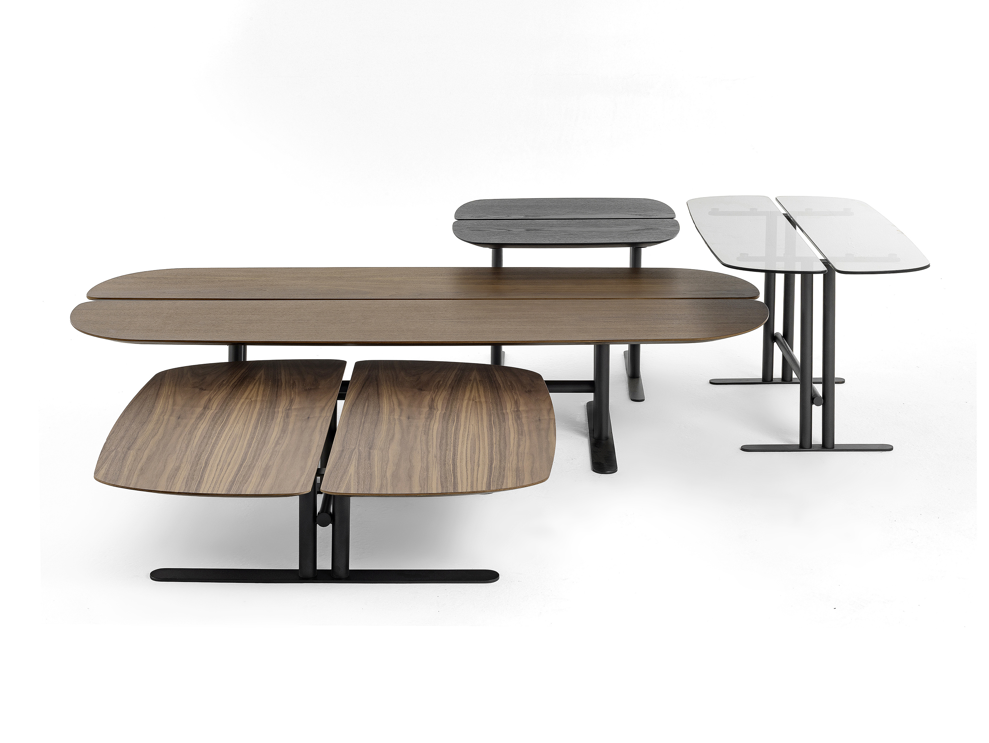 This bipartition also serves a compositional purpose. It allows the tables to be arranged in various ways, forming dynamic groupings that adapt to the scale and logic of the space in which they are placed. The same piece can stand alone or become part of a broader visual narrative, enabling the furniture to actively contribute to the spatial experience.