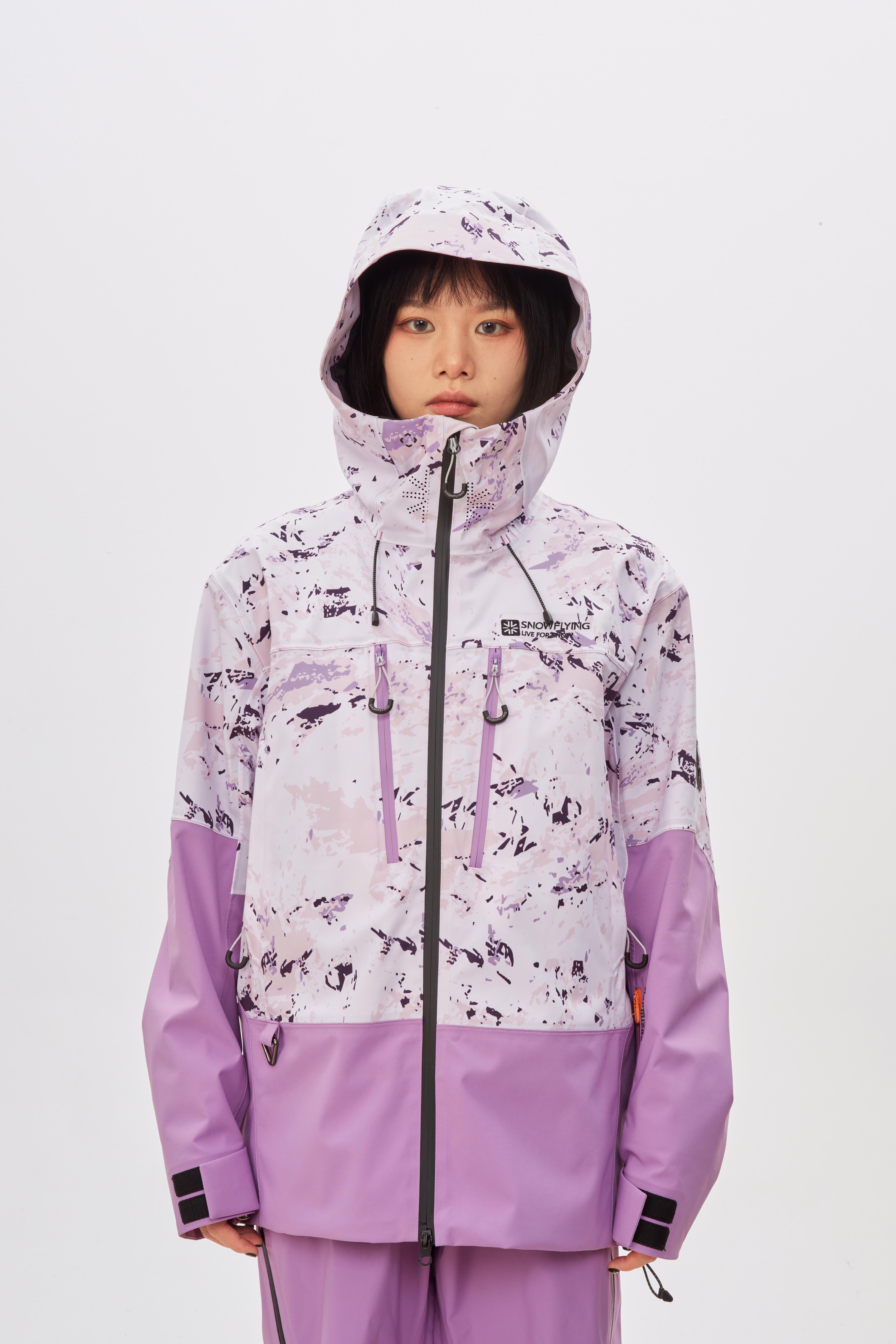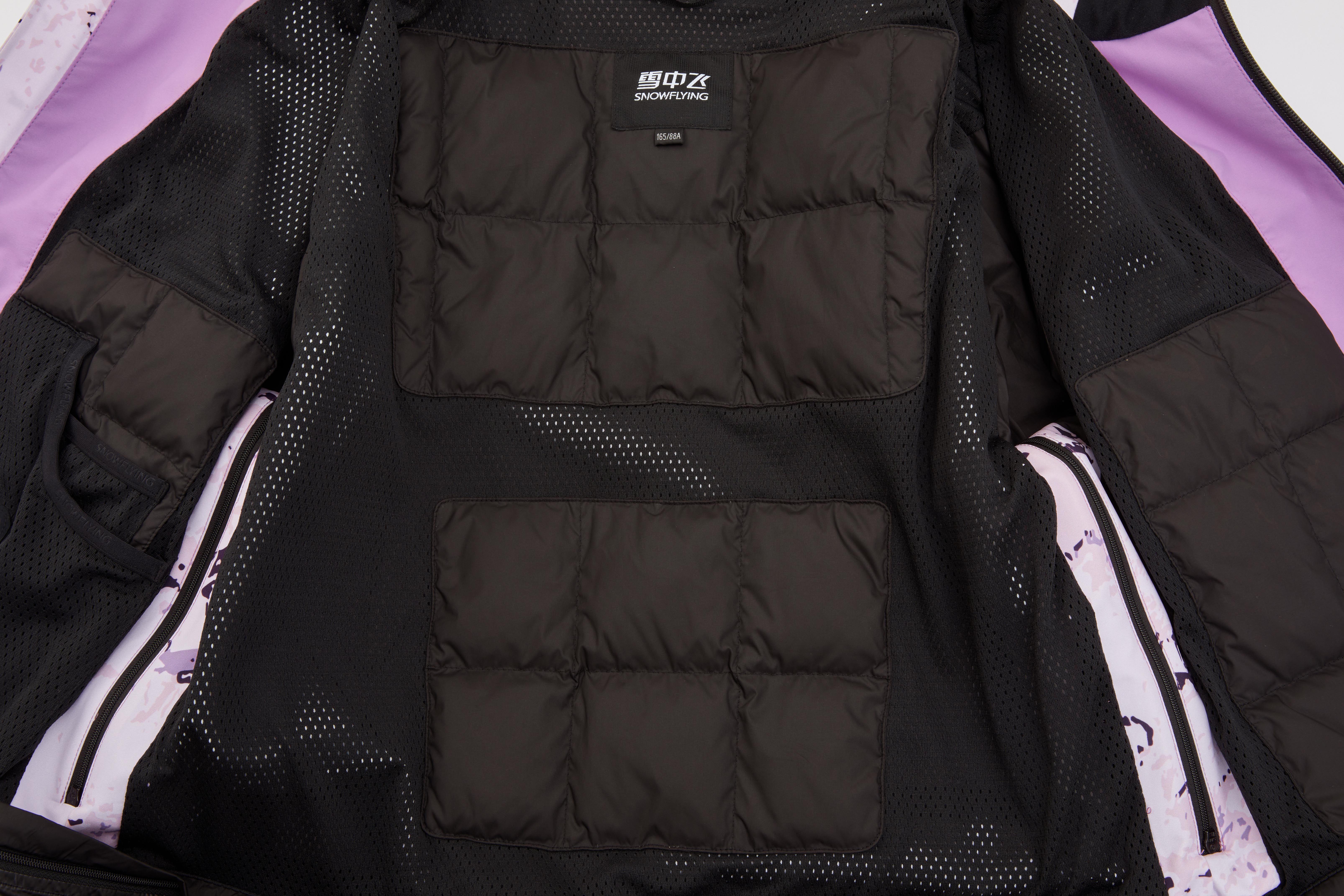 The Swift Arctic-Goose Down Shell features snow-peak patterns and aurora purple color-blocking, inspired by the natural textures of ice and snow. The snow-peak structure is integrated into the ski jacket’s print and overall design, creating a layered and visually striking appearance that remains highly visible in snowy environments for enhanced safety. Its three-dimensional tailored structure aligns precisely with skiing postures, providing ample movement space at key areas like shoulders, elbows, knees, and hips, reducing resistance and shaping a sleek, dynamic silhouette.