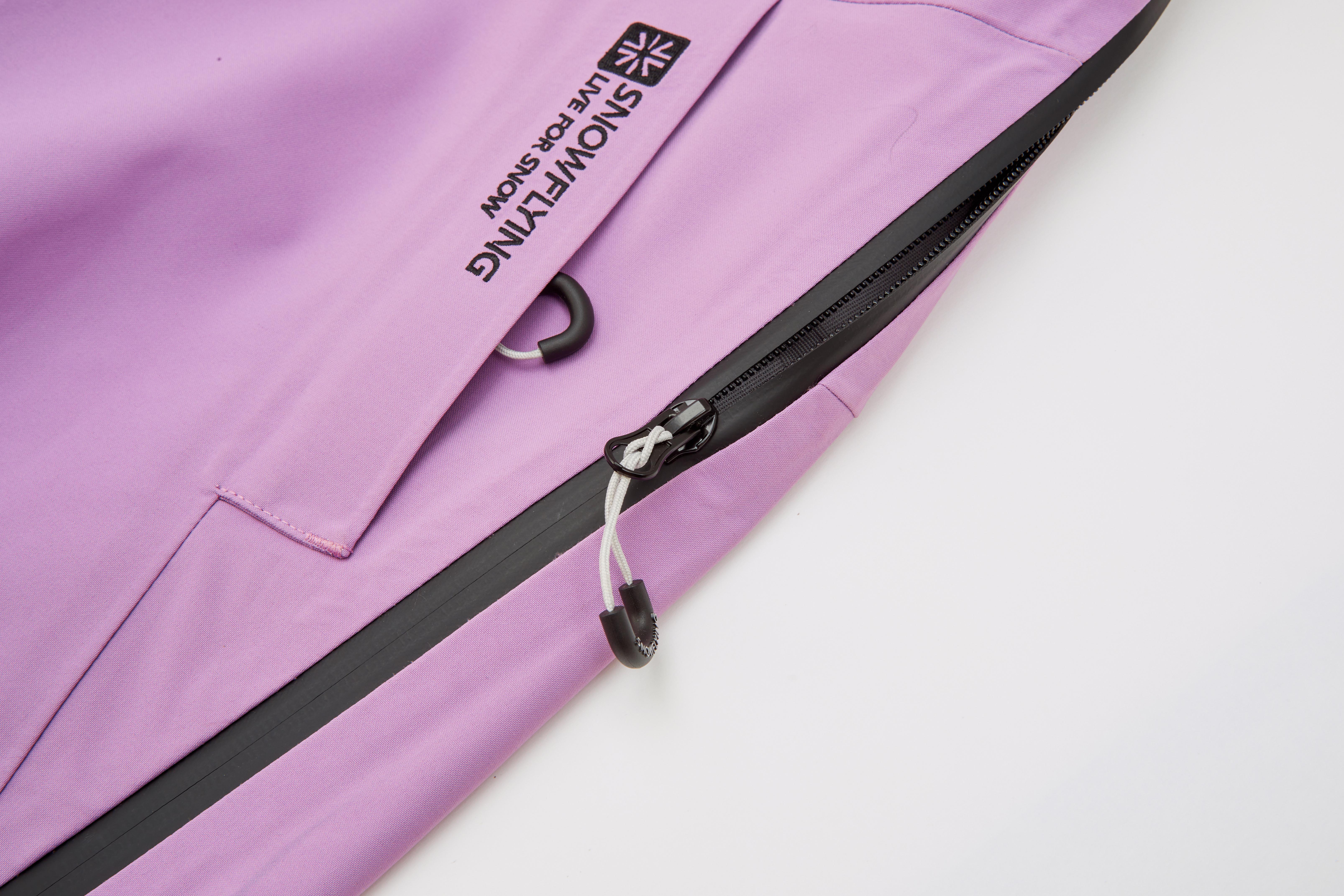 Large pull tabs and shaped adjustable Velcro tabs enable effortless single-handed operation while wearing ski gloves. The detachable snow skirt offers two tightness settings, blocking wind and snow while flexibly adapting to different climates and activity levels. A waterproof zipper pocket on the left sleeve provides quick access to passes, while external metal loops support convenient gear attachment. The lining offers well-organized pocket compartments, balancing ample storage with easy access to personal items.
