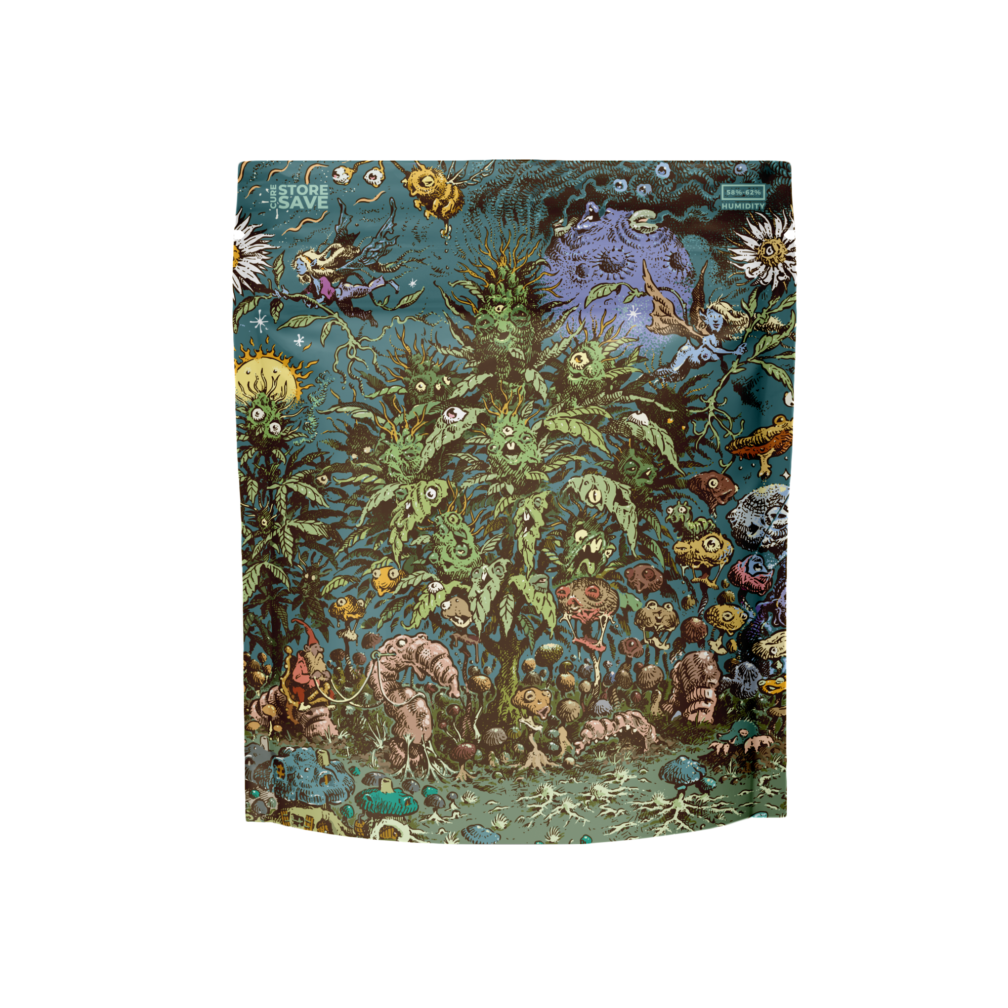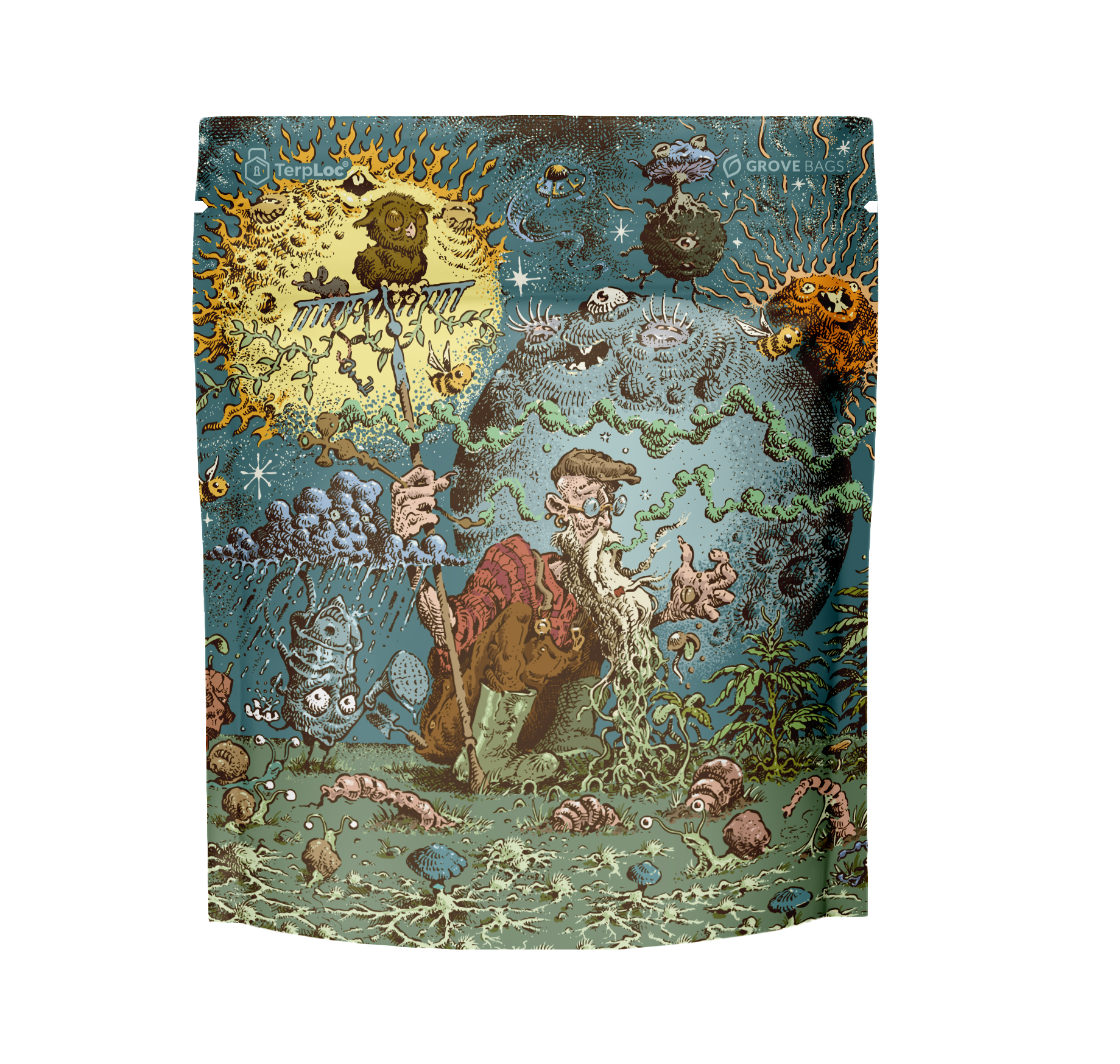 The biggest Grove Bags x Mossy Giant collaboration yet – a quarter pound flower pouch featuring an art piece titled ‘Living Soil’. As Mossy (Pieter van Tongeren) puts it: “Taking care of your soil is taking care of the planet. The hard, but thankful, journey a plant grower undertakes to create a habitat for all organisms and beneficial bacteria to thrive is challenging but honest work – the deep dark depths of your pots are teeming with life.” Thanks to Grove Bags’ Terploc technology, this auto-curing and storage bag will also be teeming with terpenes.
