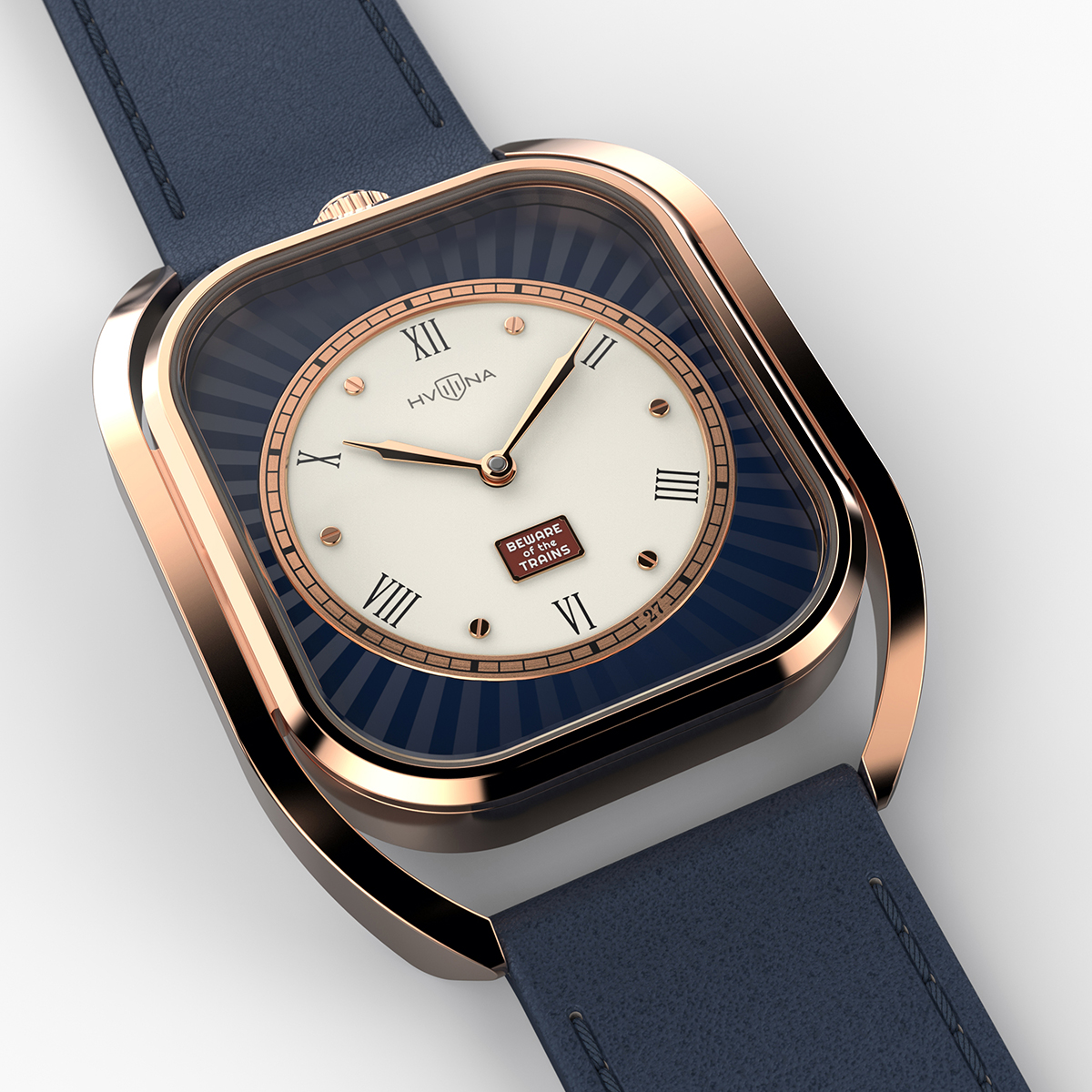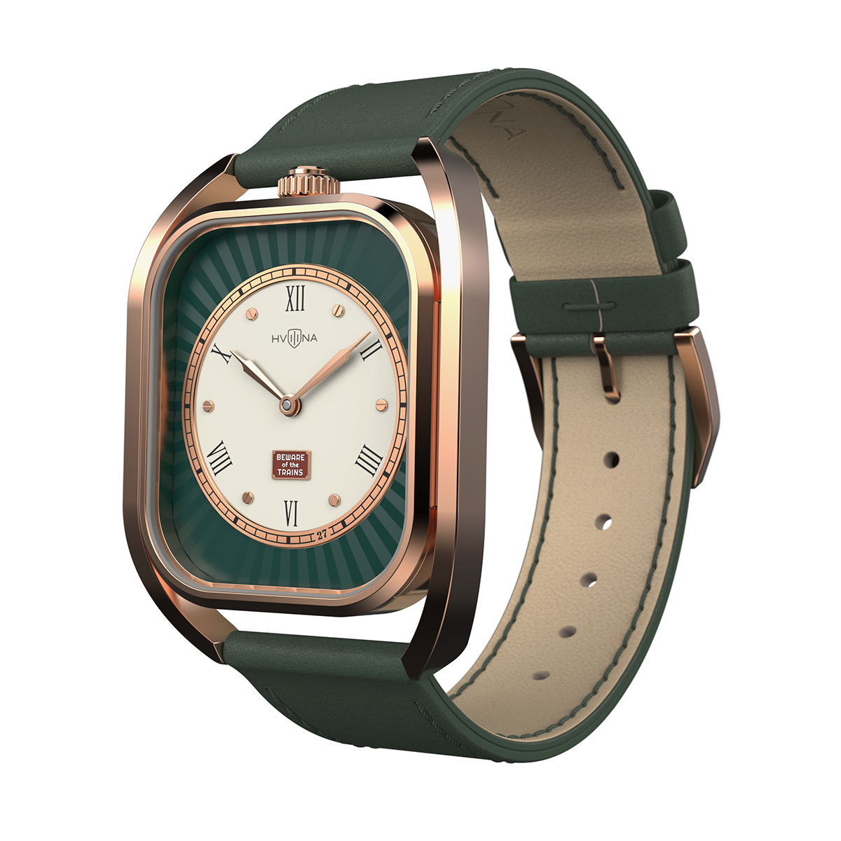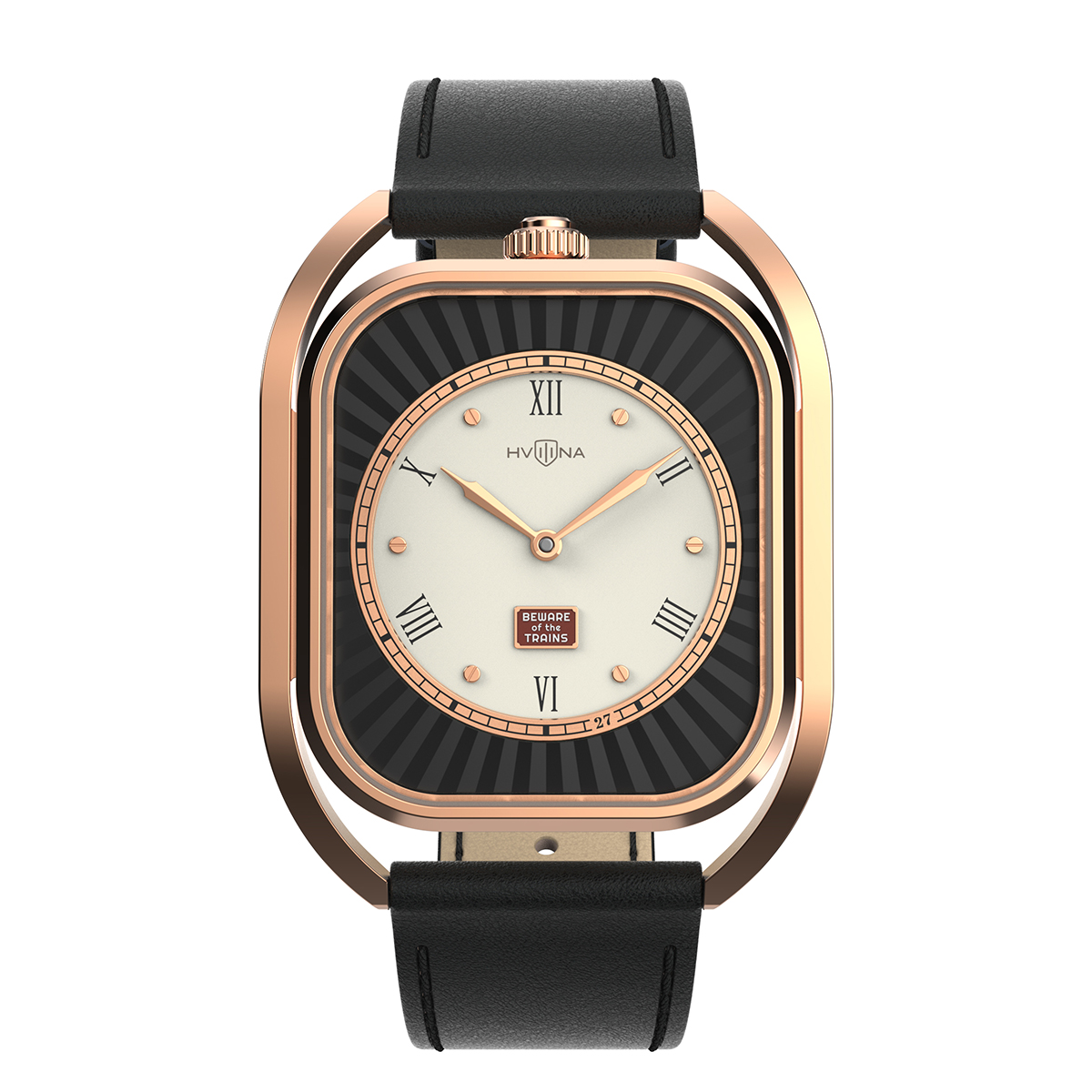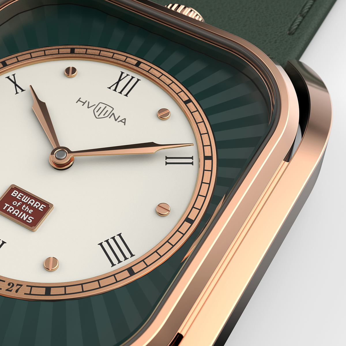 Adding to the concept is a small plaque reading “Beware of the trains”, echoing the style of historical British railway signs from the 19th–20th centuries. The mark at the 27-minute position symbolizes the speed of the first trains on the Liverpool-Manchester route — 27 km/h. The final touch is a set of Art Deco-inspired hands that perfectly complement the overall concept.