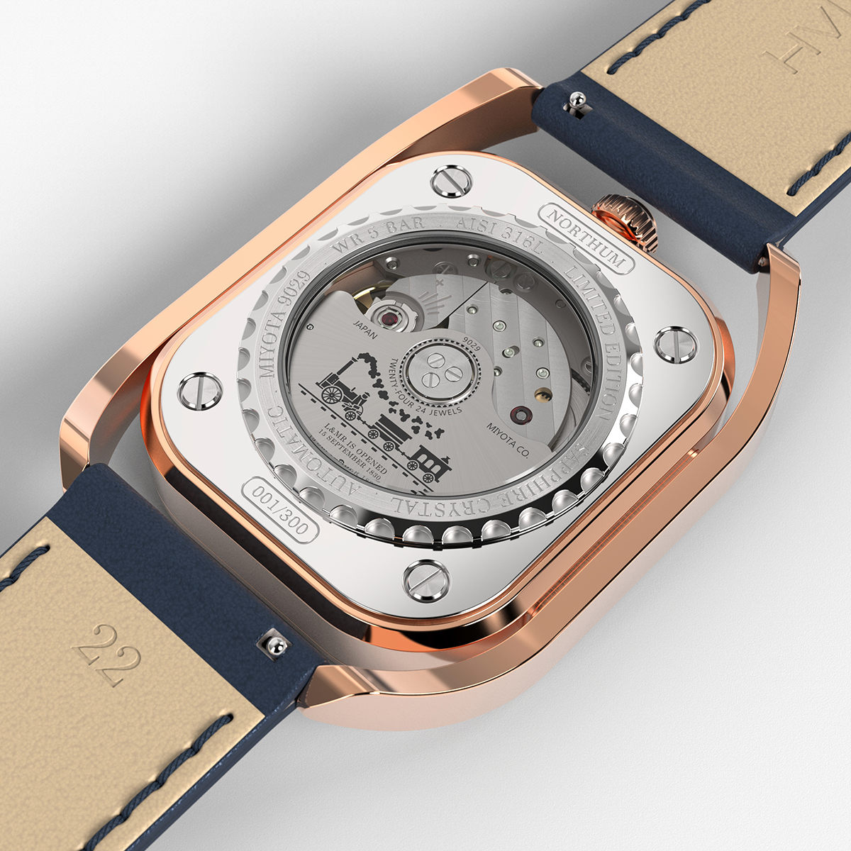 The watch case is made of stainless steel, the glass is sapphire, and the strap is genuine leather. The collection features four mechanical models, each named after a type of train that once ran on this railway: Rocket, Northum (from Northumbrian), Planet, and Lion. On the rotor of each model’s movement, there is an engraving of the corresponding train along with the date of the railway’s opening.