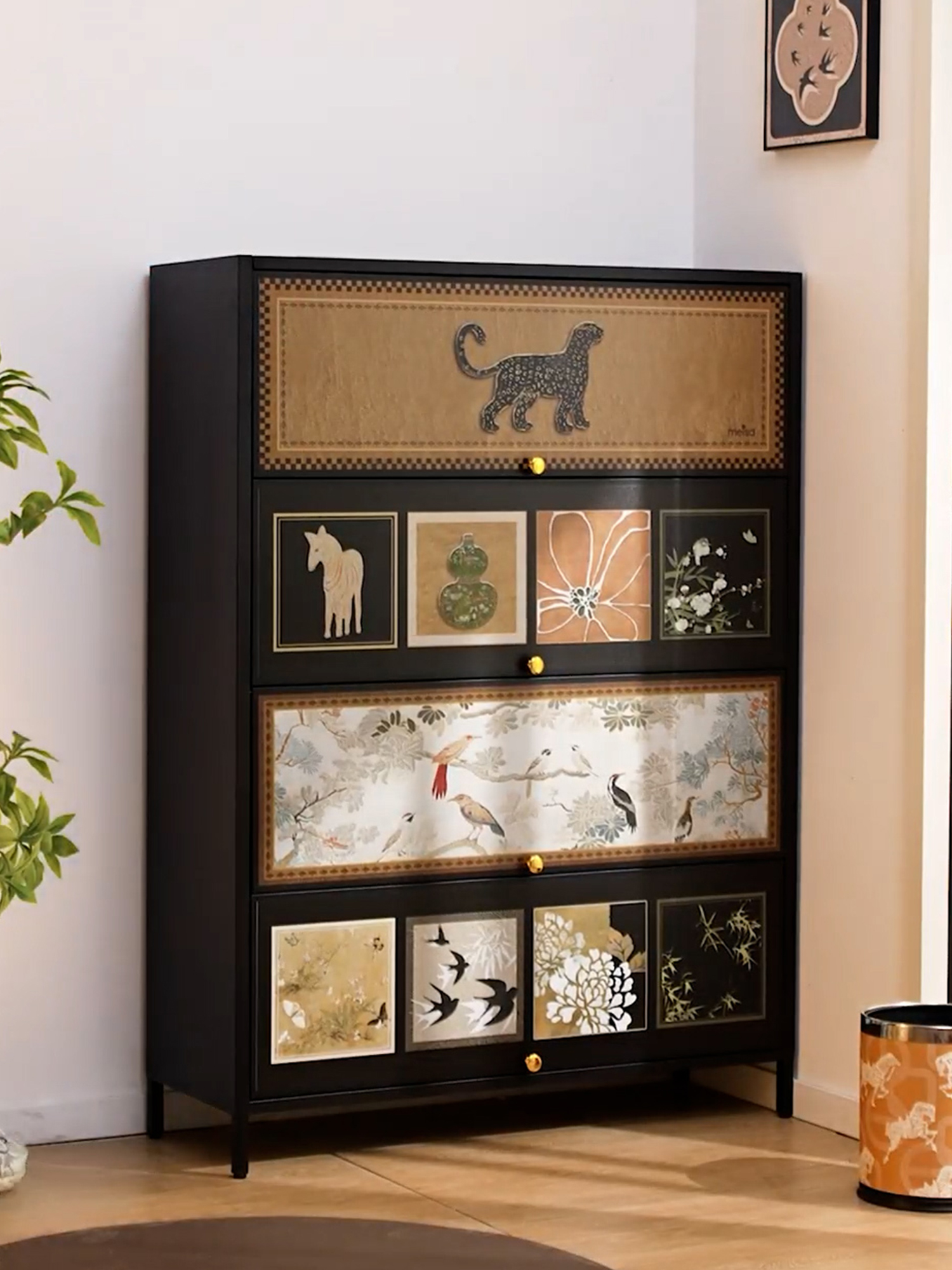 The cabinet exudes refined and understated elegance. Its front features exquisite illustrations inspired by classic Qing Dynasty paintings, artistically refined and restructured to form an arresting visual centerpiece. Embedded within these designs are motifs steeped in cultural significance: the leopard symbolizes protection and good fortune; the horse represents ambition and progress; the gourd signifies prosperity and blessings; blooming flowers denote harmony and fulfillment; and scenes of birds among flowers evoke the serenity of nature. Together, these elements create a harmonious atmosphere of auspicious abundance. The overall composition balances fullness and space, creating distinct layers and visual depth while conveying a strong sense of cultural richness and refined taste. Constructed with a dark wood frame complemented by metal handles, the piece radiates composed and exquisite elegance. The color scheme embraces vintage aesthetics, dominated by black and brown tones, accented with creamy white, and enriched with other traditional hues. This carefully selected palette skillfully blends the profundity of traditional aesthetics with modern living, resulting in a style that is both sophisticated and vibrant.