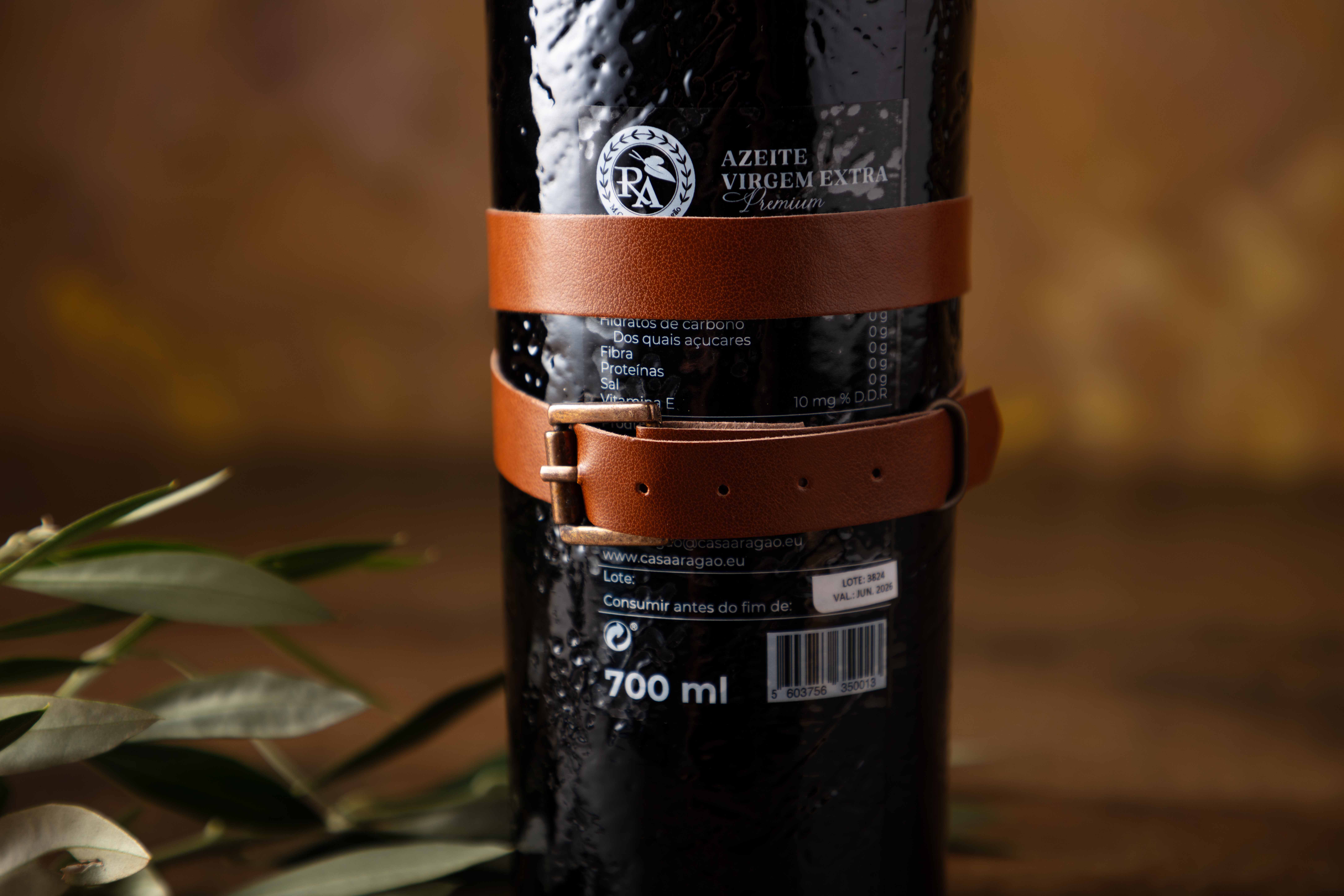Elements of tradition have been carefully reinterpreted in the packaging. The leather “bandoleras” that cross the Caretos' torsos have been reproduced with maximum functional precision, elegantly wrapping around the bottle. The leather is engraved with the client's brand, “Casa Aragão,” as well as the name “Caretos de Podence.”