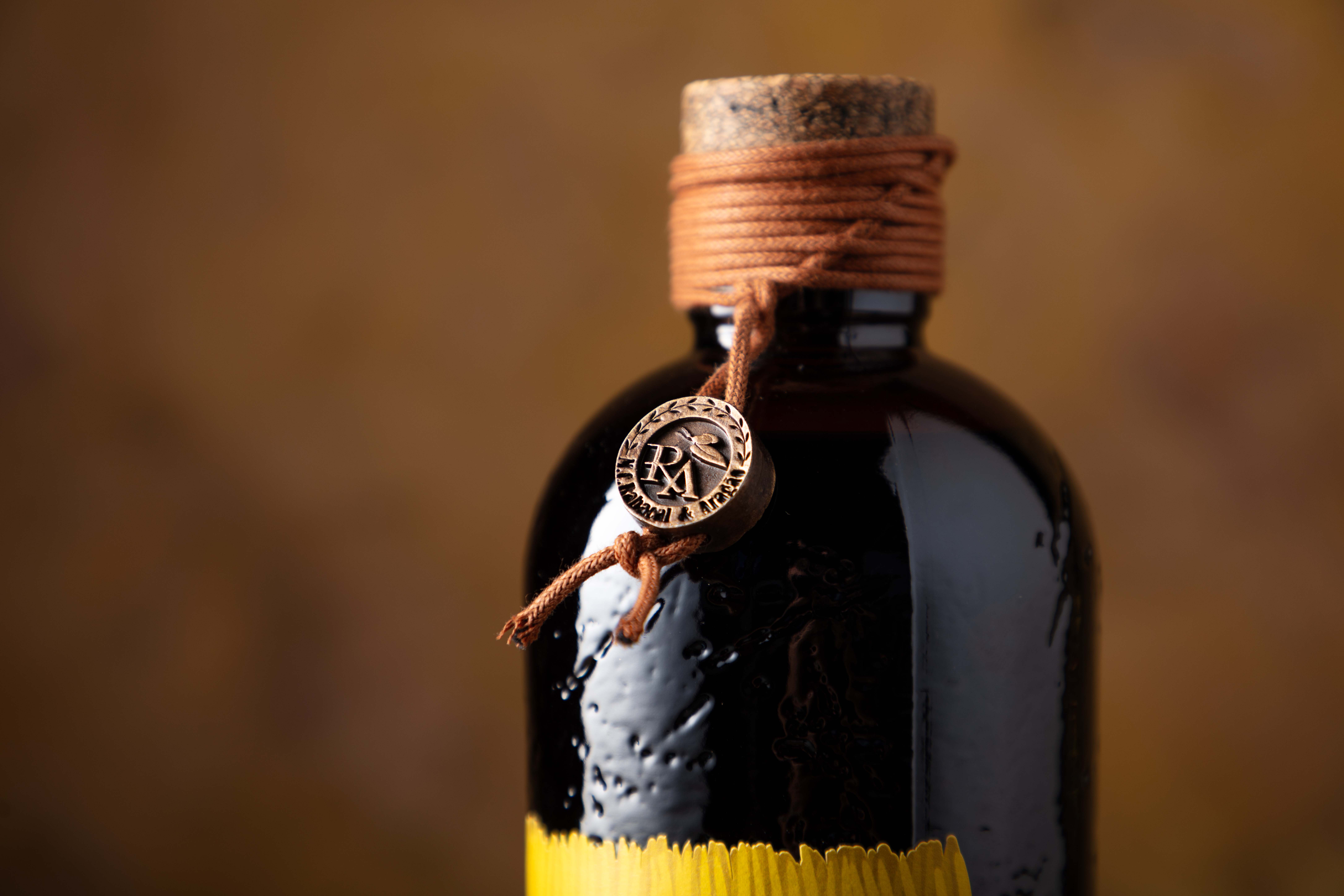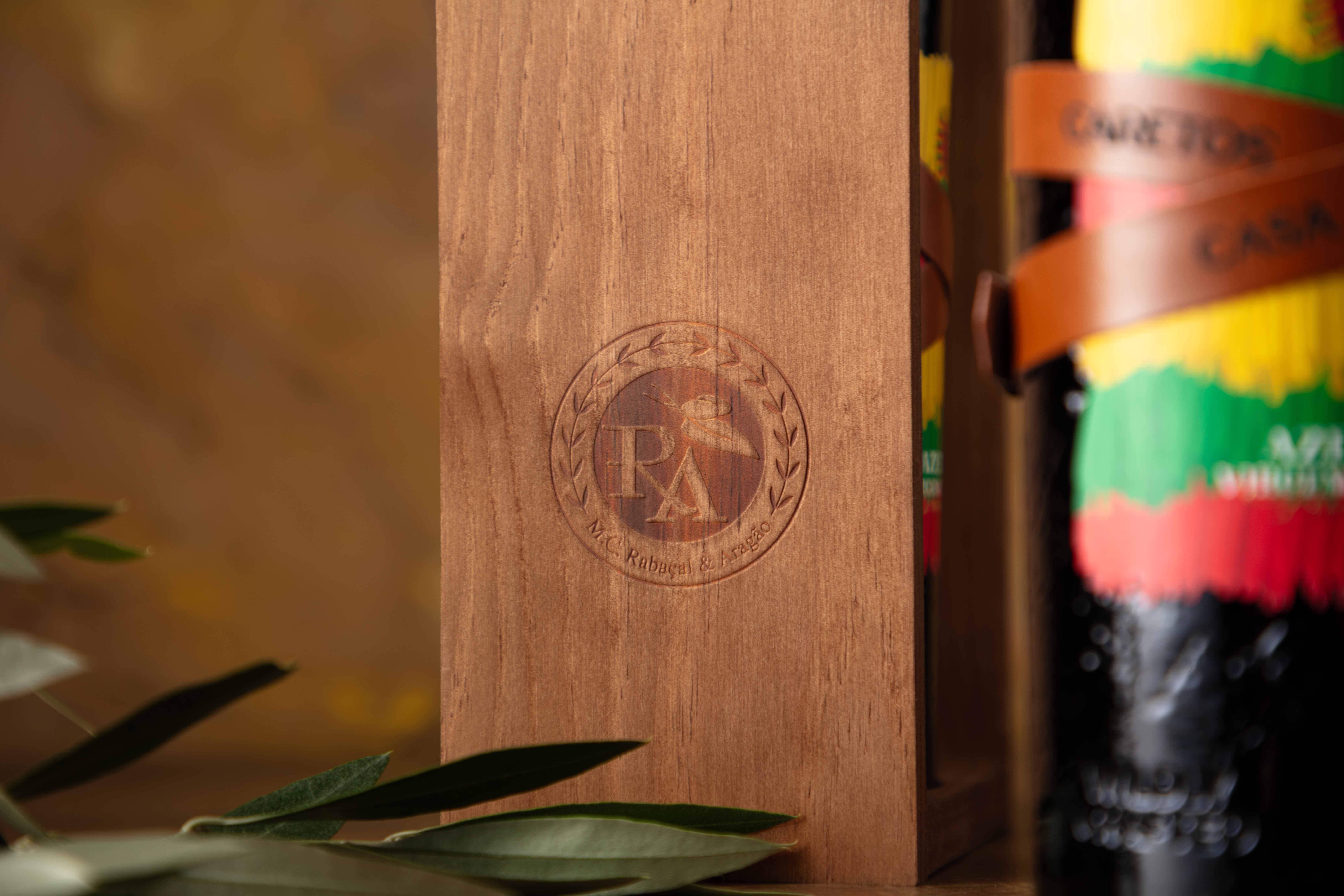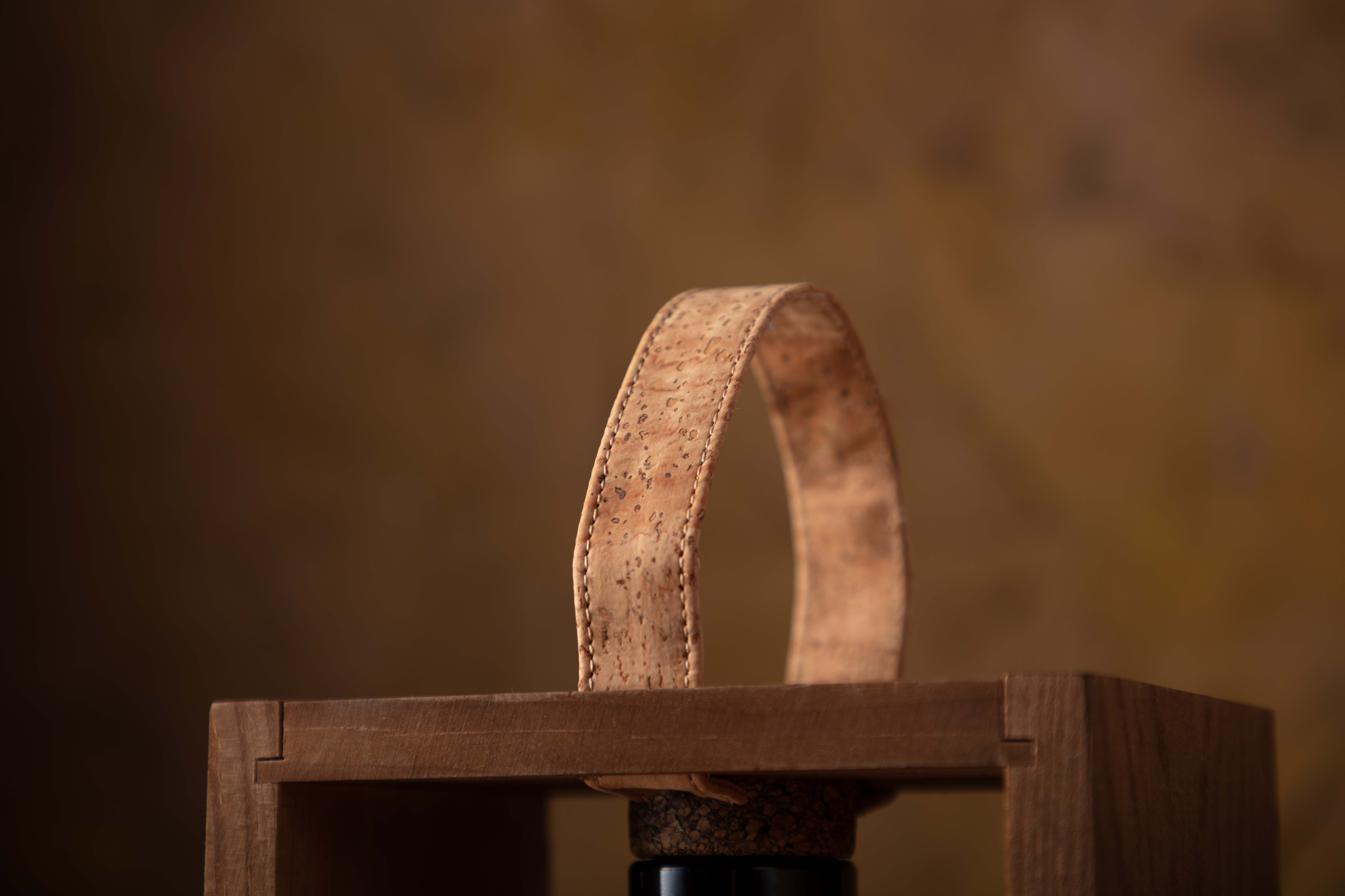 At the top of the bottle, a special recycled cork was chosen, complemented by a technical metal piece with the customer's brand engraved on it, secured by a leather cord. The wooden box includes a personalized cork handle, functioning both as a transport box and a counter display.