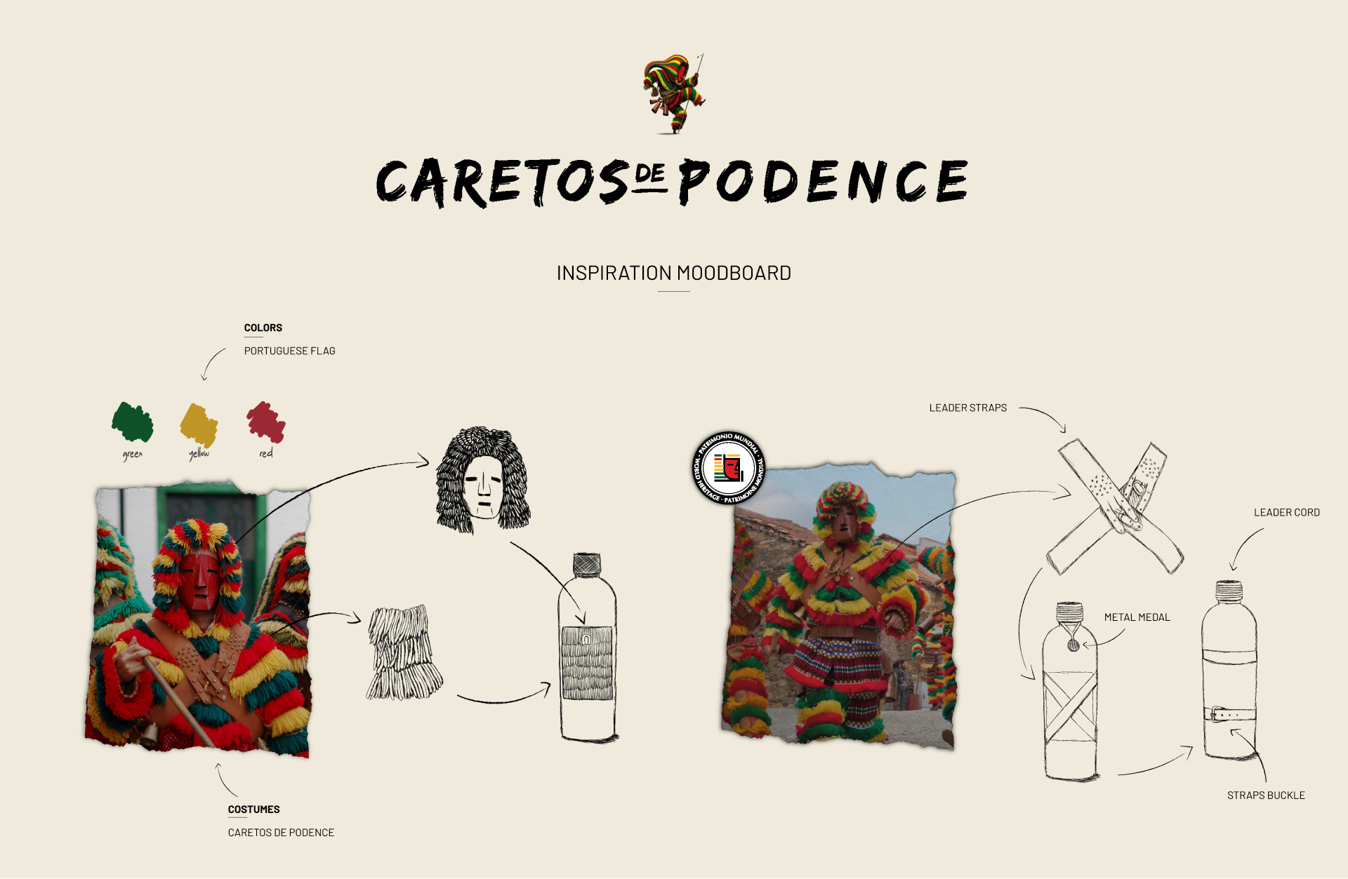 The design is inspired by the costumes of the “Caretos de Podence”, protagonists of the “Entrudo Chocalheiro” festivities, a tradition of a small Portuguese village, classified as Intangible Cultural Heritage of Humanity by UNESCO. These costumes are characterized by hand-dyed sheep wool fringes, arranged in rows, and inspired by the patterns of homemade quilts typical of Trás-os-Montes. The colors yellow, green, and red refer to the Portuguese national flag, establishing a direct link with cultural identity.