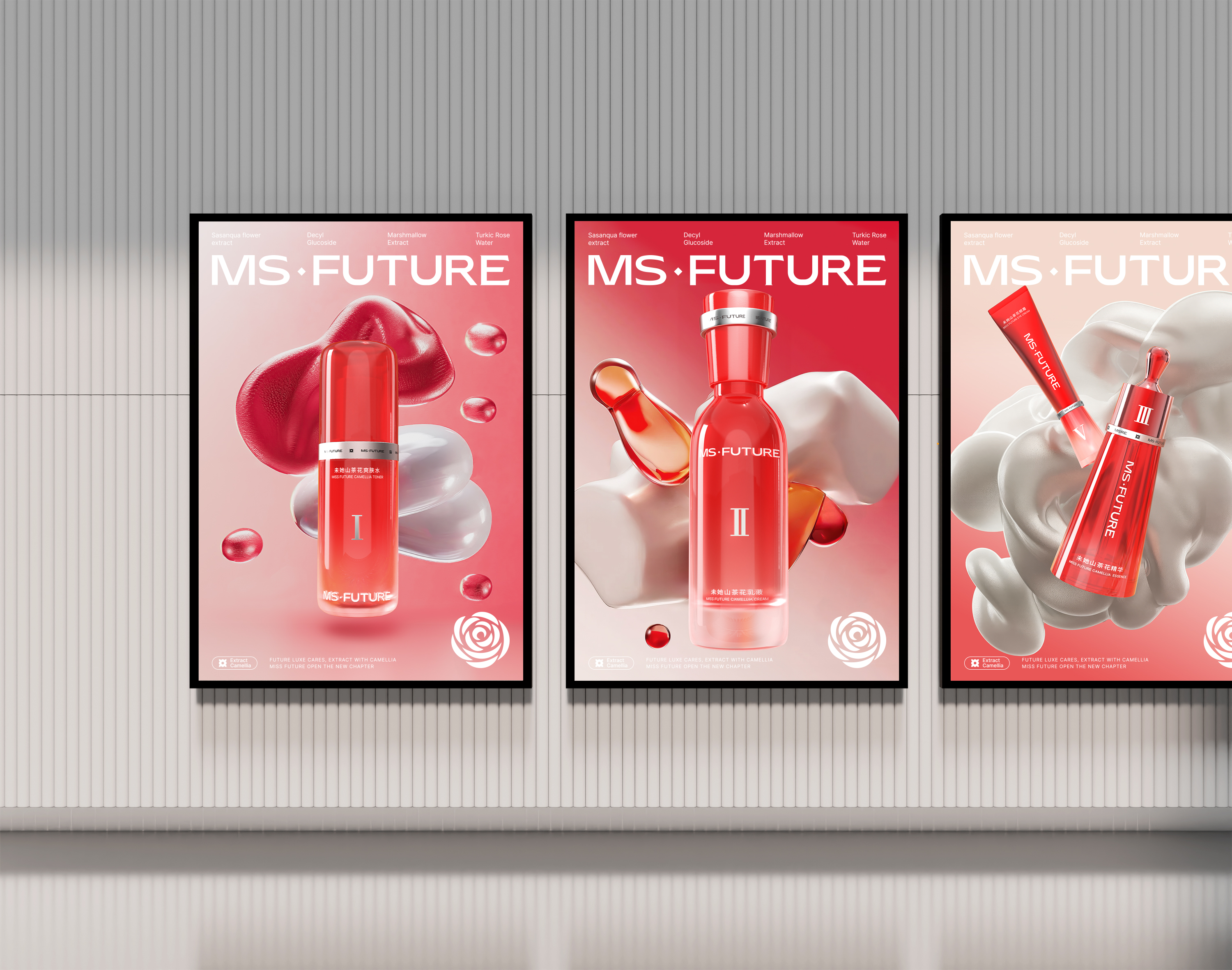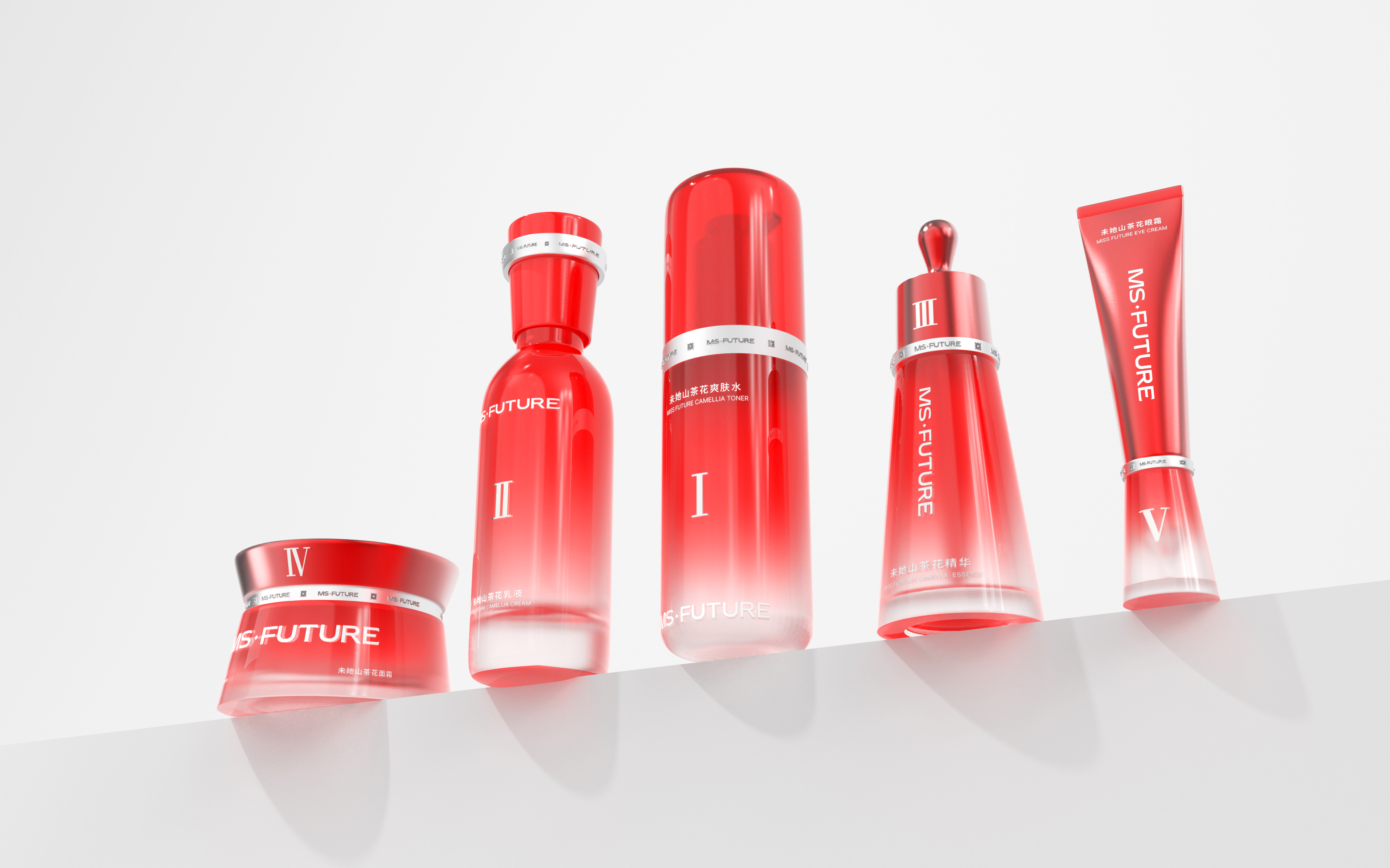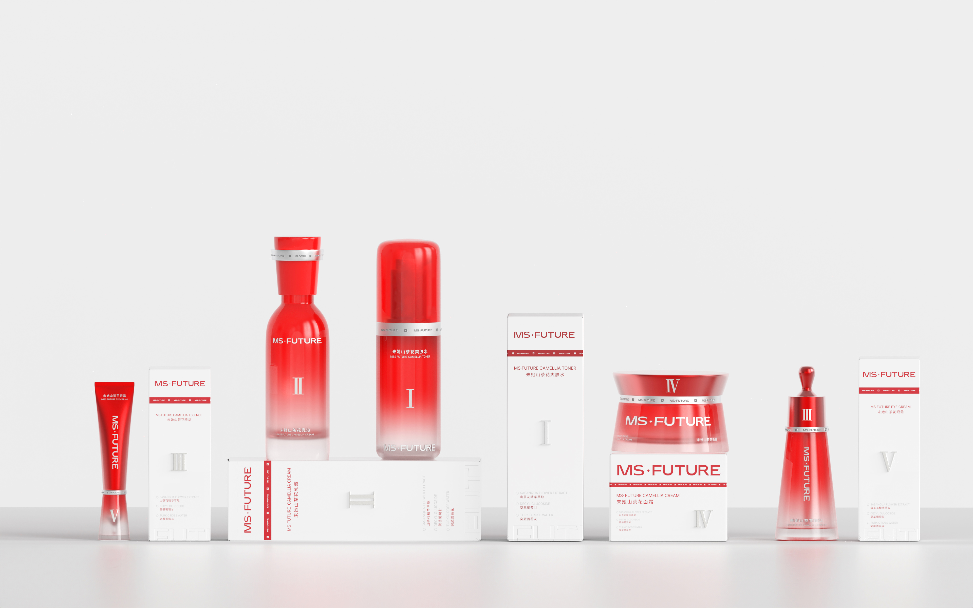 The design draws inspiration from the brand’s core natural camellia extract, using camellia’s vibrant red to show passion, energy, and restorative power. The red color highlights its botanical source and also represents the brand’s philosophy of drawing pure restorative power from nature, making each unboxing feel like a gentle touch of nature. Pure white is incorporated to balance the intensity of red, creating a soothing and harmonious visual effect while reinforcing a sense of technological sophistication. The bottles and tubes feature a red-to-transparent gradient, symbolizing the gradual penetration and restorative effect of the skincare ingredients. Silver-plated strips add a futuristic touch and visually echo the red strips on the outer box, symbolizing the flow of restorative power from one step of the routine to the next like an energy ring. The bottles and tubes are shaped in simple geometric forms—cylindrical or triangular—ensuring consistency across the series while conveying a stable and reliable product identity.