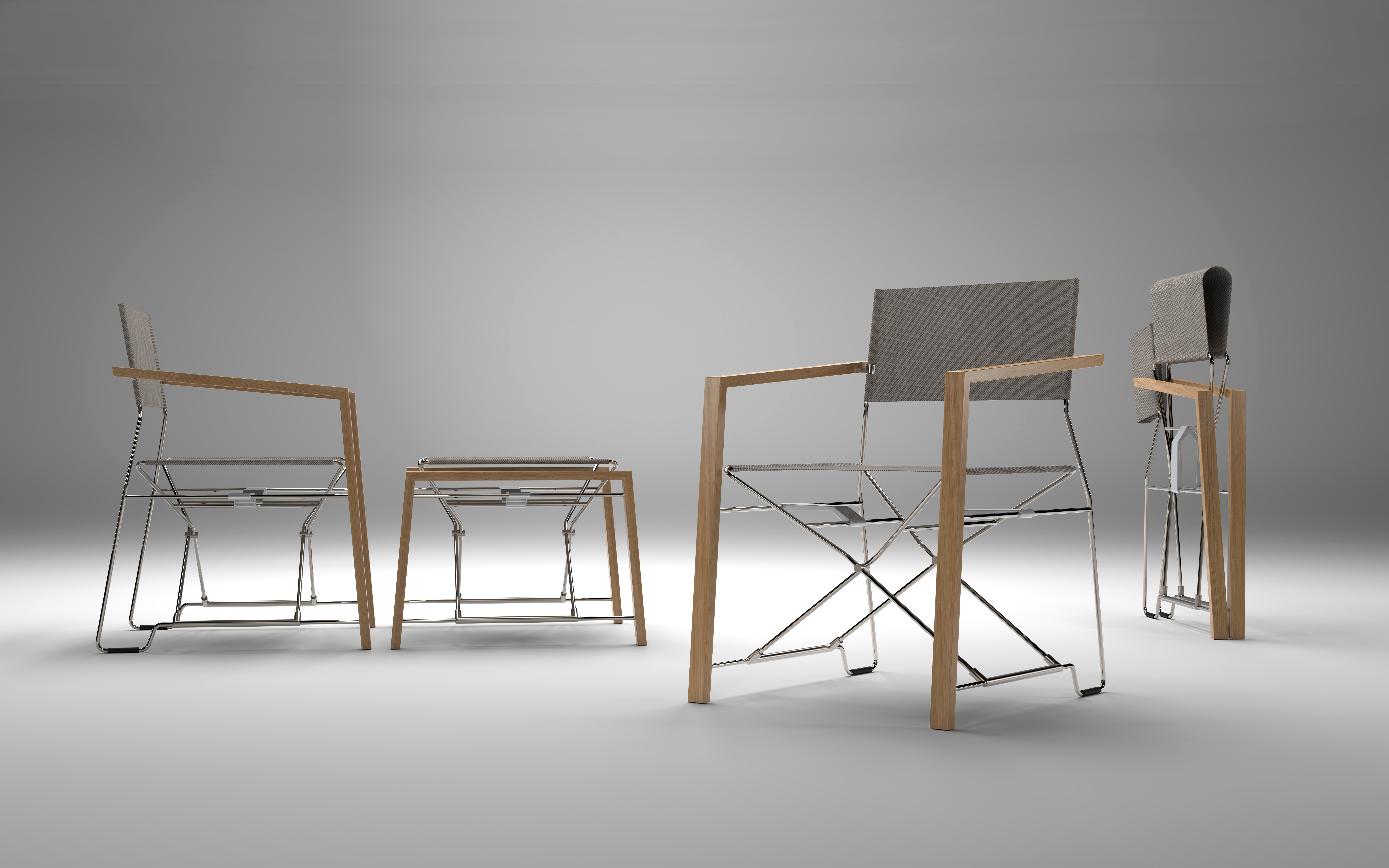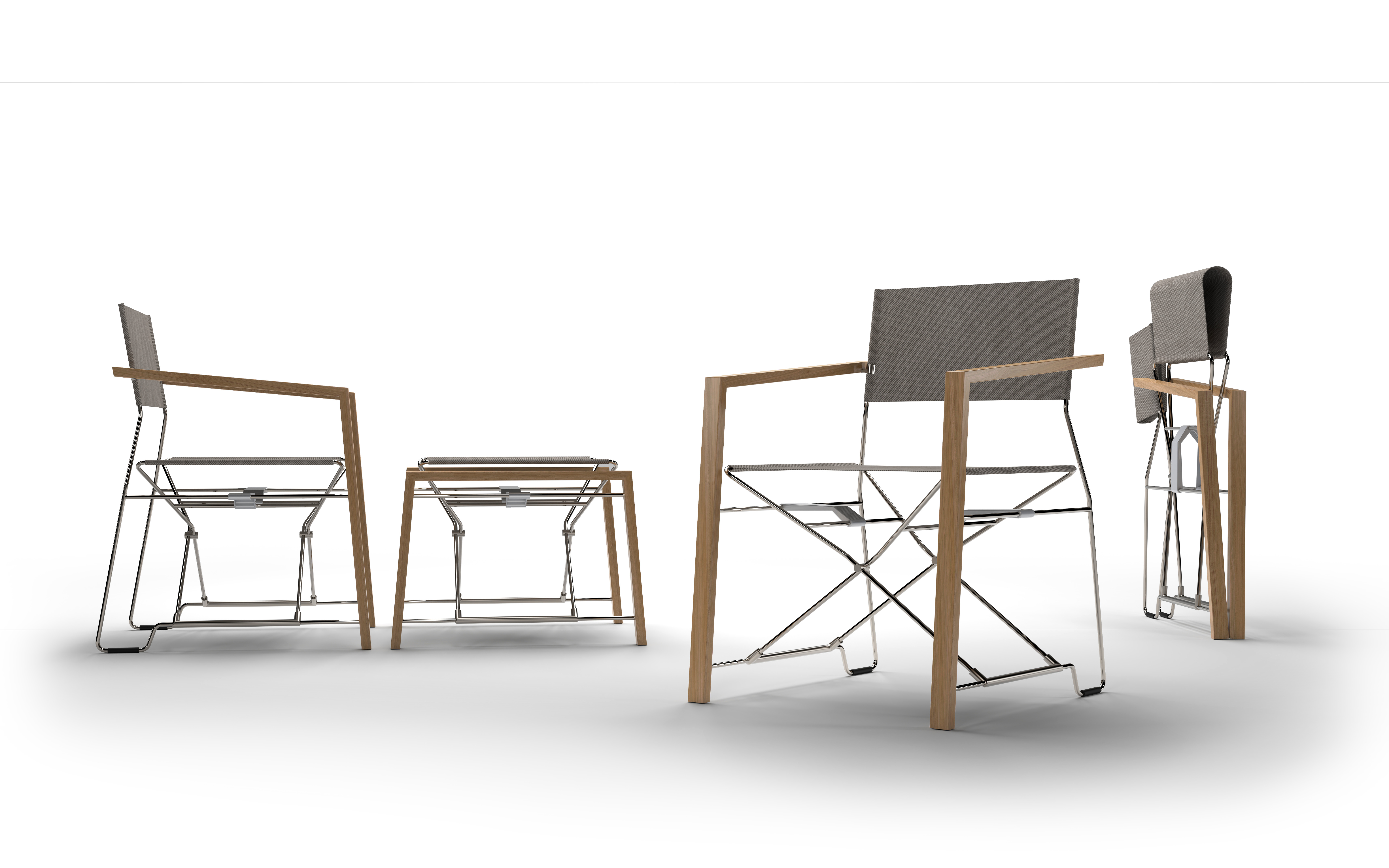 The titanium folding mechanism utilizes classic director's chair X-geometry with a proven over-center locking design, allowing the chair to fold to under 6 inches. Canvas seat and back stretch taut when deployed, creating the iconic director's chair silhouette with contemporary refinement. A matching side table extends the system, serving as an ottoman, stool, or side table as needed.
