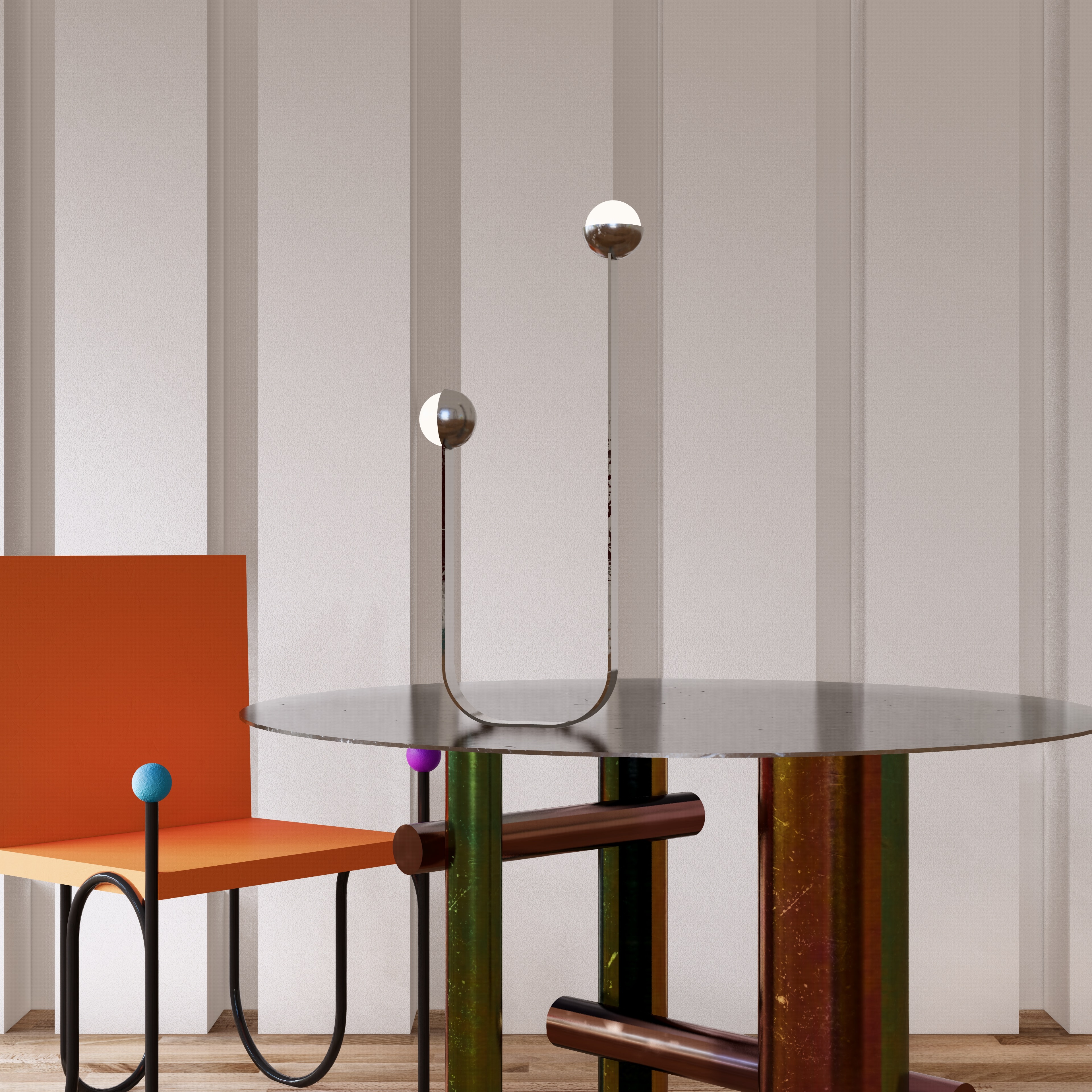 The table is made of rainbow zinc steel, a new material with a colorful sheen, whose unique color reflection effect seems to bring the energy of neon into the static furniture, creating a visual impact that resonates with emotion. The design of the chair combines geometric forms with a variety of colors, creating a perfect balance of futuristic and artistic through clean and smooth lines.