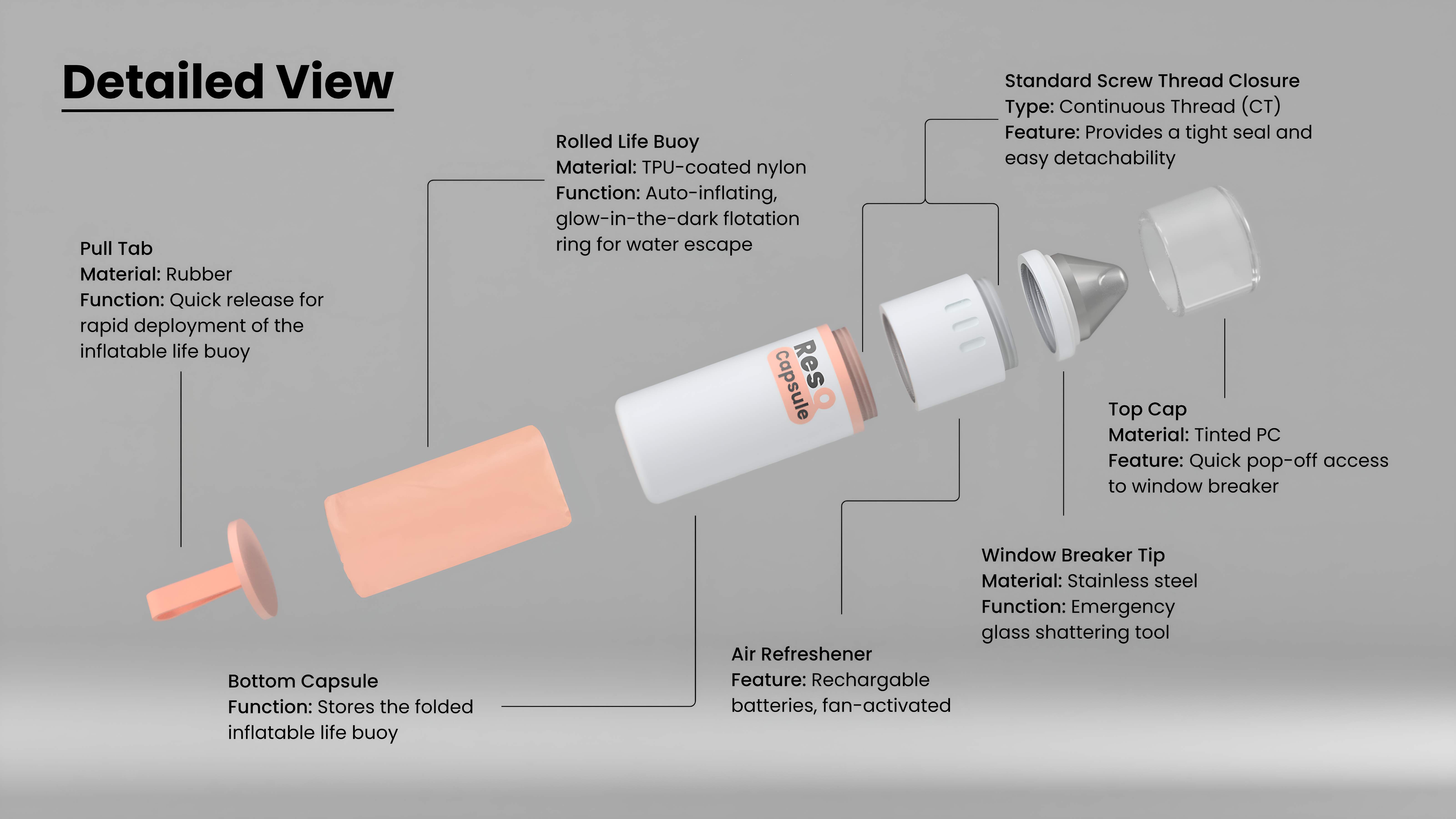 The device features three detachable sections: a high-strength window breaker made of stainless steel lies beneath a translucent white safety cap, a rechargeable air freshener for everyday use, and a tightly rolled, auto-inflating life buoy stored at the base.