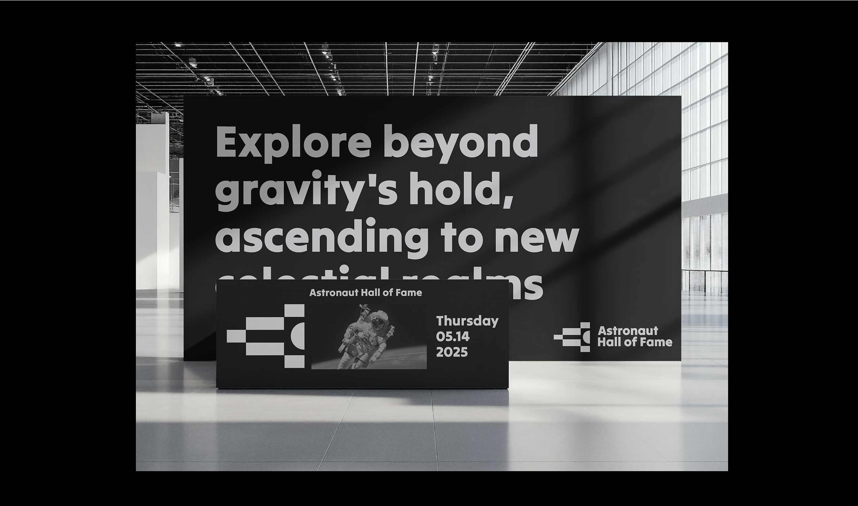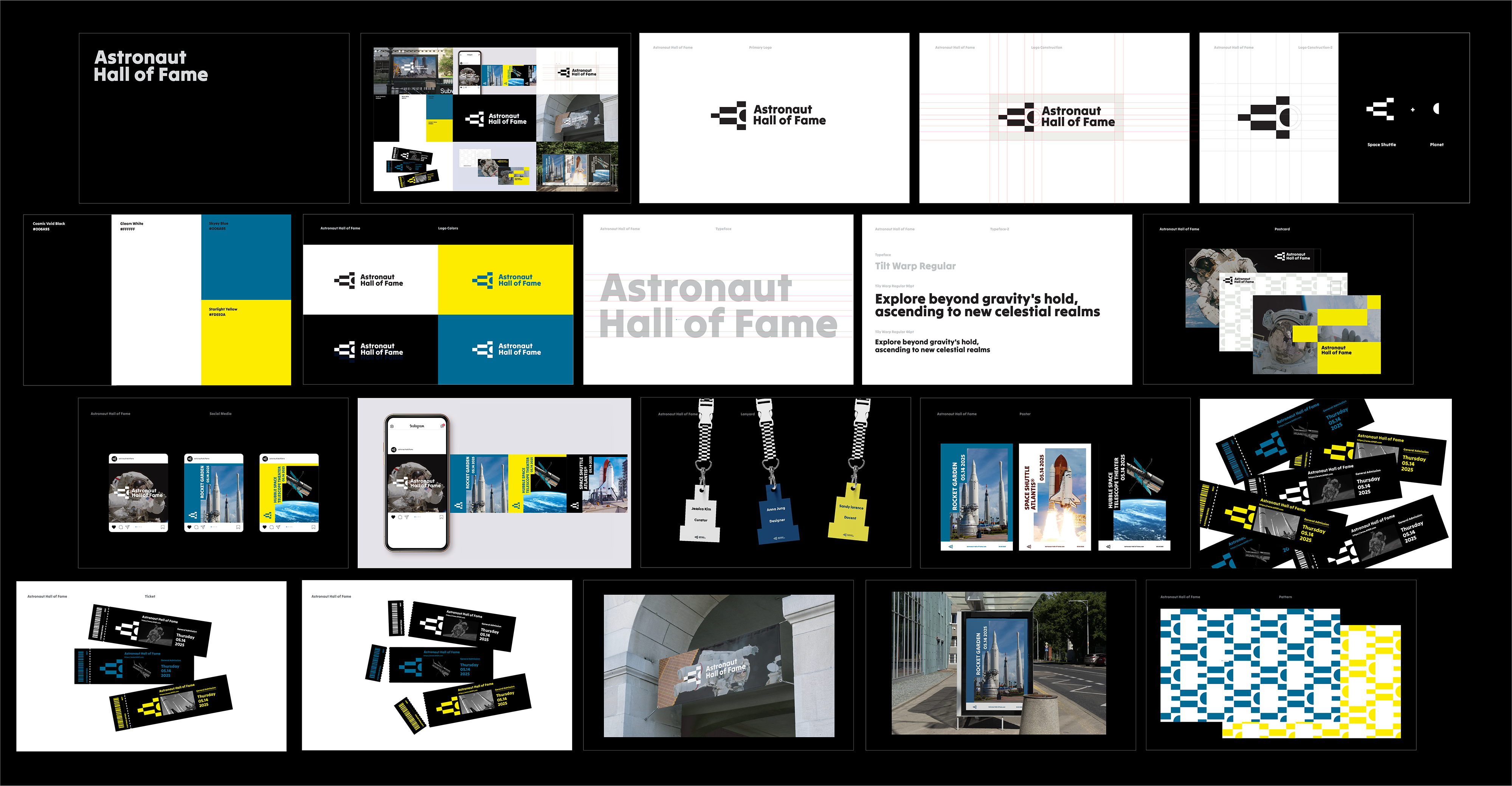 The Astronaut Hall of Fame logo depicts a spaceship departing from a planet, designed with smooth curves that reflect NASA’s dynamic movement, innovation, and futuristic vision. It symbolizes the endless curiosity and research of scientists and engineers, as well as humanity’s pursuit of technological advancement and exploration of the boundless universe. As a result, the brand identity is built around the logo’s dynamic, distinctive shapes, which are consistently applied throughout the system to create an engaging and cohesive experience for viewers.