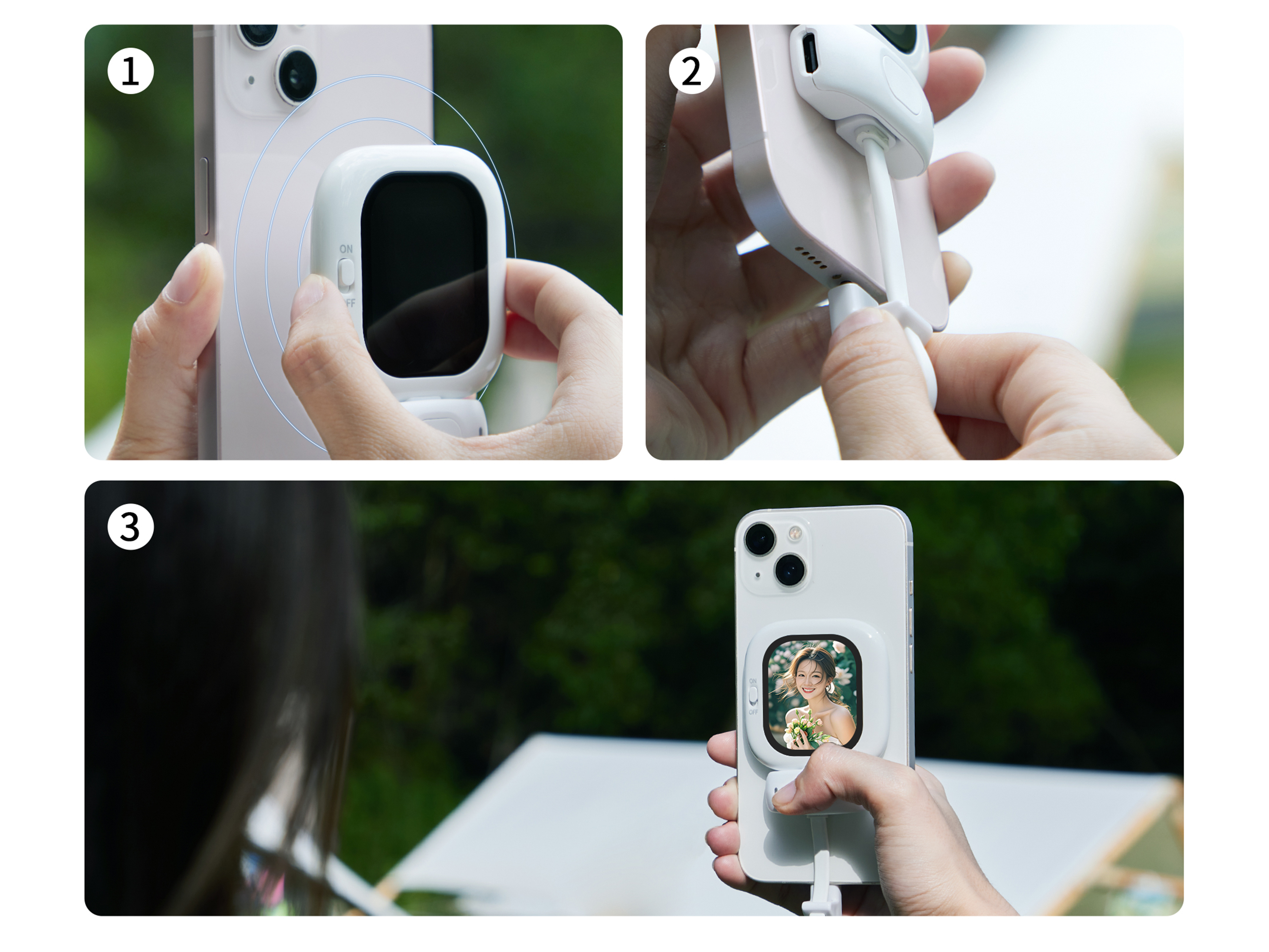 Innovatively, Founist vlogmate mini allows users to take high-quality selfies using the iPhone’s rear-facing camera system, while retaining all native camera functions. Thanks to its magnetic design, the product can securely adhere to the back of the iPhone, facilitating quick, convenient operation; at the same time, it supports wired connection, fundamentally ensuring seamless image synchronization—addressing common wireless issues like latency and interruption. Founist vlogmate mini also boasts a compact size (58×58×7.7 mm) and a light weight (about 50 g), offering exceptional portability. Moreover, it eliminates the demand for built-in batteries by drawing minimal power (0.6 W) directly from the iPhone, and can be simultaneously used with a magnetic power bank for continuous, uninterrupted operation. This product empowers users to fully leverage the outstanding imaging capabilities of the rear-facing camera system when taking selfies, enabling precise composition and dynamic focusing. As a result, it elevates every aspect of mobile photography—including pixel quality, image fidelity, video formatting, and creative flexibility—pushing the boundaries of professional mobile content creation.
