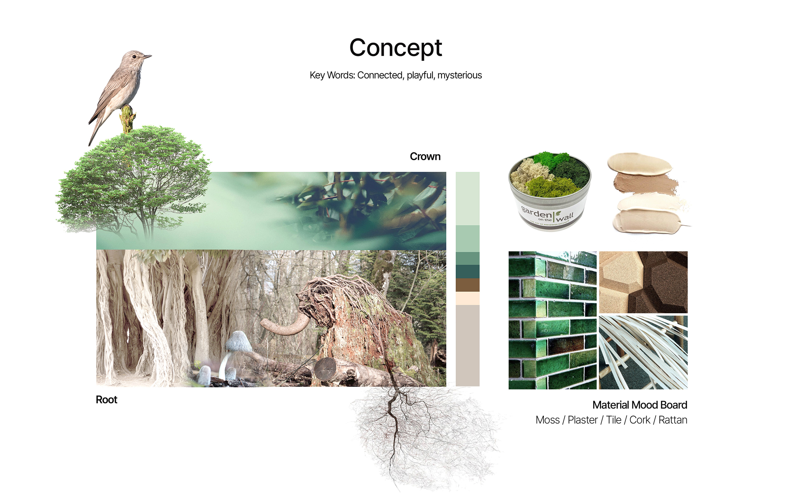 The palette echoes the Earth — lime-washed floors, muted browns, soft moss greens, and traces of amber light that shimmer like life beneath the soil. The store glows with the warmth of a root system — humble yet alive, grounding yet luminous.
