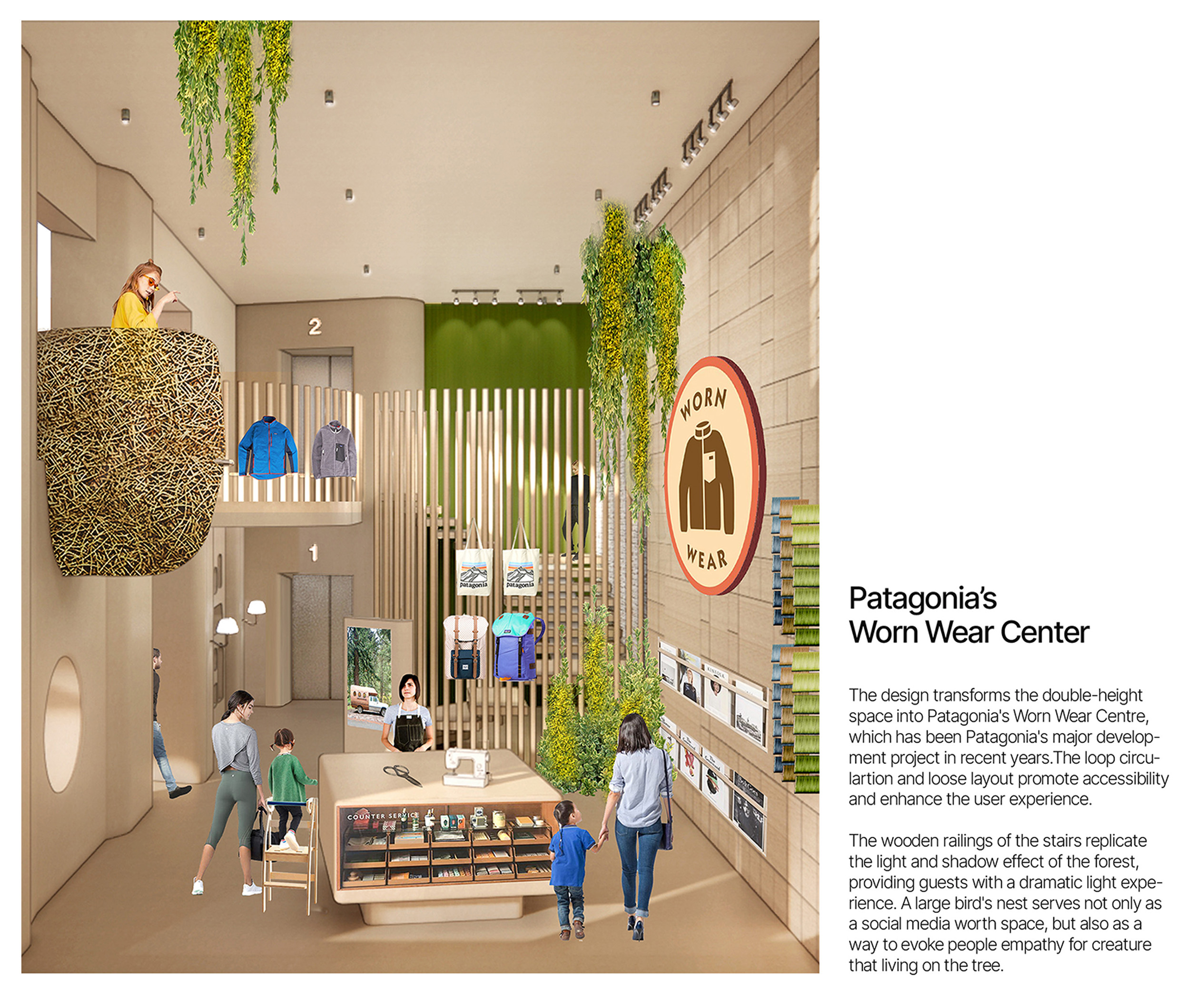 This space is more than retail; it is a story of reconnection. Inspired by the hidden world beneath the forest floor, the design unfolds like an underground family network — roots, fungi, and soil weaving silent conversations of care and coexistence. Here, every beam and surface speaks to Patagonia’s ethos: respect for the Earth, and reverence for the quiet systems that sustain it.