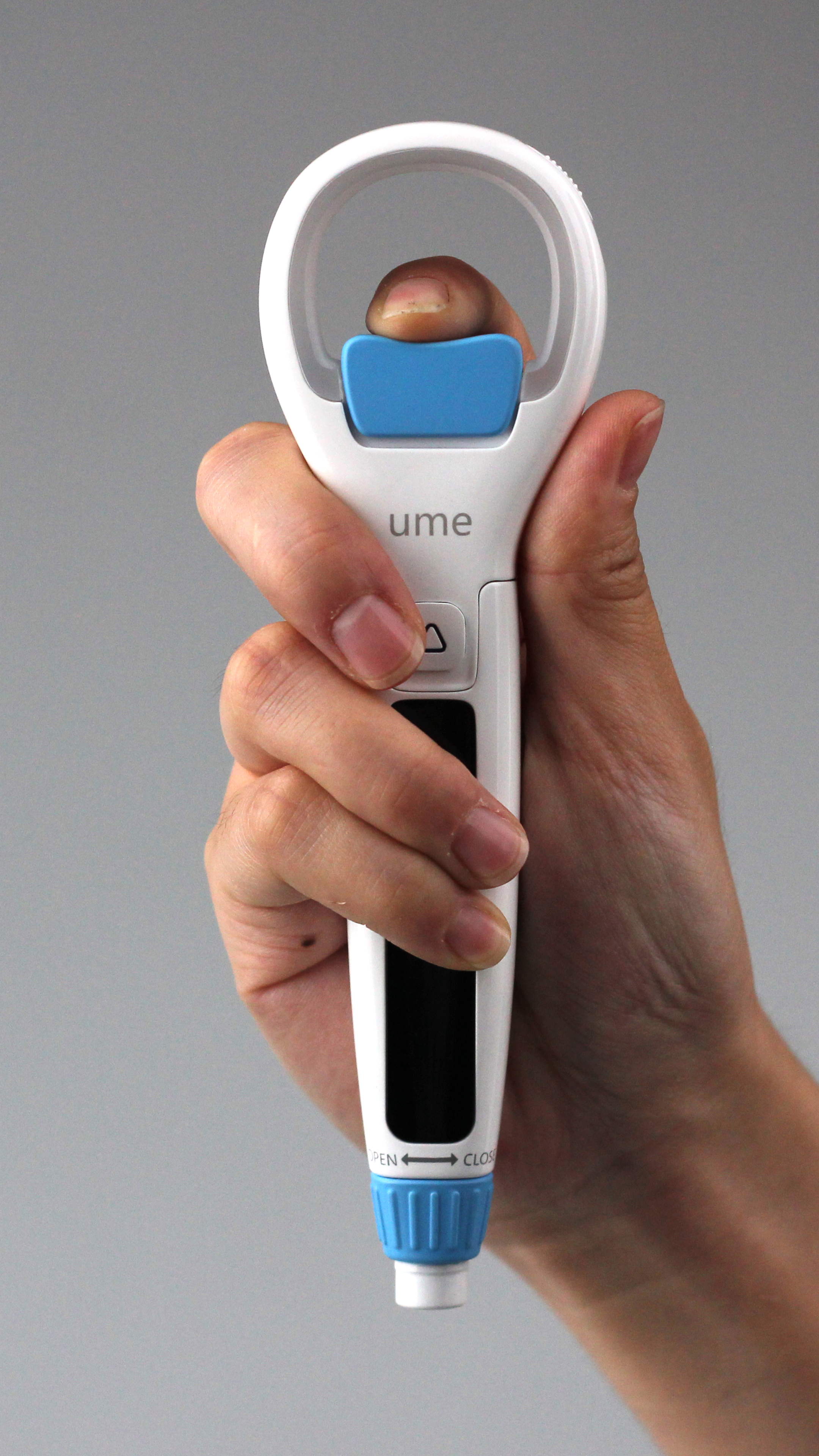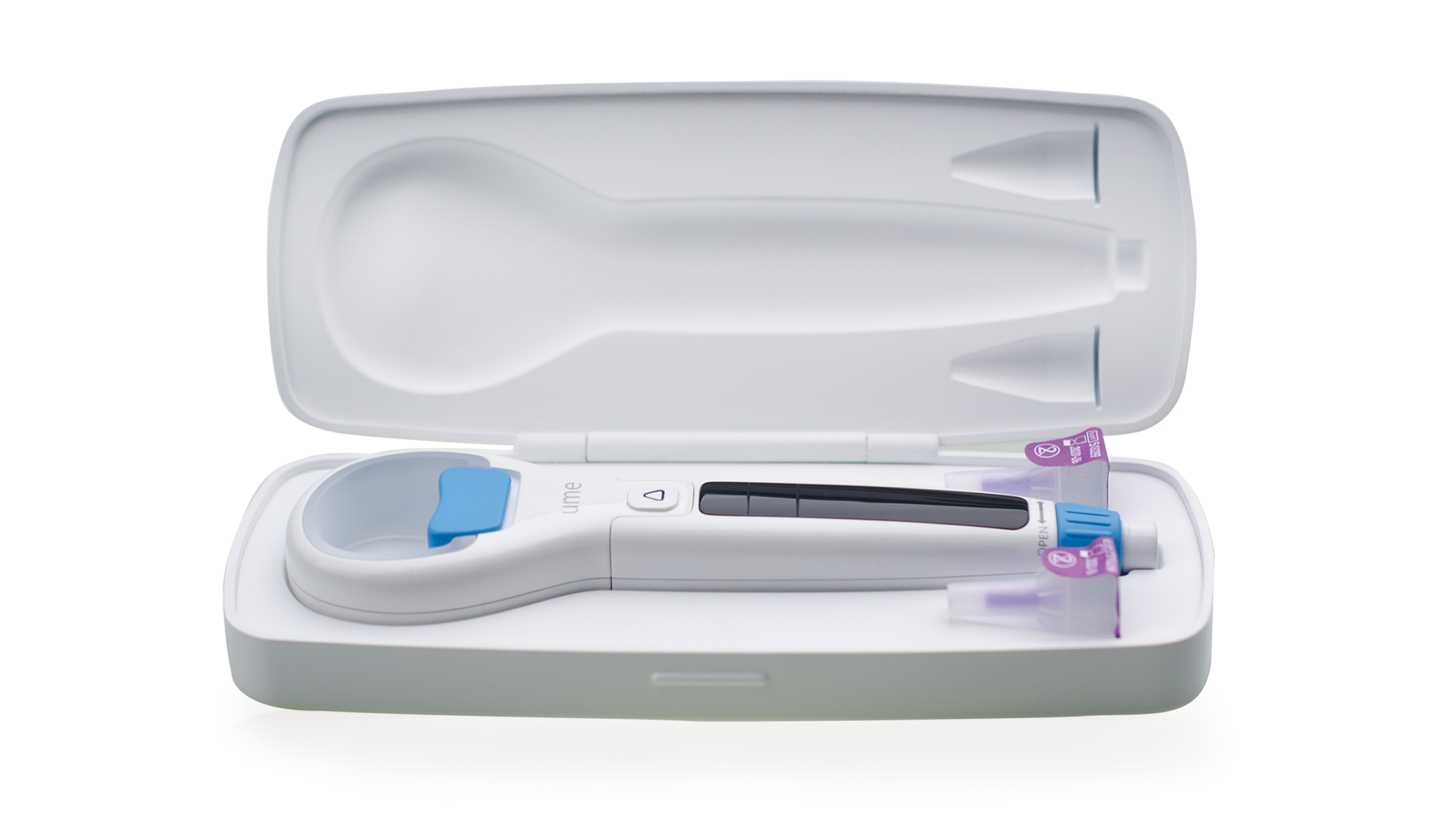 Ume is an intelligent blood glucose management device that integrates blood glucose measurement and insulin injection, providing diabetes patients with a more comfortable and convenient experience of measuring blood glucose and injecting insulin. The product uses spectral and ultrasonic blood glucose measurement methods to avoid the pain of patients measuring blood glucose through blood collection, while ensuring high accuracy of measurement results, providing a standard for insulin injection considerations. The insulin injection volume is accurately set by pressing keys and clearly displayed to patients with LCD numbers, which solves the problem that many patients with diabetes suffer from eye complications and cannot see the injection scale clearly. The product adopts an ergonomic design that conforms to the user's one handed operation, providing users with a safer and more comfortable operating experience. Meanwhile, Ume will intelligently synchronize data with the mobile app to constantly record the patient's health status, facilitating daily health management and providing accurate data reference for diagnosis and treatment.