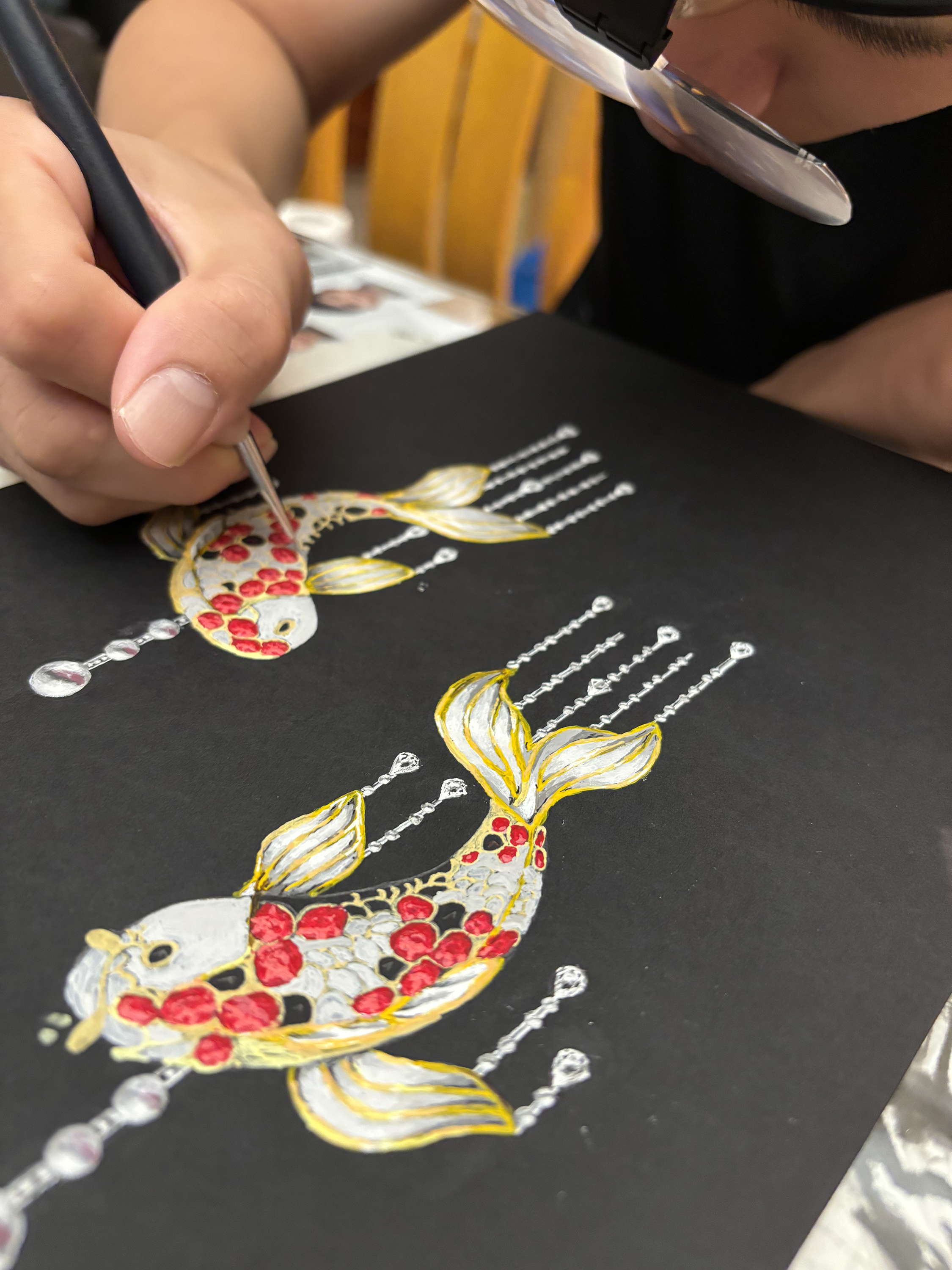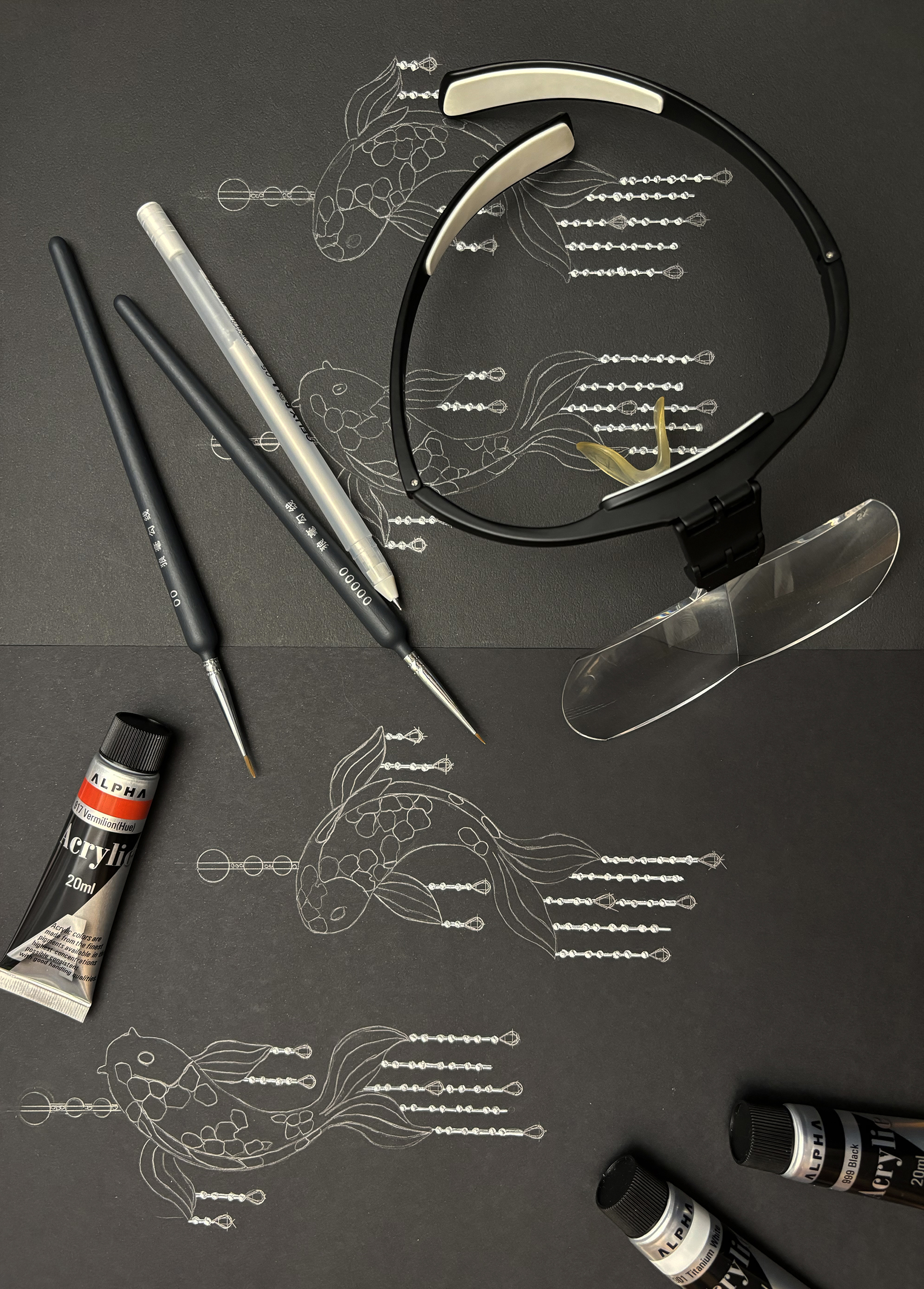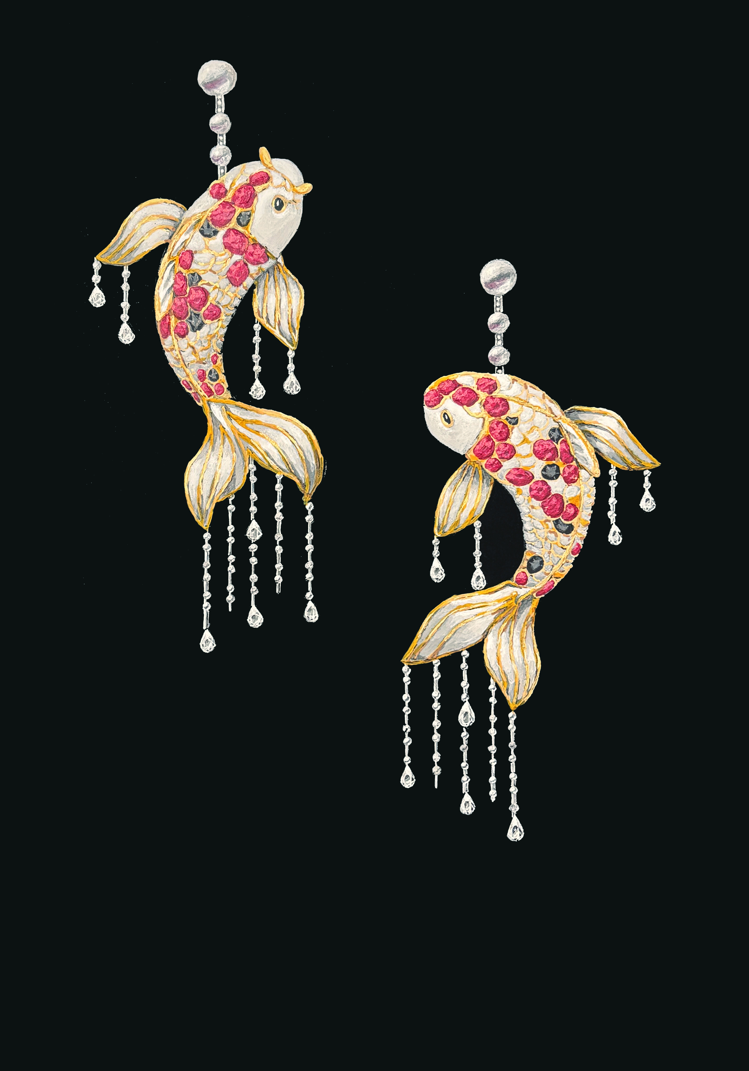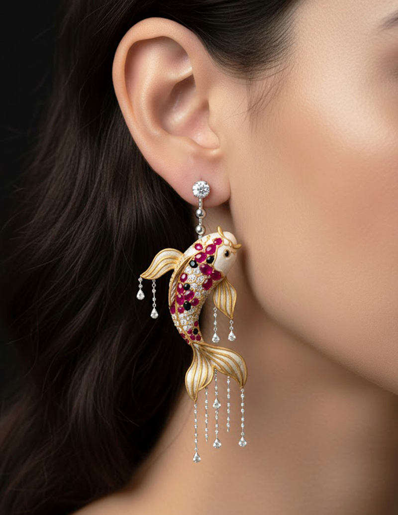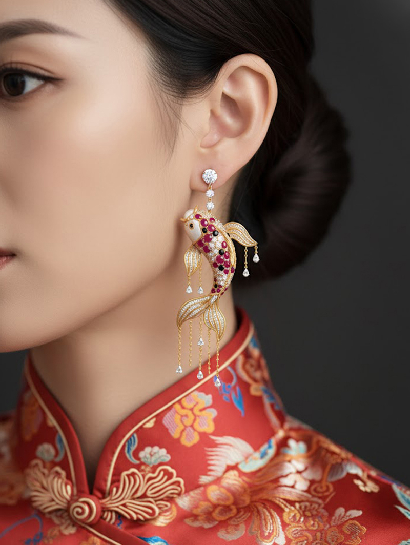 When worn, the overall shape exhibits a lively and refined Oriental elegance. It foregoes ostentatious extravagance, instead pursuing a serene and quietly fashionable Oriental demeanor. The complete earring delicately sways and dances with the wearer's light footsteps, beautifully embodying the vibrant essence of a leaping koi.
