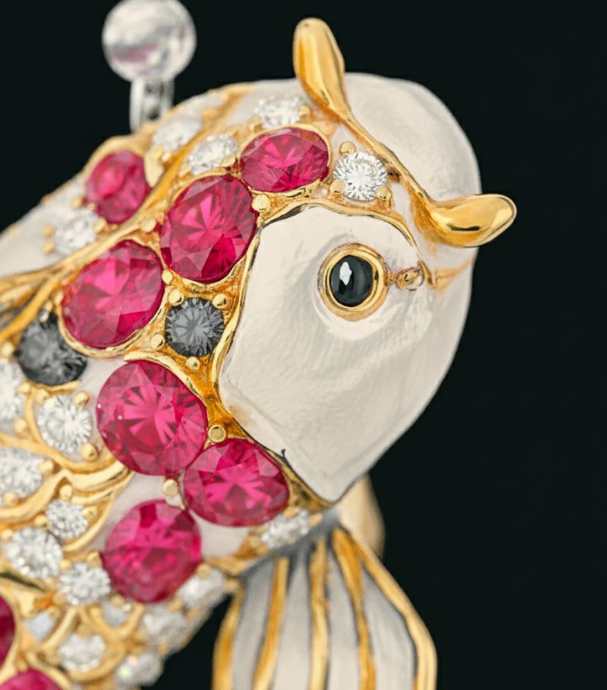 The design utilizes enamel, ruby, obsidian, and gold trim to outline the form, complemented by a tassel accent crafted from fine jewelry and diamonds. By deliberately incorporating intangible cultural heritage techniques from China, such as cloisonné (掐絲) and gold-base enamel (金胎琺瑯), the piece distinctively highlights the depth of Oriental culture.