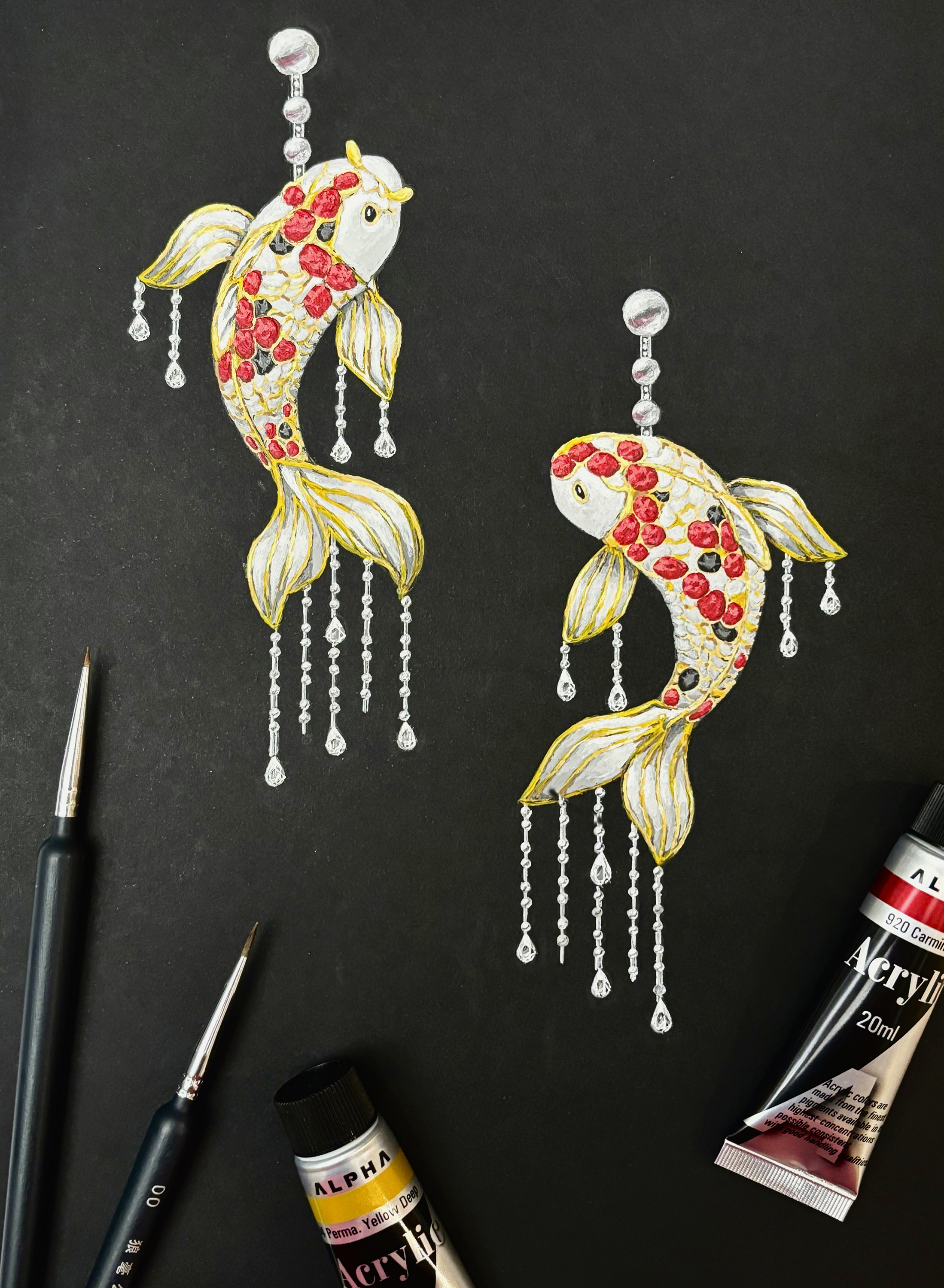 This earring design draws its inspiration from the graceful posture of the Taisho Sanke Koi (Taisho Three-Colored Nishikigoi), symbolizing good fortune, progress, and vitality.