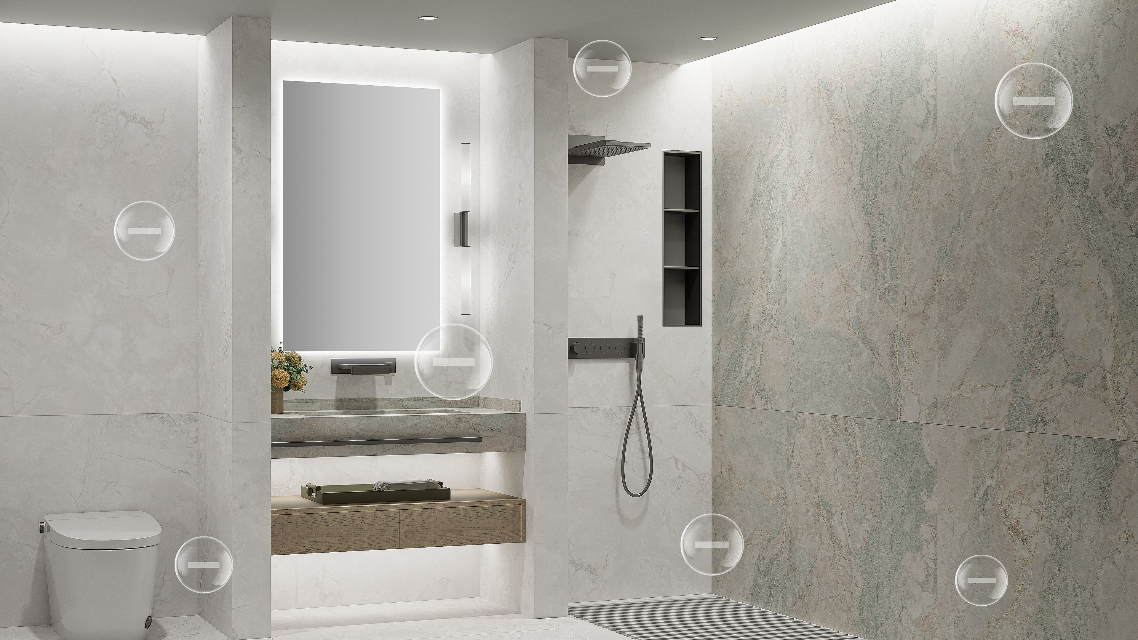 The main structure of the space utilizes our exclusively developed polyurethane/aluminum honeycomb composite anion purification bricks. This is the core technological innovation of the design. It subverts the passive nature of traditional bathroom materials by actively and continuously releasing negative ions. These ions decompose formaldehyde and VOCs at the source, effectively remove odors, and inhibit bacterial growth. It transforms the bathroom from an environment requiring constant cleaning into an "air oasis" that actively purifies the air and benefits well-being, providing users with an unprecedented level of health assurance.