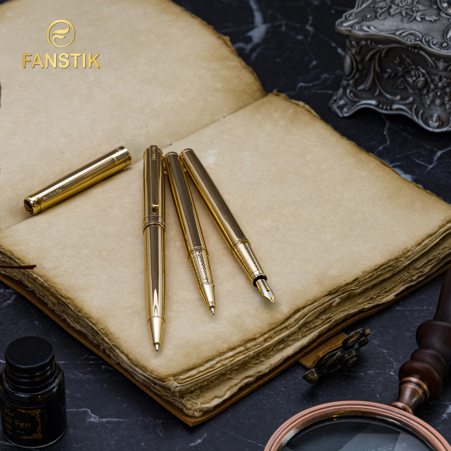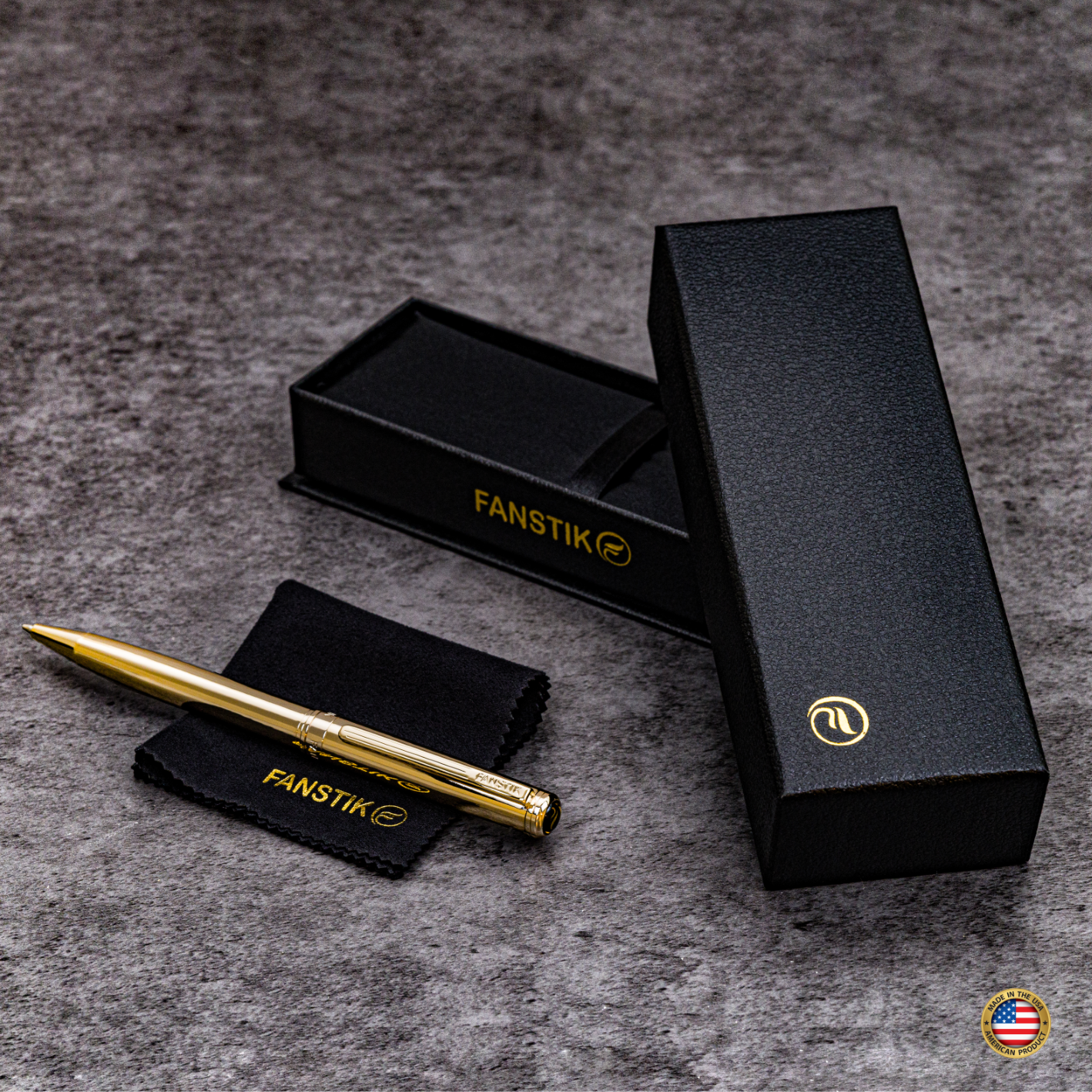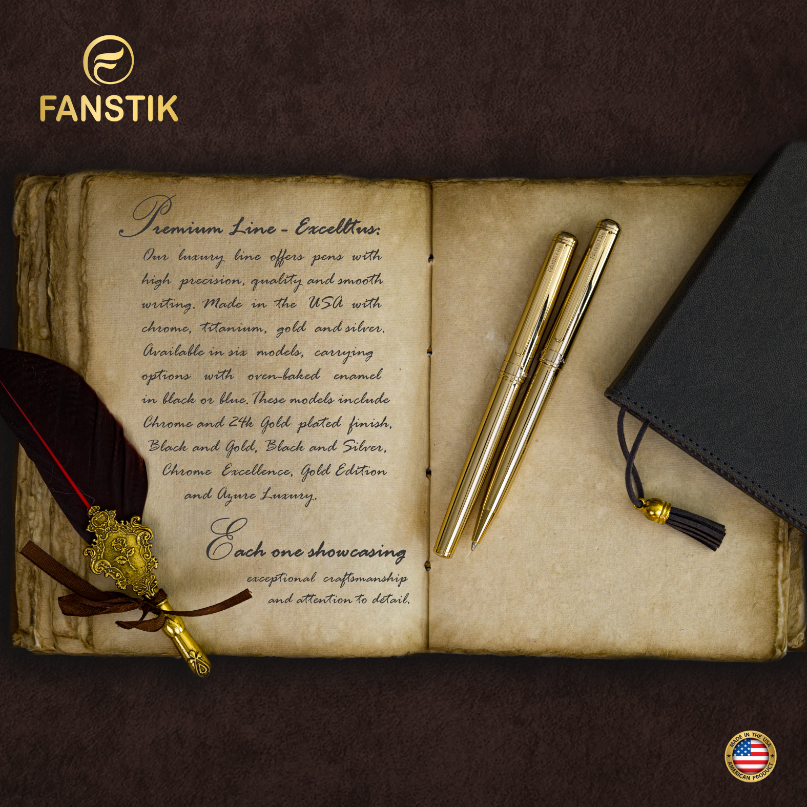 Luxury Gold BallPoint Pen Fanstik Excelltus Line, is a luxury collection of precision-crafted pens designed for smooth, refined writing. Made in the USA with chrome, titanium, gold, and silver, each of the six models showcases exceptional craftsmanship and detail. Finishes include 24k gold plating, black or blue oven-baked enamel, and elegant combinations like Black & Gold, Chrome Excellence, and Azure Luxury. This line celebrates timeless design, premium materials, and the art of writing elevated to its finest form