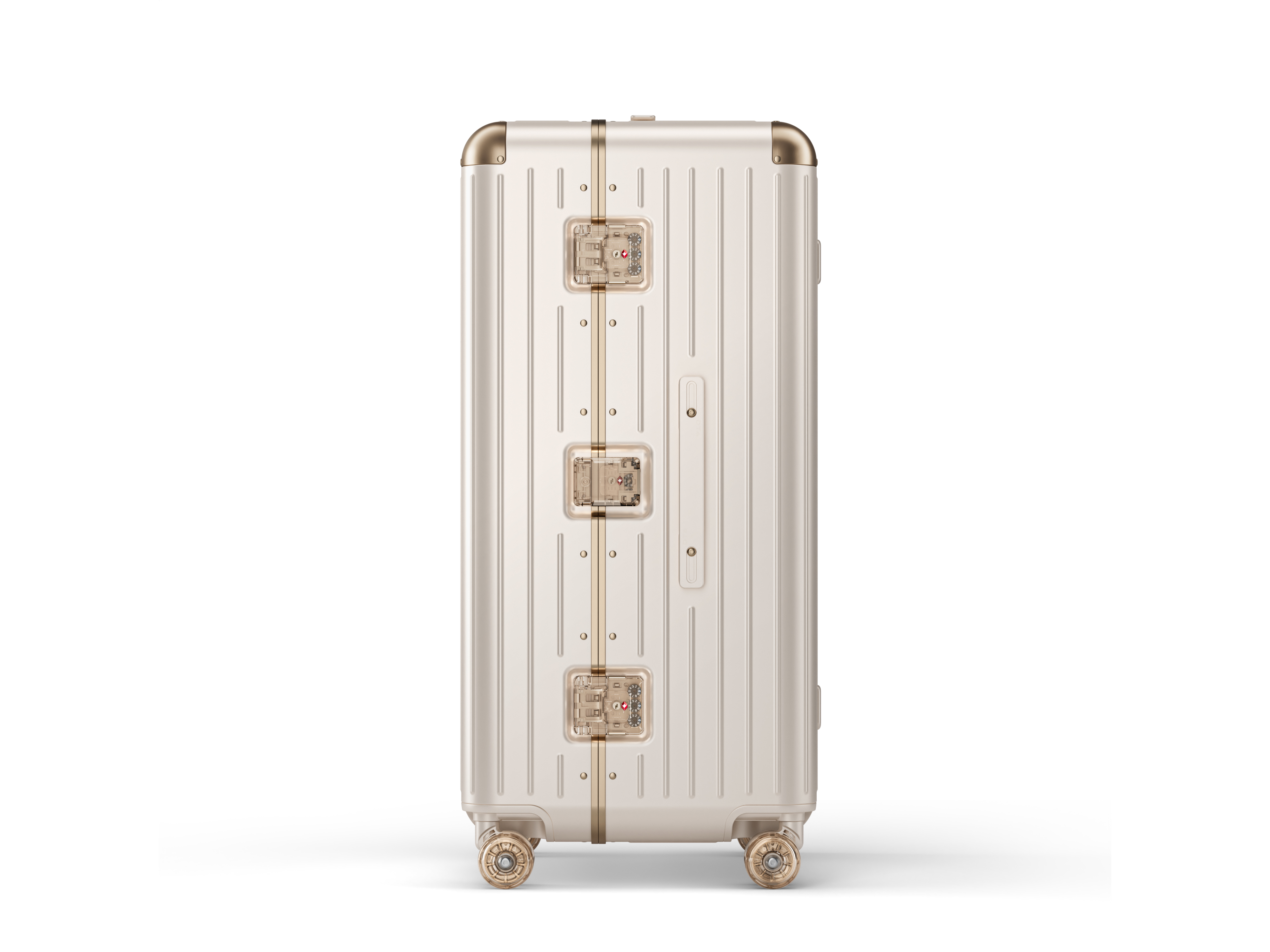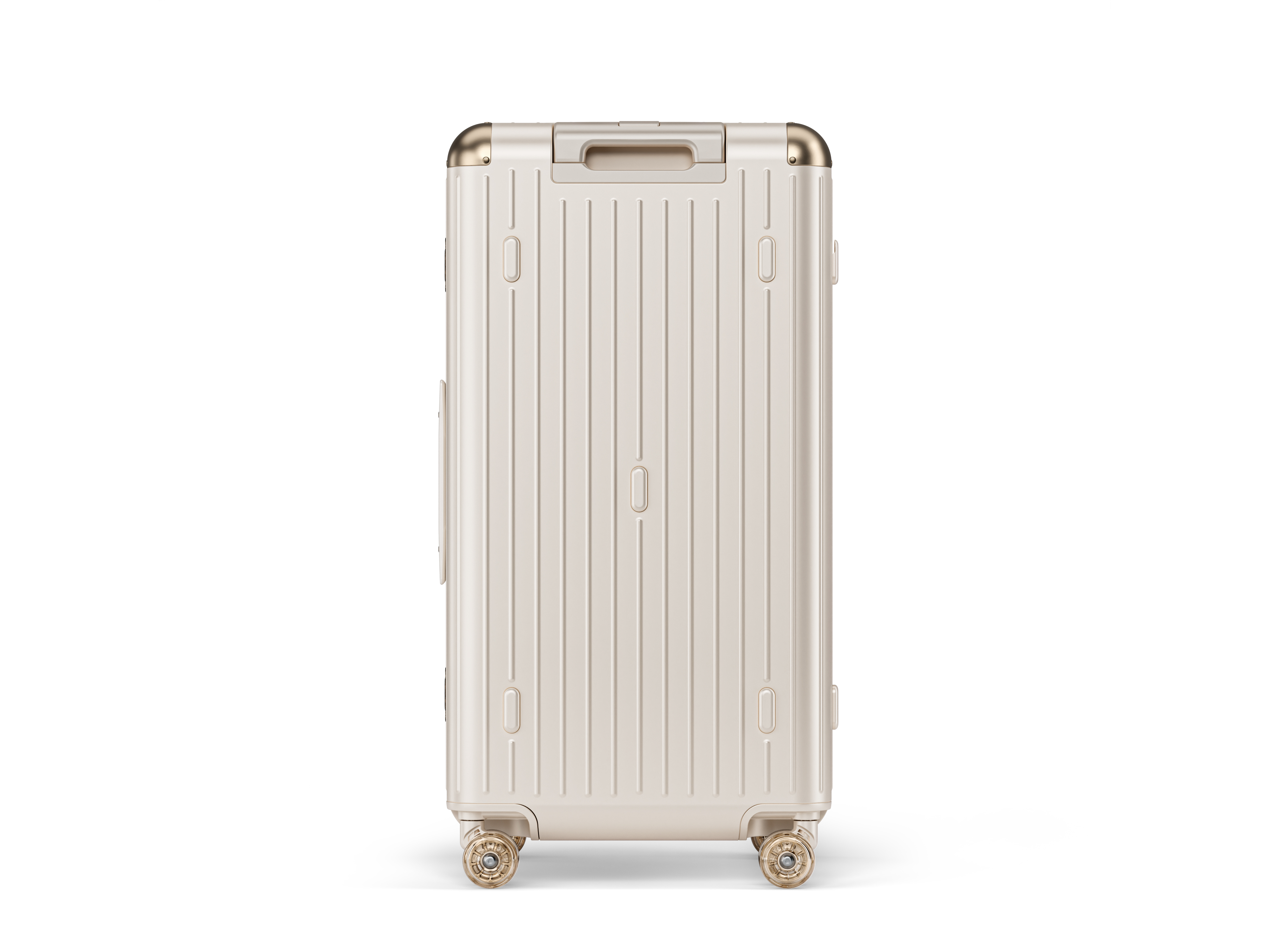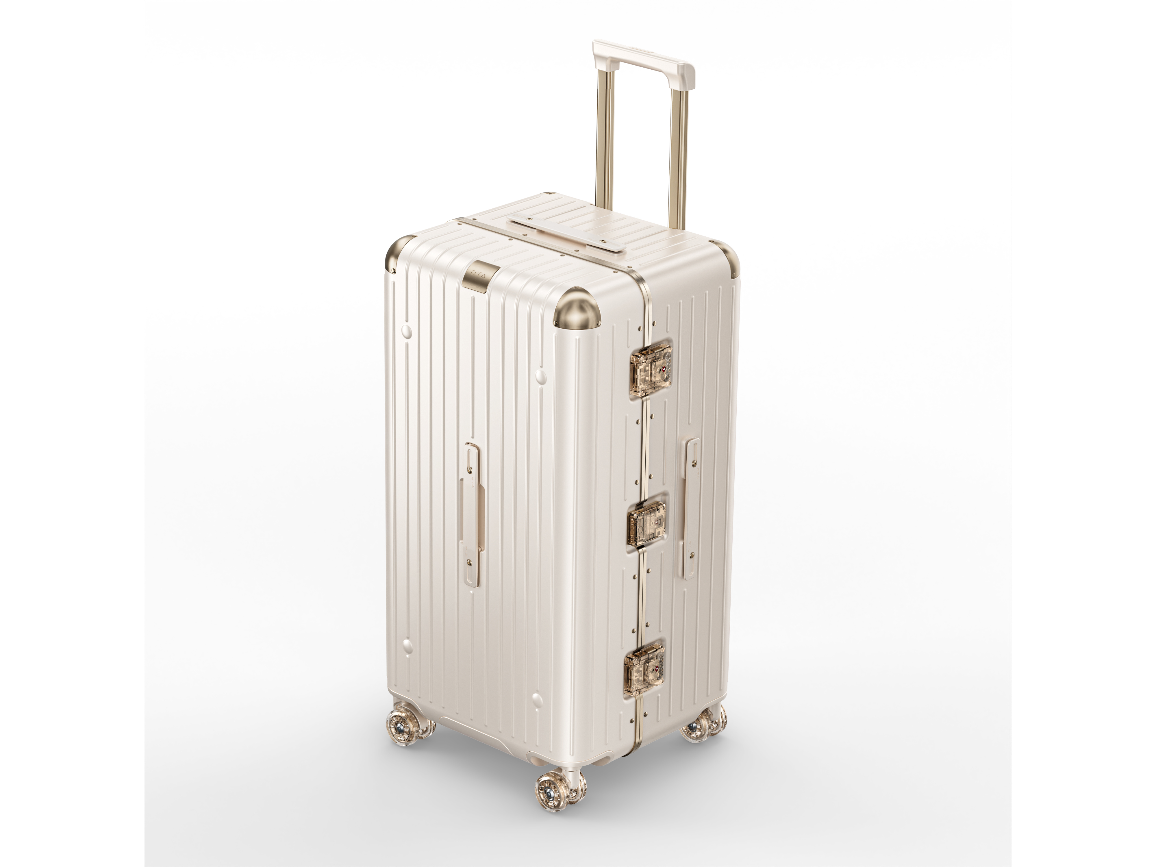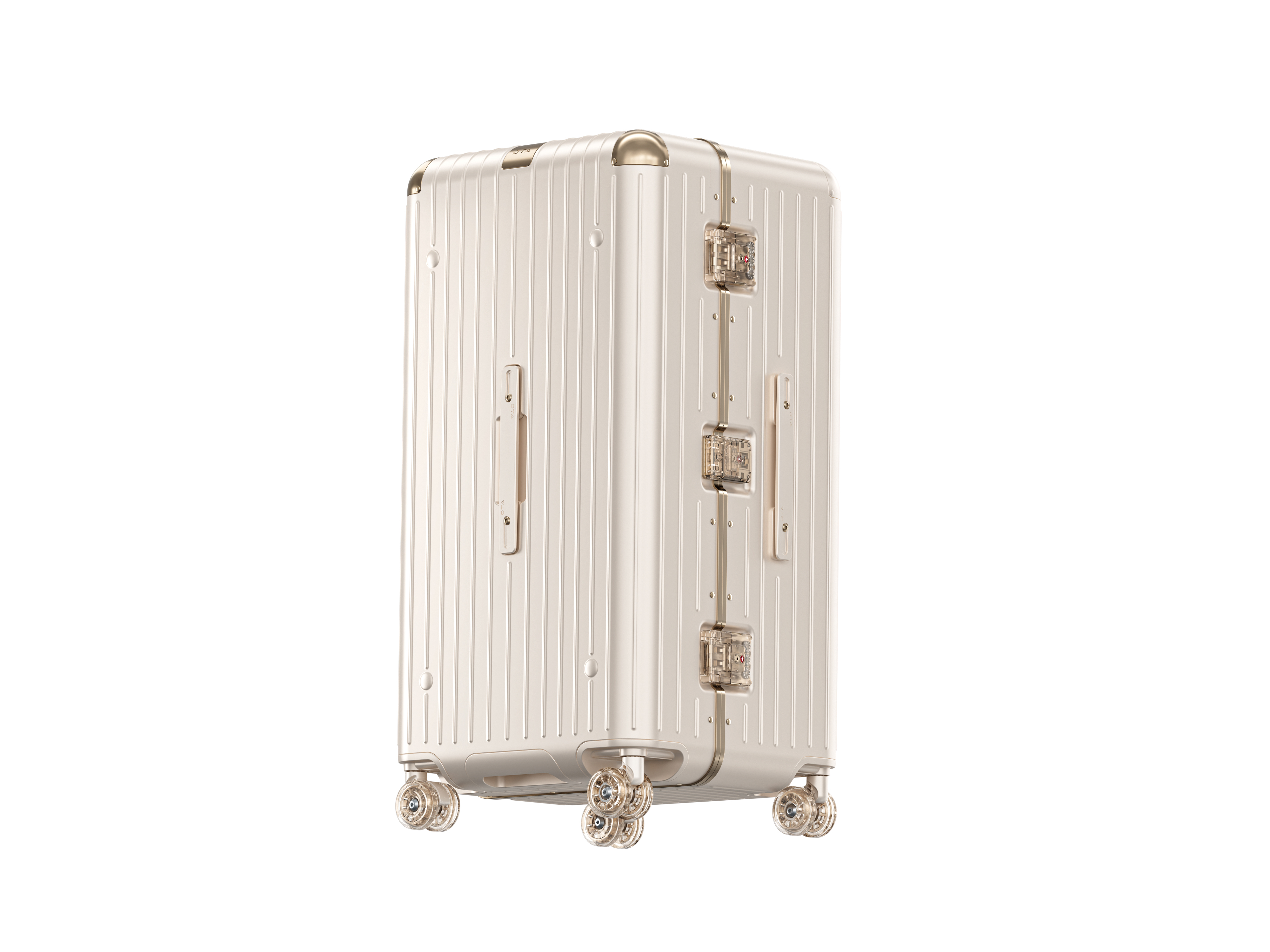 Visually, the design follows the principles of “functional-driven design” and “orderly aesthetics.” With clean vertical stripes as the main visual element, it reflects structural strength while shaping a slim silhouette that conveys a sense of rational elegance. Classic neutral tones are enhanced with tinted transparent and metallic accents, creating rich visual layers. The sturdy aluminum frame, high-tech transparent locks, and smooth PU wheels work together to deliver the dual promise of “strong protection” and “smooth mobility.”