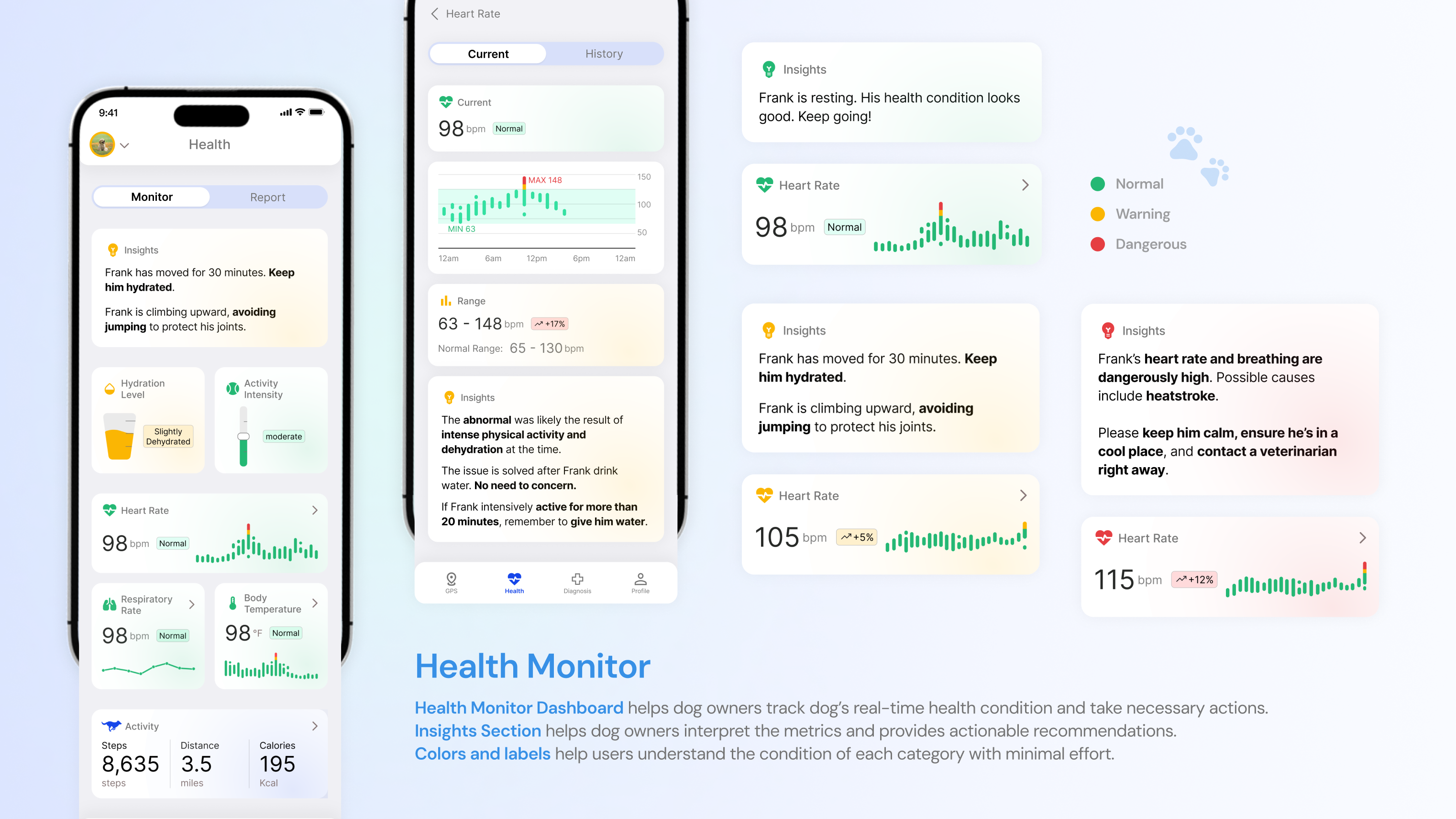 - Health Monitor Dashboard: Tracks vital signs in real time and flags abnormal readings, helping owners spot potential issues early. AI-generated insights evaluate the dog’s condition and alert users when immediate action is needed.