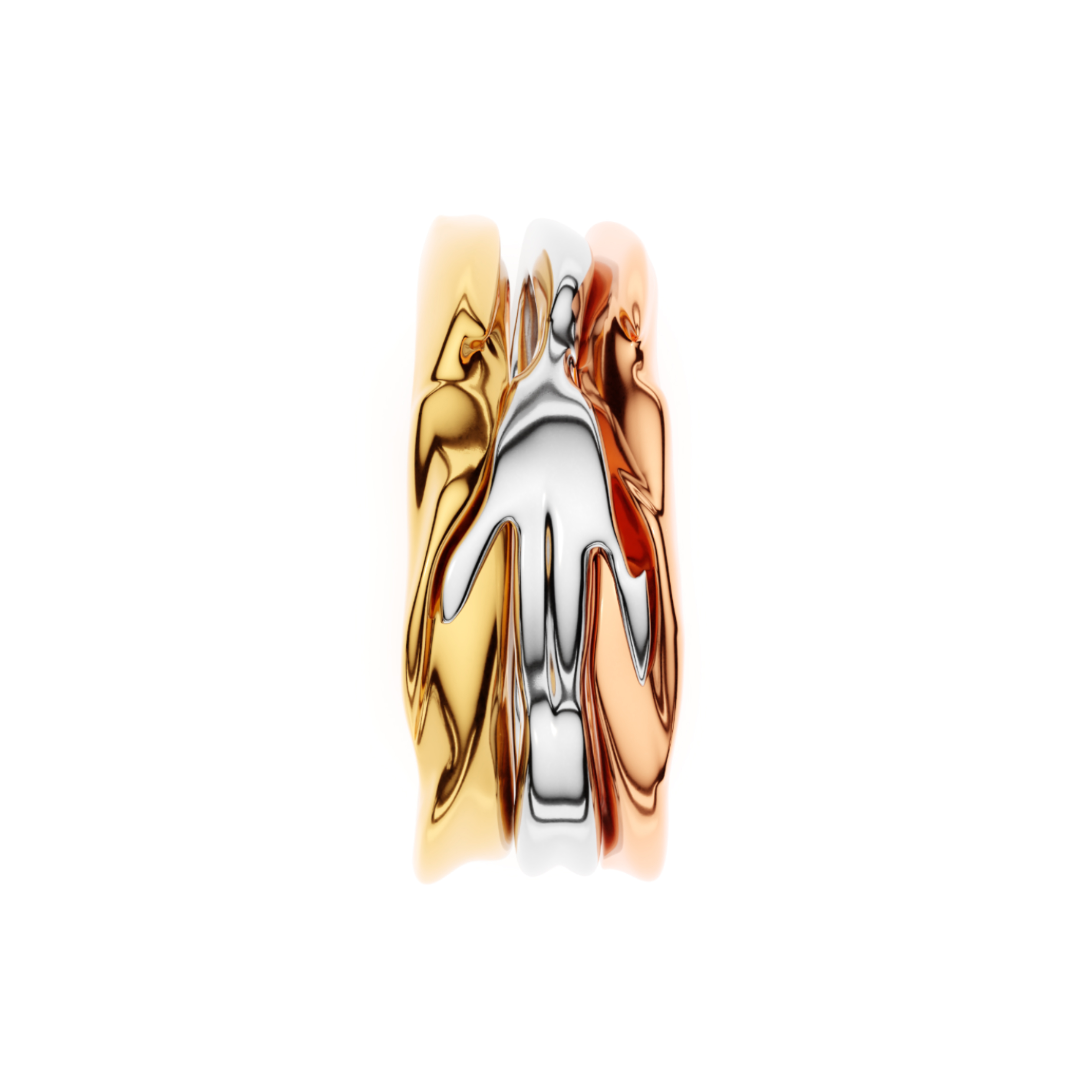 Inspired by classical paintings and mythology, the Ring Set subtly represents the human form in an abstract way. It draws inspiration from the Charites, or Graces, the Greek and Roman sub-goddesses associated with beauty, grace, and joy. The three Graces - Euphrosyne (the cheerful one), Thalia (the blooming one), and Aglaia (the shining one) - have been recurring motifs in art history, symbolizing elegance and harmony. The design reflects this theme.