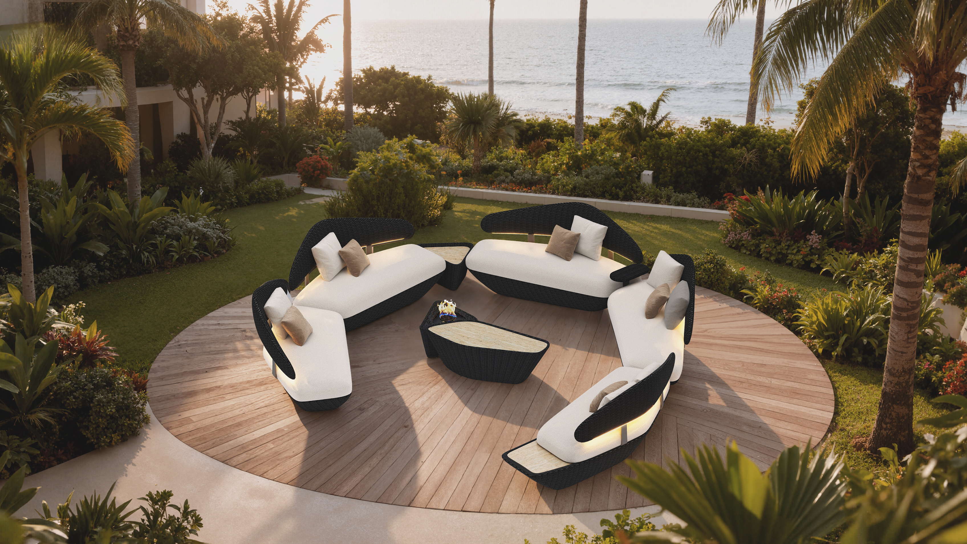 In terms of materials and structure, Rivora incorporates sustainable natural woven rattan and linen-cotton fabric, creating a gentle and breathable textured touch. It also integrates weather-resistant and eco-friendly sustainable craftsmanship, ensuring long-lasting use and low maintenance requirements in outdoor environments.