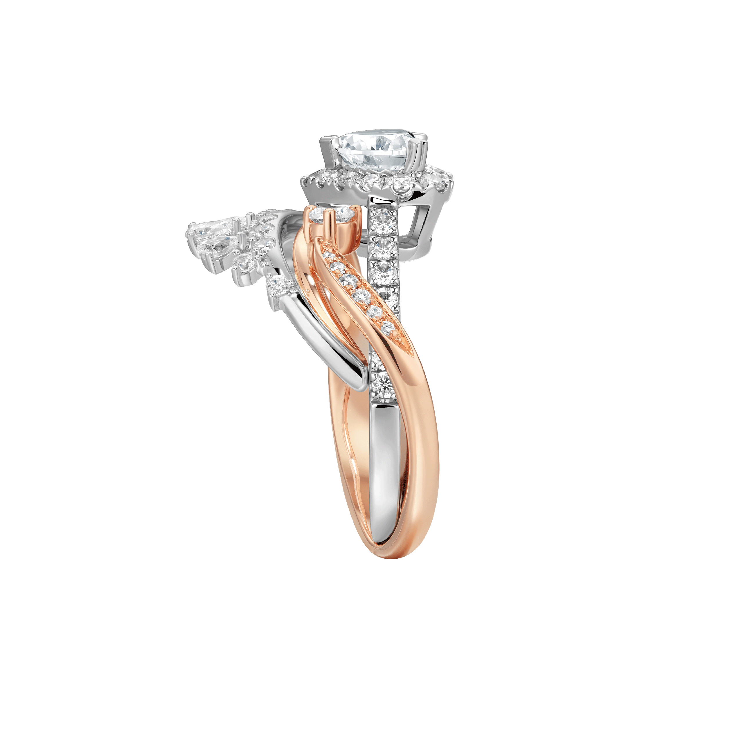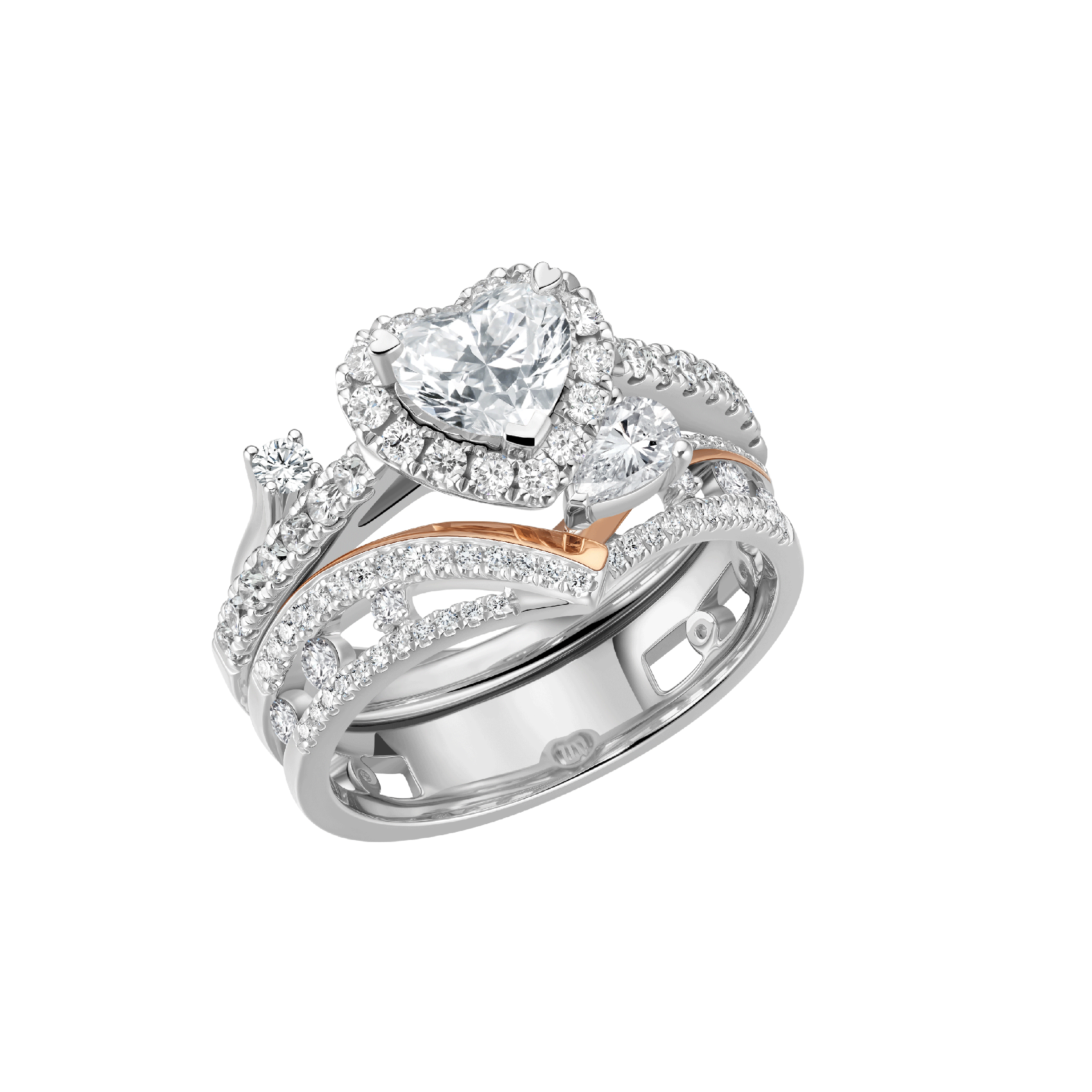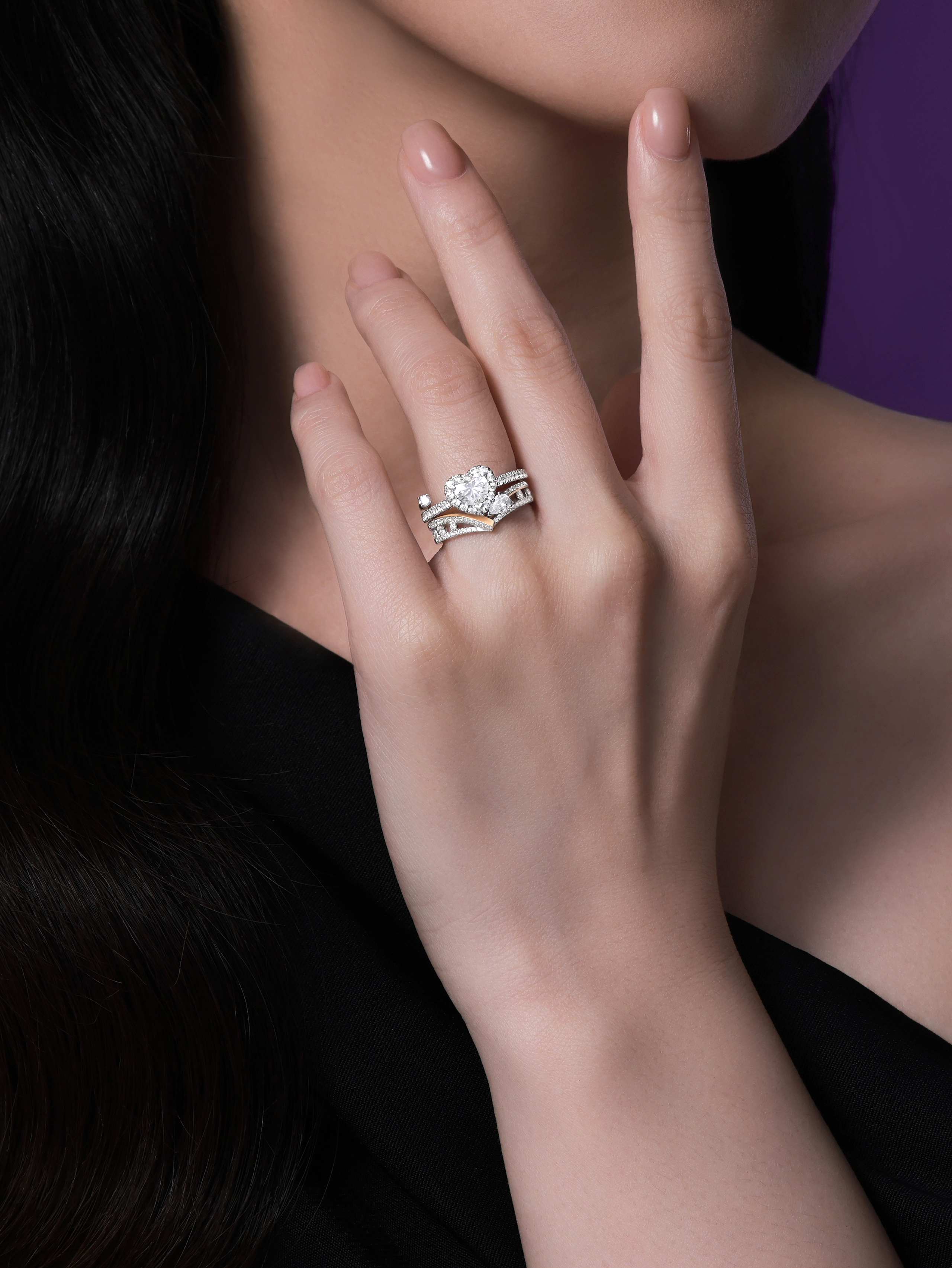 The patented free-inlaying technique enables the drop-shaped diamond on the auxiliary ring to rotate flexibly—shifting to the side to combine with the main ring or to the center to stand alone—thereby achieving dual-purpose functionality. This makes the ring set suitable for diverse styles and occasions, manifesting that "love is about mutual fit and respect for independence".