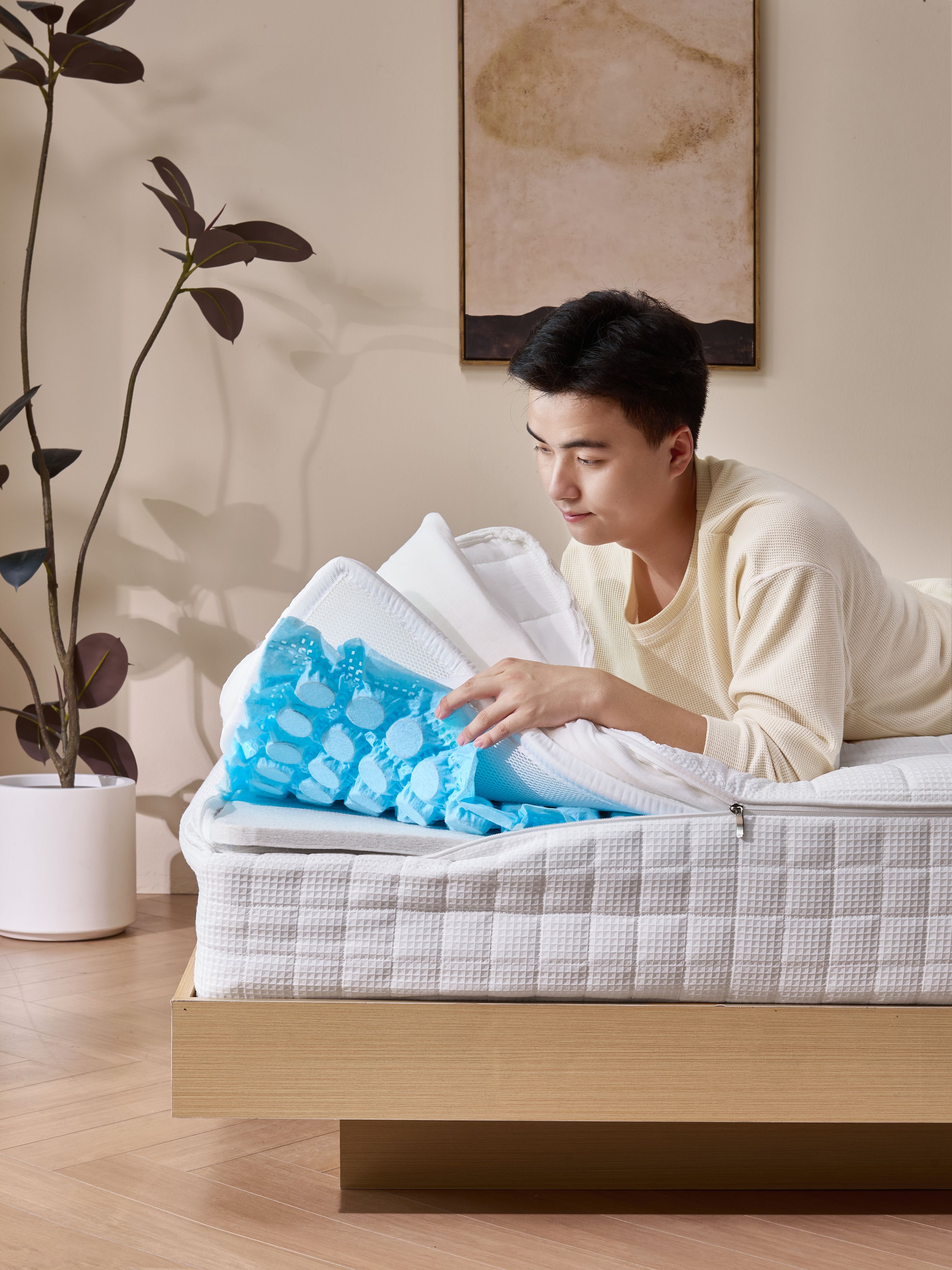 In terms of structure, the 360-degree detachable design is a major highlight. Exposed zippers and a layered structure make the interior clear at a glance, allowing users to freely check the fabric, filling layers and support layers, achieving transparent interaction in both vision and function. The three-zone cool fabric independent pocket springs accurately support different parts of the body, remaining quiet and offering excellent motion isolation; the concave-convex non-slip particles at the bottom prevent slipping and shifting. In terms of material selection, it fully demonstrates environmental friendliness and quality: the waffle fabric is lightweight, warm and easy to maintain; the bamboo charcoal spine-supporting cotton is elastic, breathable, antibacterial and anti-mite; the jute fiber cotton also has the same antibacterial and anti-mite properties. The springs adopt ultrasonic stitching technology with zero glue bonding, ensuring safety, environmental friendliness and reduced pollution. Additionally, the fully detachable and washable design facilitates cleaning, the filling layers allow adjustment of firmness, and the mattress can also be customized to personal size and needs for a tailored sleep solution.
