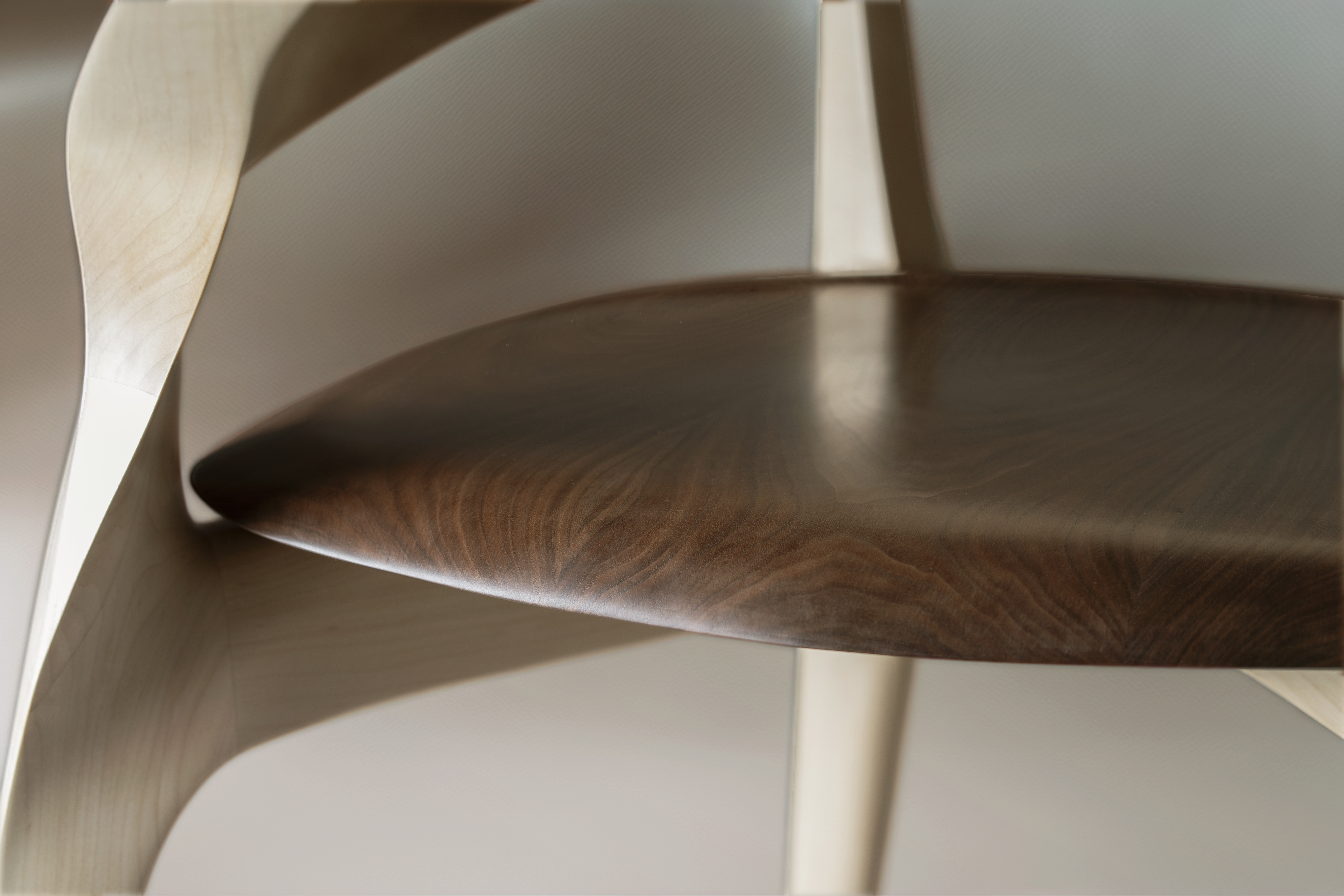 The form was realized by carving directly from solid wood using traditional Japanese hand tools. Rather than imposing a predetermined geometry, the final shape emerged through continuous interaction with the material. Balance, weight distribution, and surface transitions were adjusted through repeated physical testing, allowing the chair to achieve stability and comfort while maintaining a strong visual identity. The resulting geometry could not be achieved through industrial or automated processes, as its complexity relies on tactile judgment and material response.
