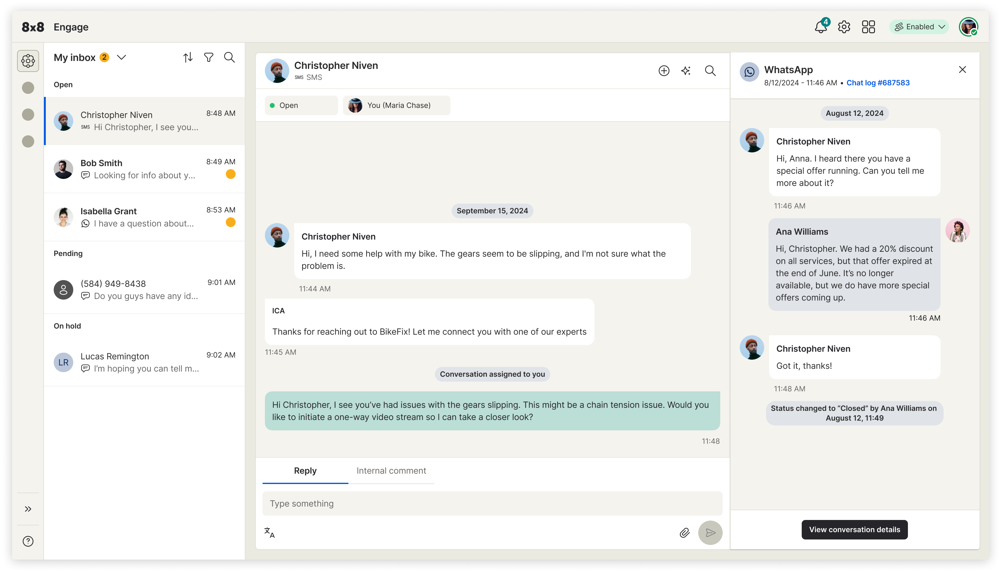Engage was built to close this gap by unifying conversations, context, routing, and collaboration in a single intuitive workspace. Messages from channels like SMS, WhatsApp, and chat appear in a unified inbox with full customer history, journey details, prior interactions, and team notes. Smart routing ensures the right expert or frontline worker receives the request, while real-time context and shared threads prevent information loss. A one-tap video escalation feature enables faster remote troubleshooting, especially for field-based scenarios.