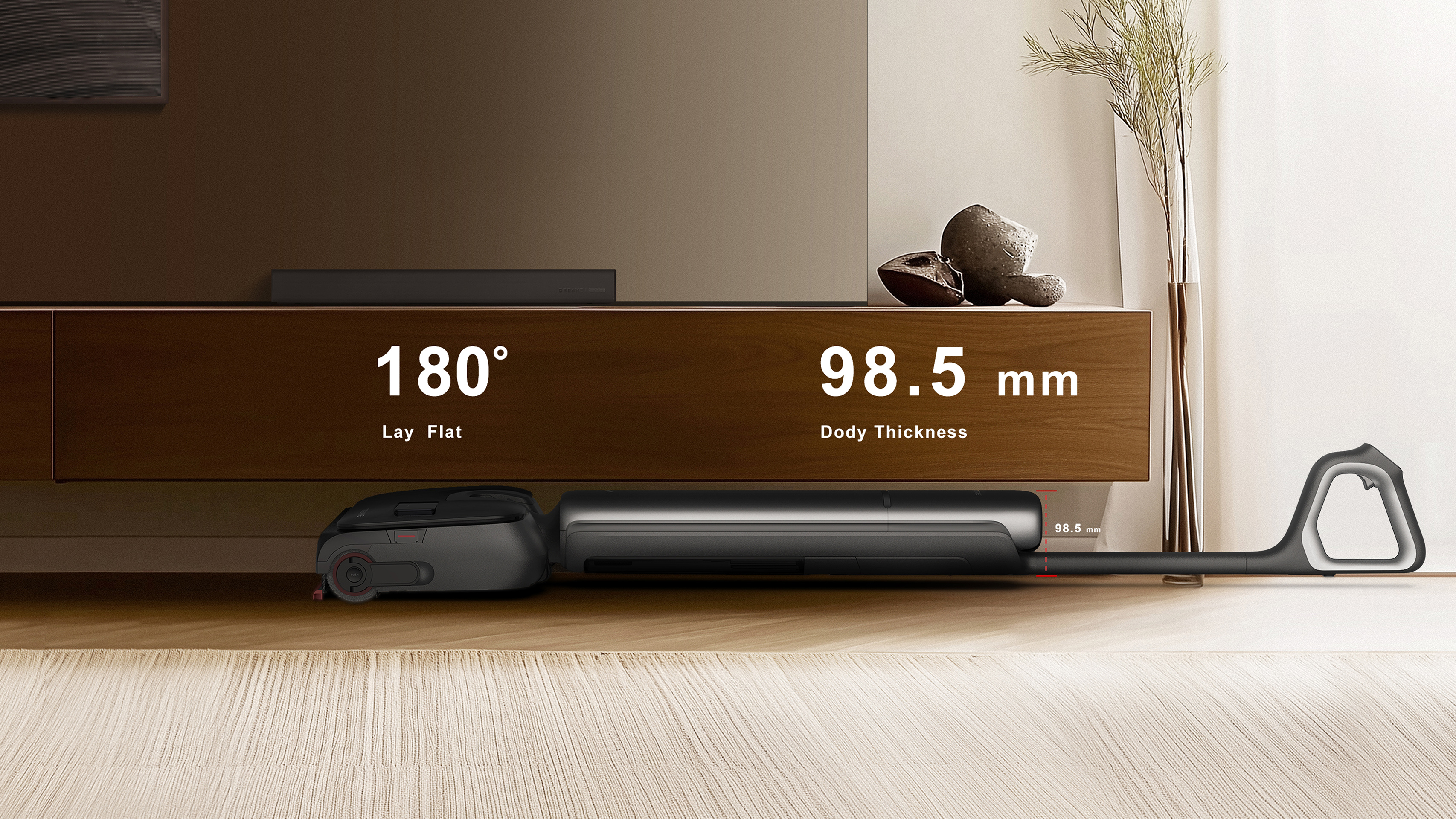 The T70 features an ultra-slim 98.5cm frame that lies completely flat at 180°, and incorporates a 160,000-rpm aerospace-grade high-speed motor delivering 30kPa powerful suction—enabling it to work with full efficiency deep under low-clearance areas like beds and sofas, and ensuring the same thorough cleaning performance as in open spaces.