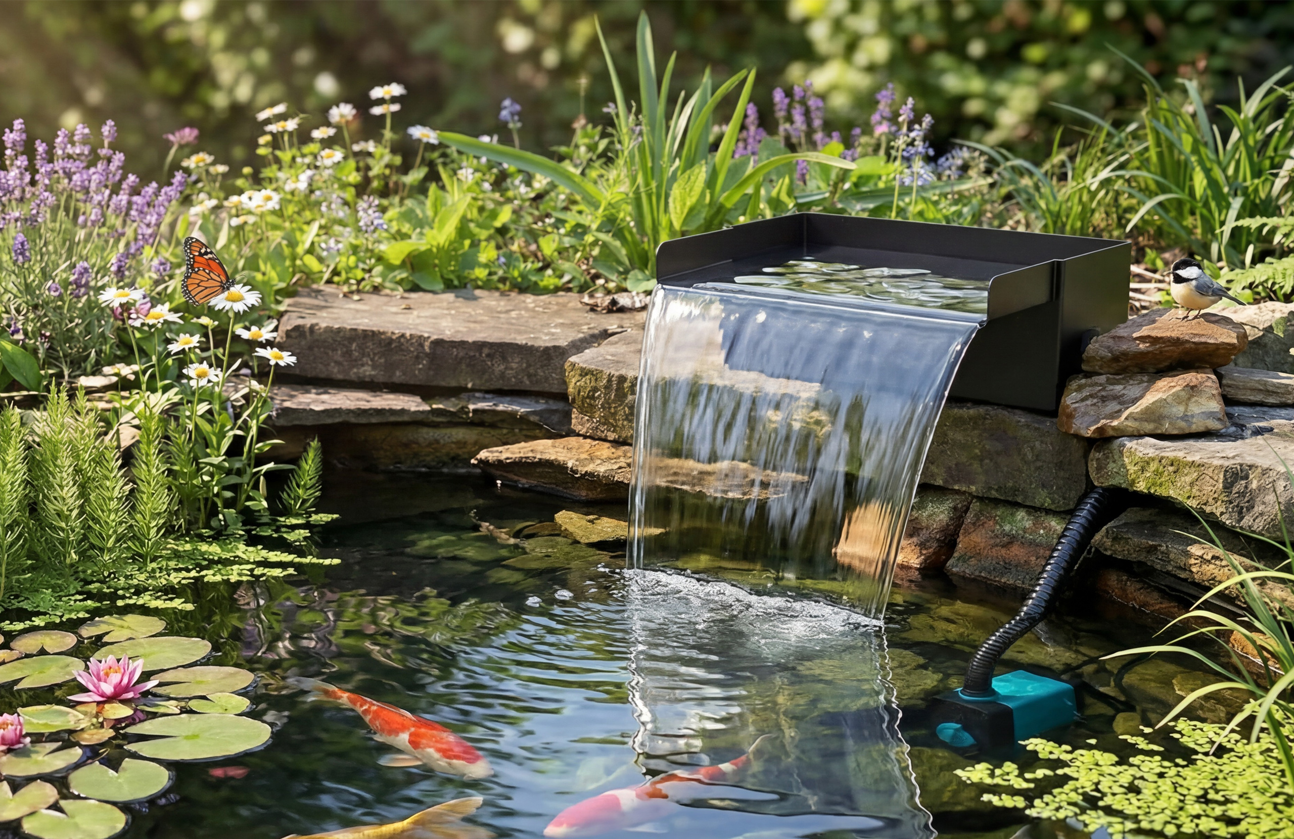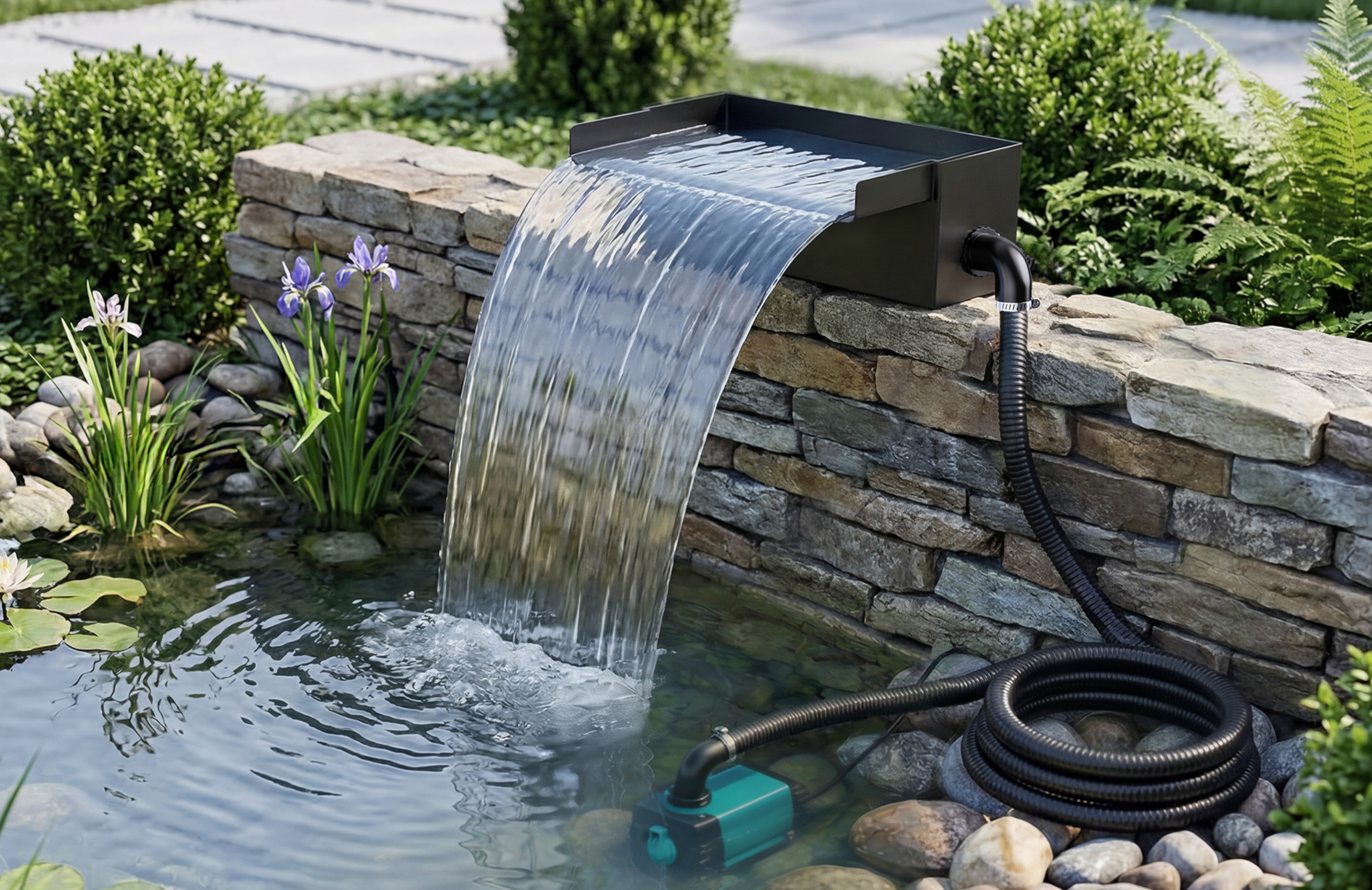A matching 40W pump delivers a steady water supply to support prolonged operation. The corrugated hose offers sufficient flexibility, allowing users to adjust the routing to fit the pond structure during installation. Designed for reliability and easy maintenance, the system fits perfectly into scenes of relaxation, family gatherings, or daily appreciation. The sound and sight of flowing water create a relaxing natural atmosphere, making the water feature a constant companion in family life.