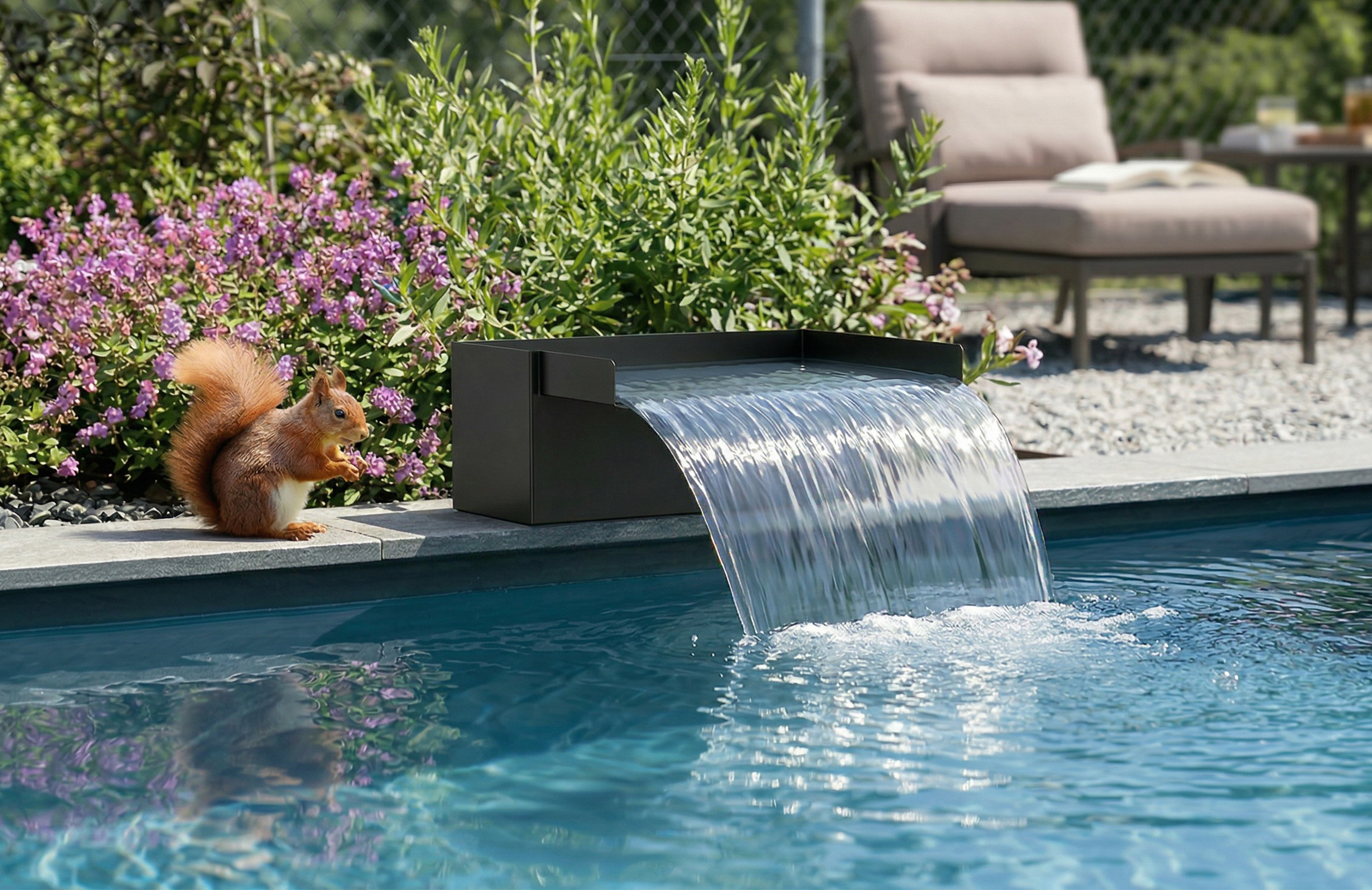 The waterfall body is made of stainless steel, defined by a clean overall profile and crisp edge lines. A top inlet combined with a full-width front outlet allows water to spill evenly, forming a smooth sheet waterfall and reducing flow breakage or side deviation. The stainless steel surface provides strong resistance to water and weather, maintaining a neat appearance in outdoor environments and integrating naturally into garden or courtyard landscapes.
