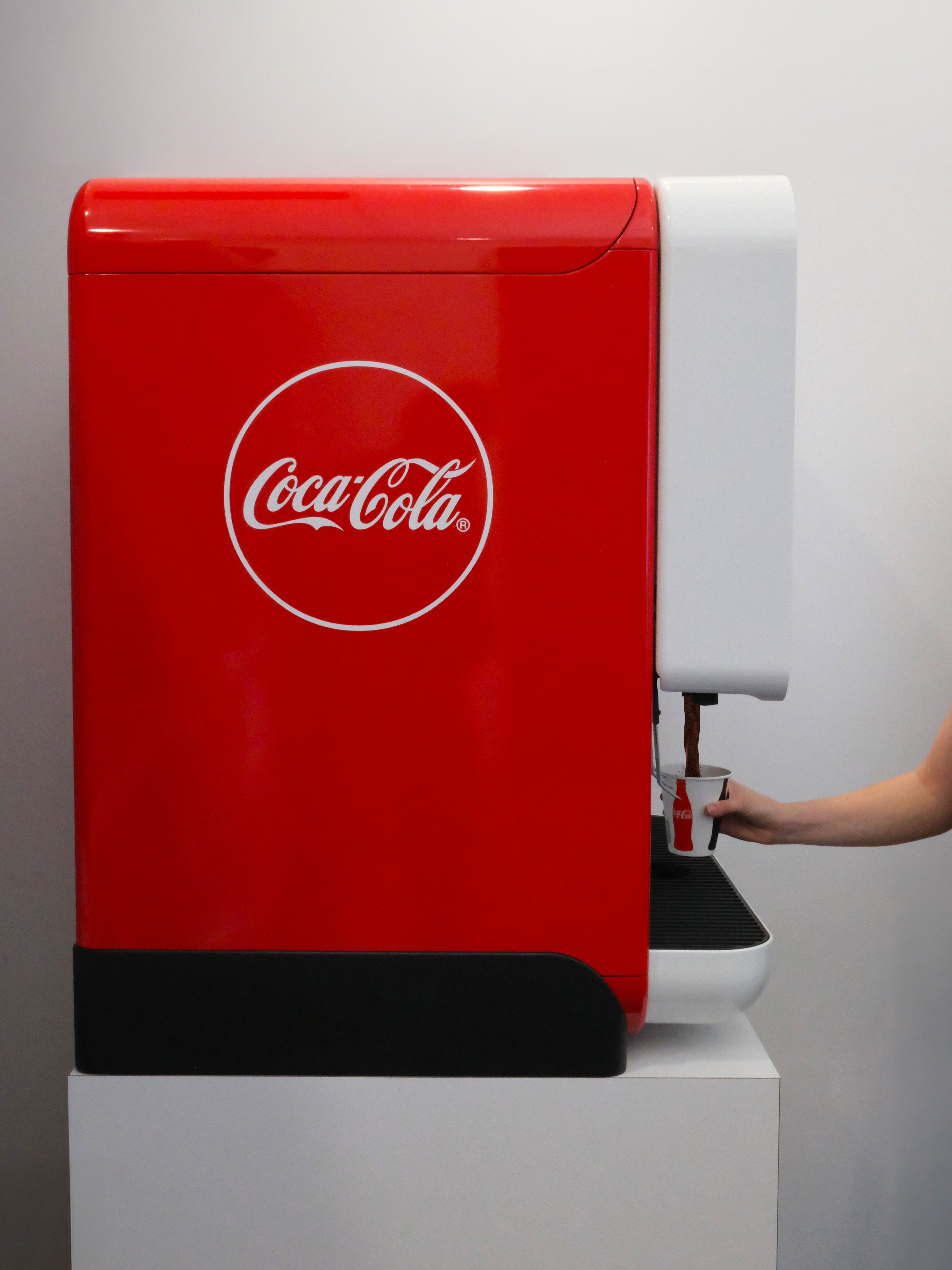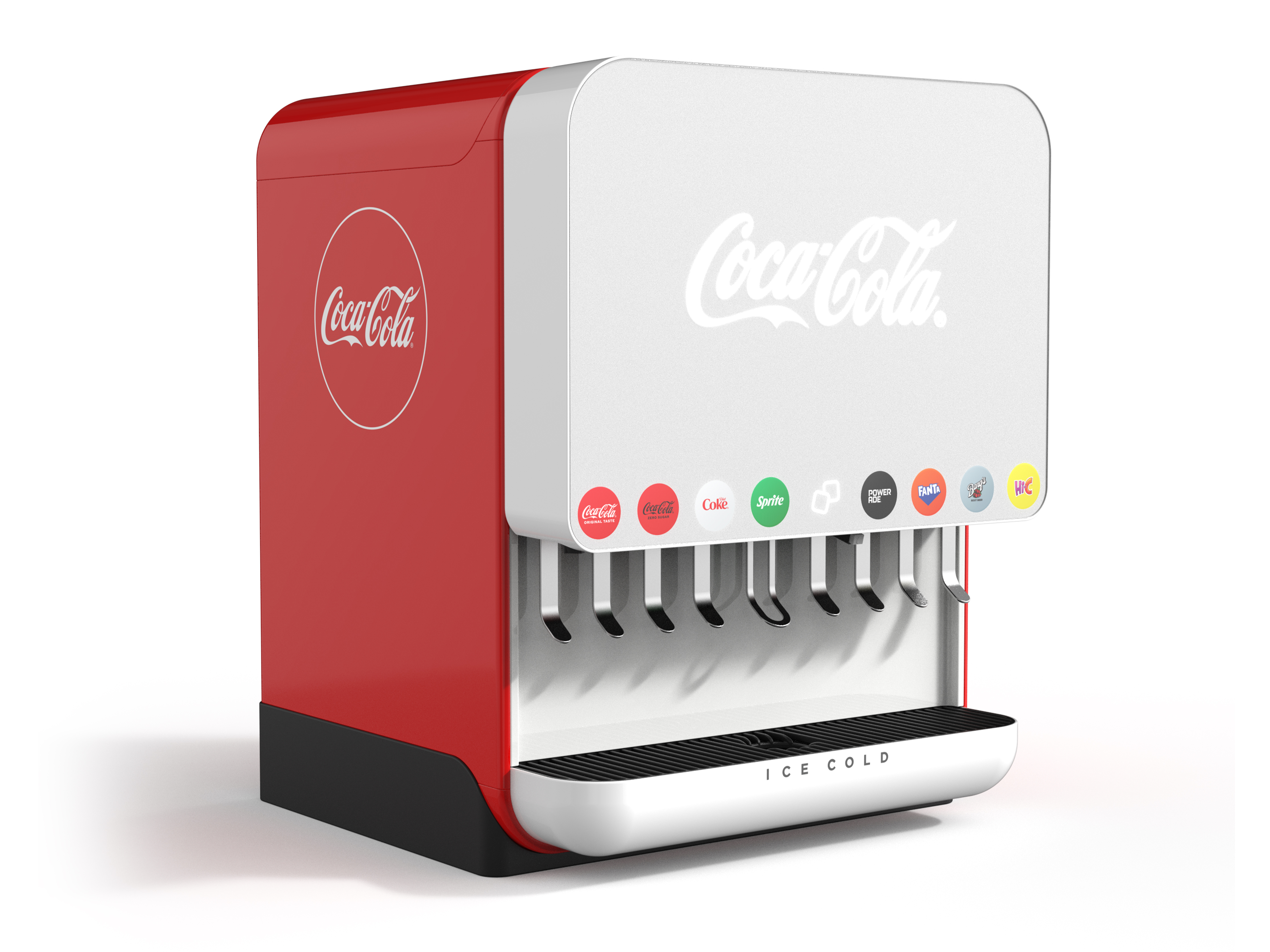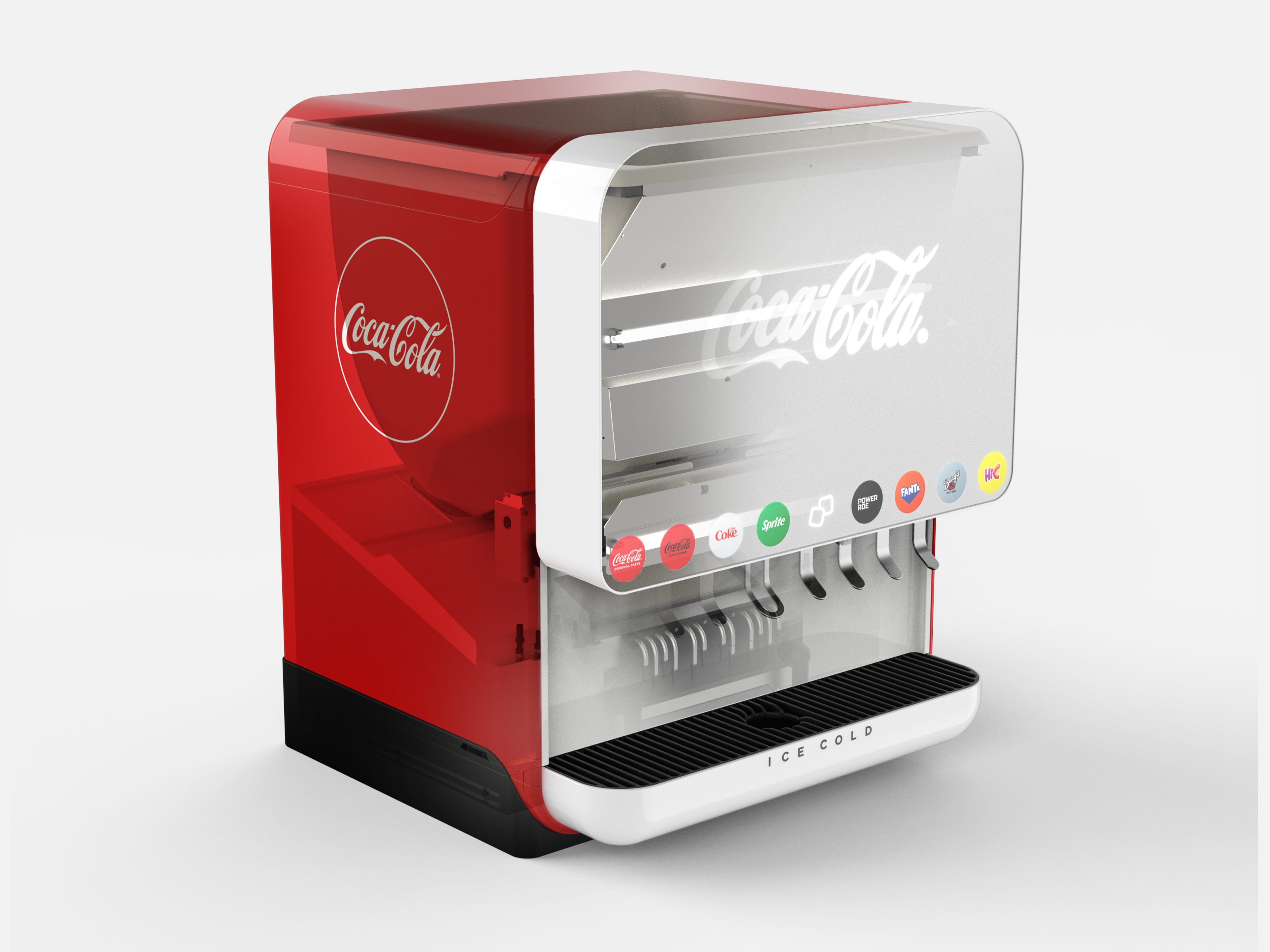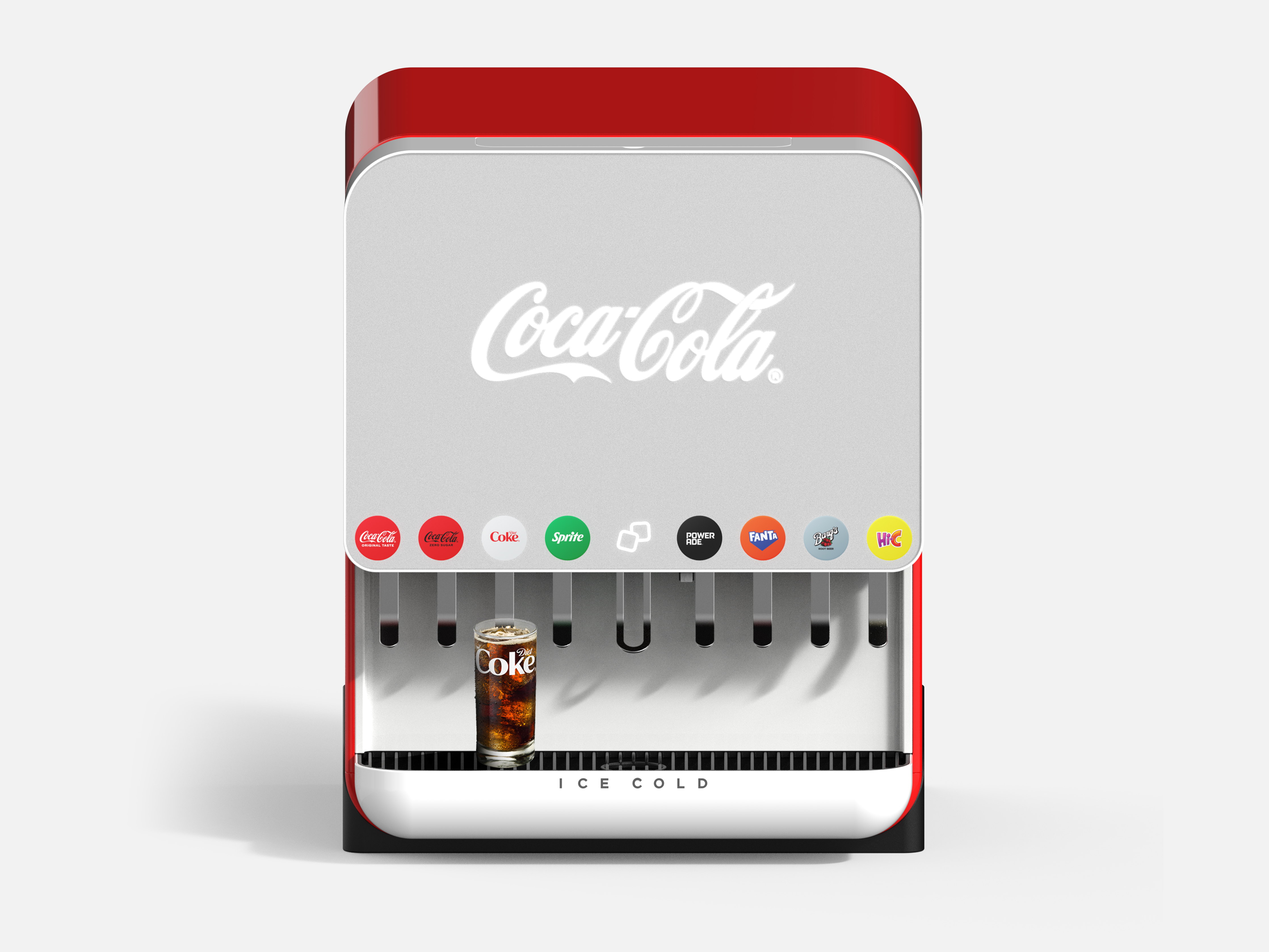 Dawn’s form elevates the Coke experience with clean geometry, a minimalist front, and iconic Coca-Cola red side panels that anchor attention. A bold front with crisp Coca Cola script is inviting, with recessed nozzles for hygiene and backlit branded discs for intuitive selection. The curved drip tray with ICE COLD lettering conveys subtle emotion of a cold drink perception. From the matte finish that maintains cleanliness to the timeless proportions and softened edges, Dawn engages the senses while seamlessly integrating into varied interior styles. In red, it acts as a brand beacon; in gray, it blends into more premium, minimal environments.