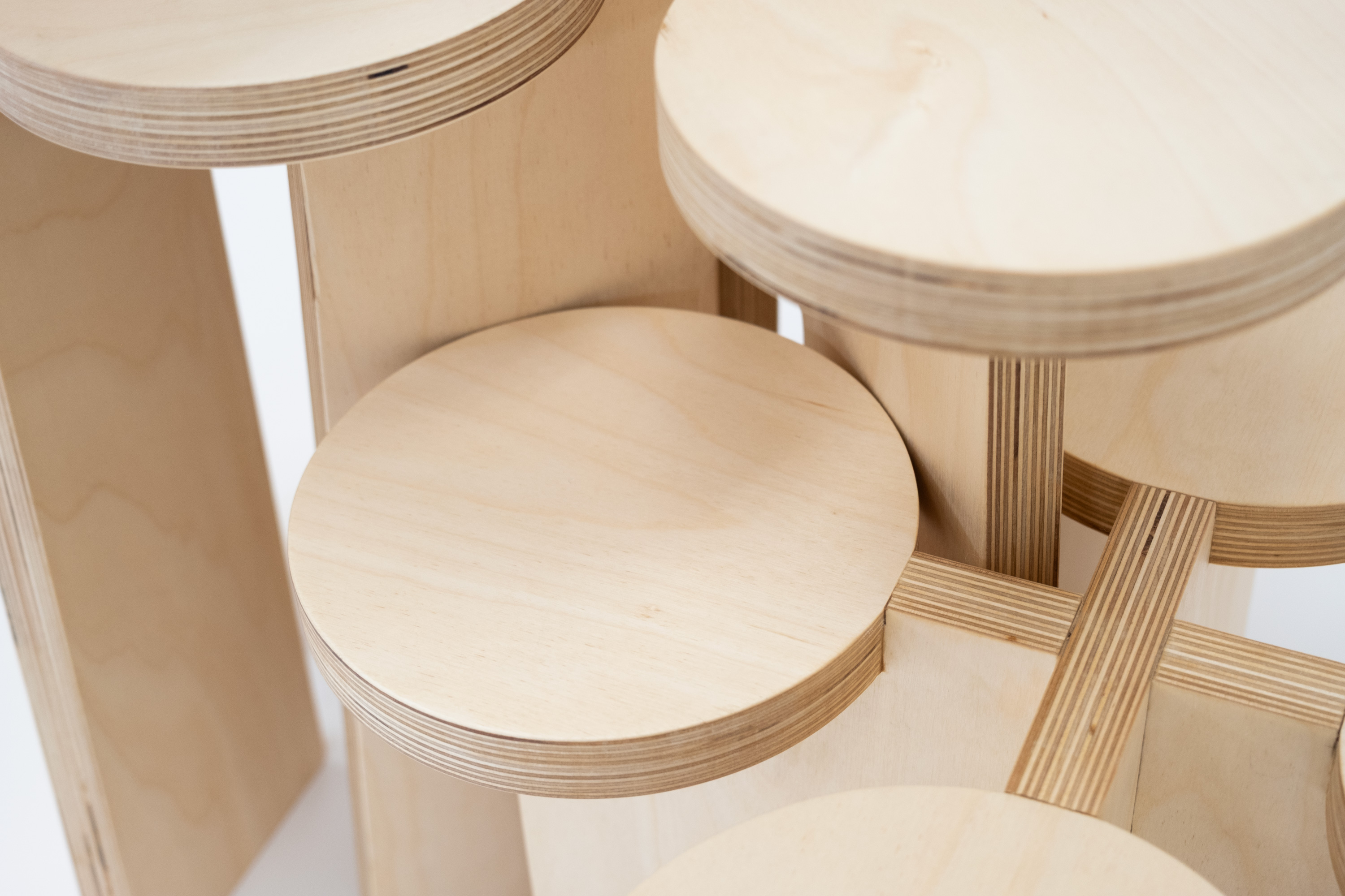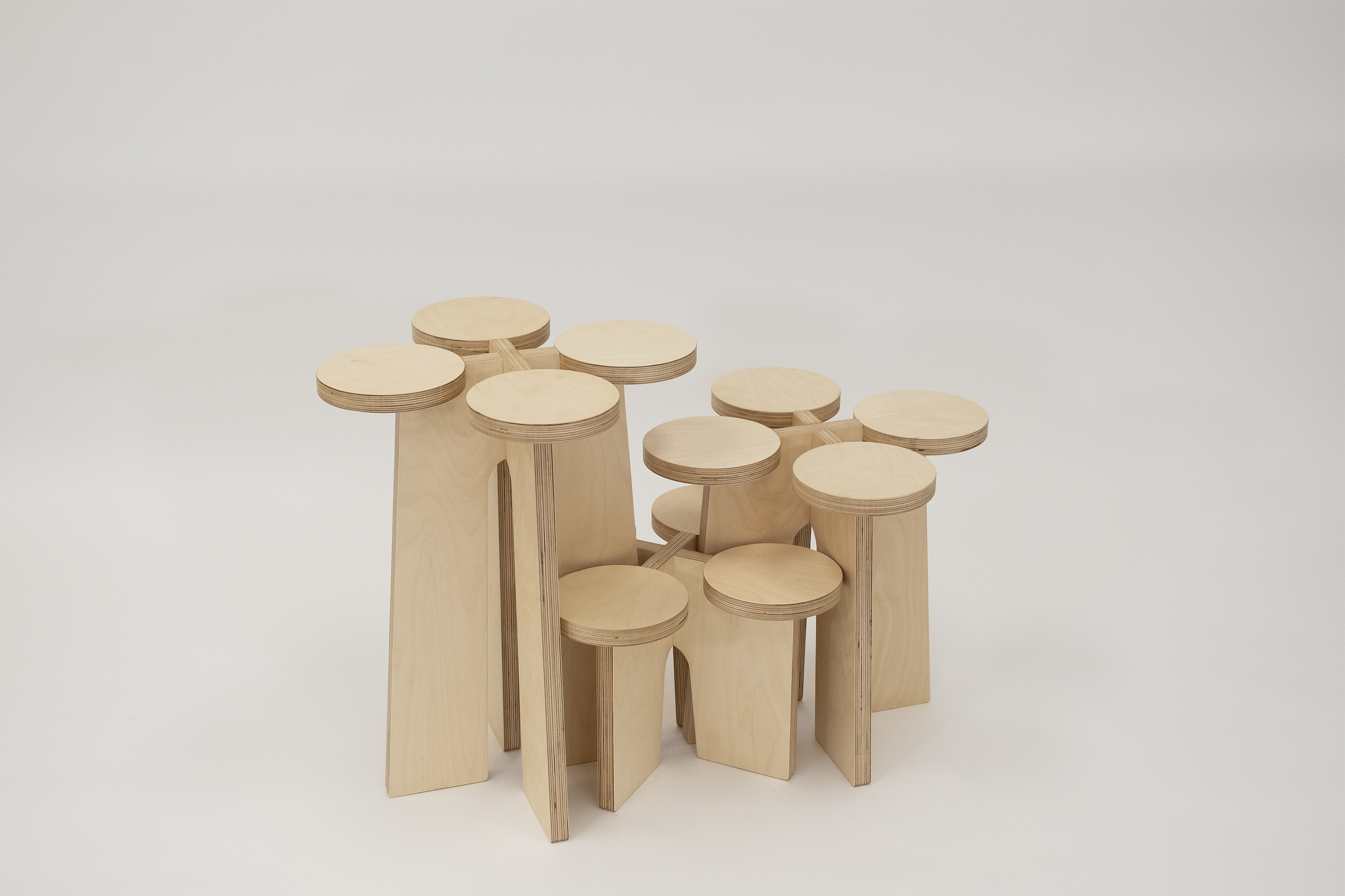Inspired by fractal formations, Fractal System offers a set of non-directional, nestable objects that can be used as stools, stands, or shelves. There are multiple ways of stacking and intersecting these objects—different spatial relationships emerge, depending on the quantity and position one decides to employ.