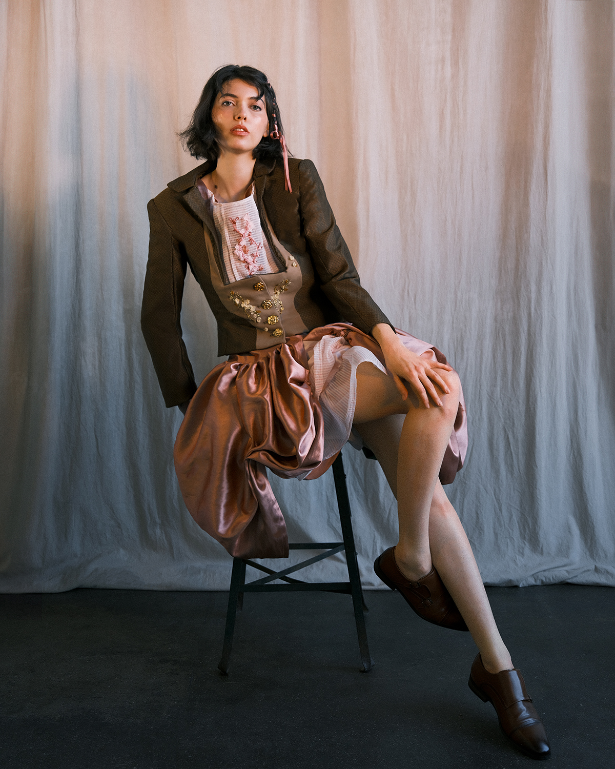 The result is a collection of two looks with a more solemn suit jacket on top, and light colored, loose waisted dress inside. Both garments are loose waisted in order to confirm with more body shapes and sizes, and they are, in general, smart yet able to blend into most everyday occasions. To facilitate everyday use, pockets are implemented into side of skirts, side of jackets, and a large pocket at the chest for the pink dress as well as leather implemented sturdy pockets under its skirt layers. This small collection aims to express oneself in daily life while facilitating everyday acts.