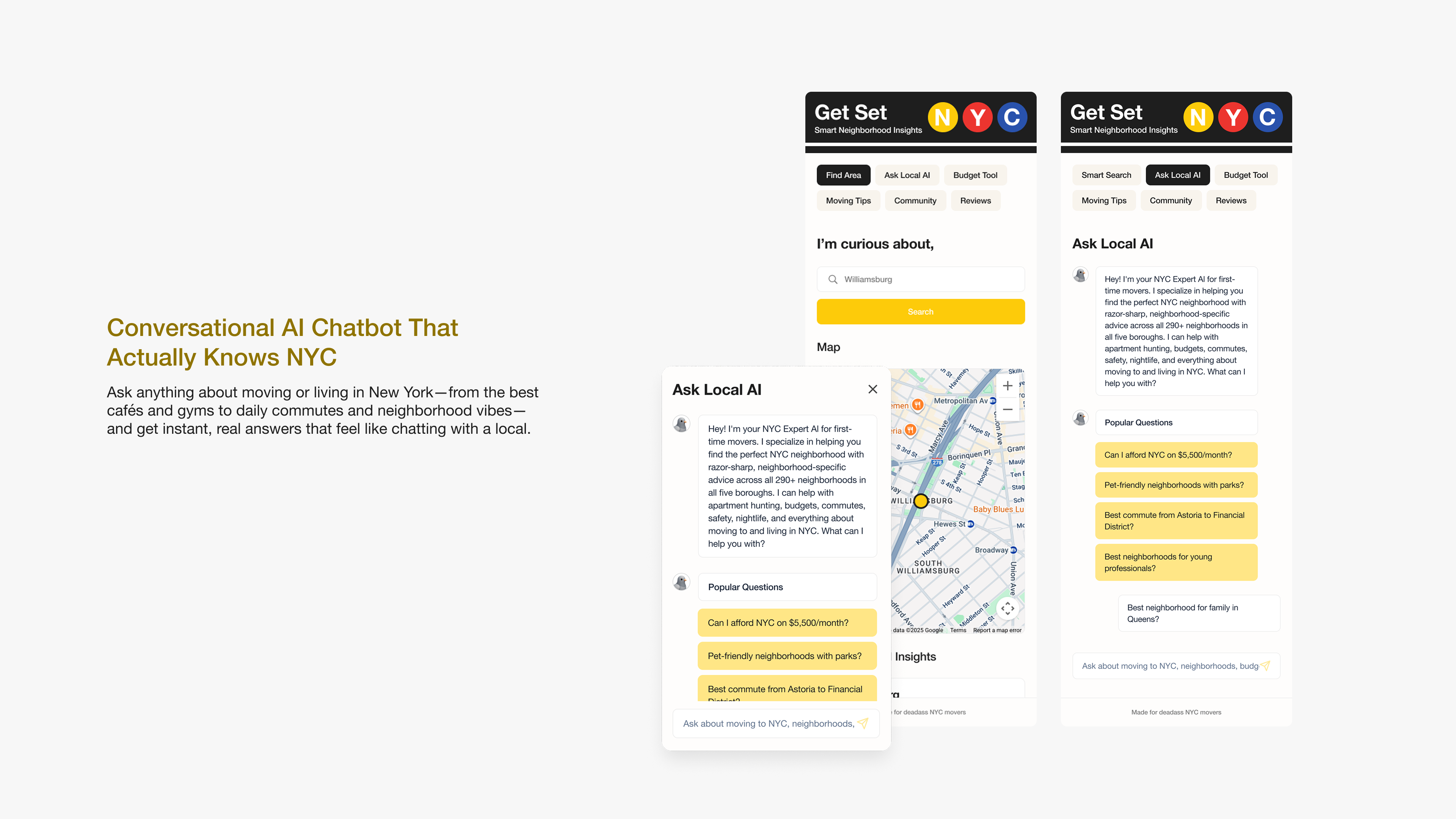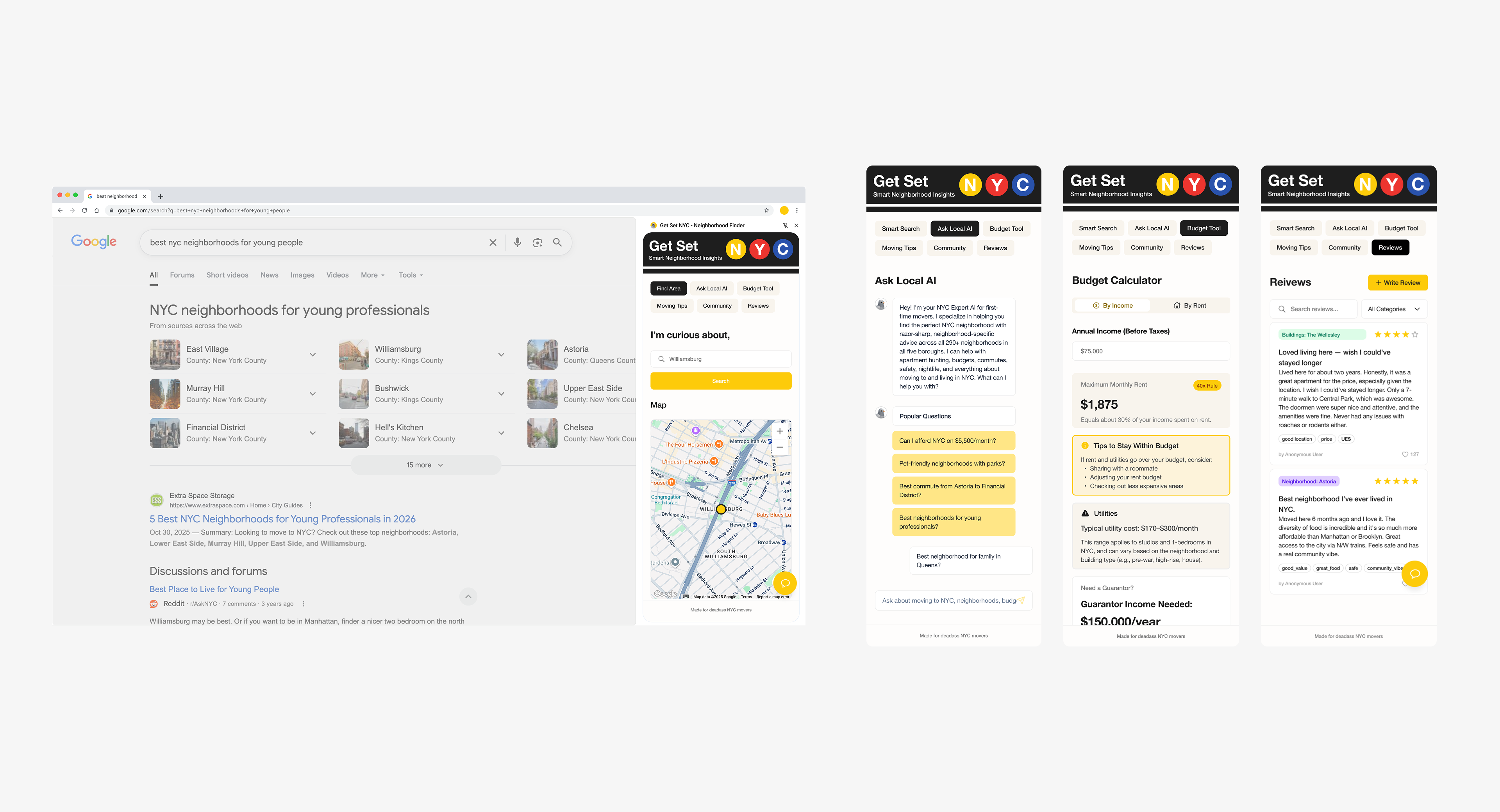 Get Set NYC covers more than 300 New York City neighborhoods and supports thousands of searches each month. At its core, the product helps newcomers feel oriented, informed, and confident, turning a stressful process into one that feels grounded, human, and empowering.