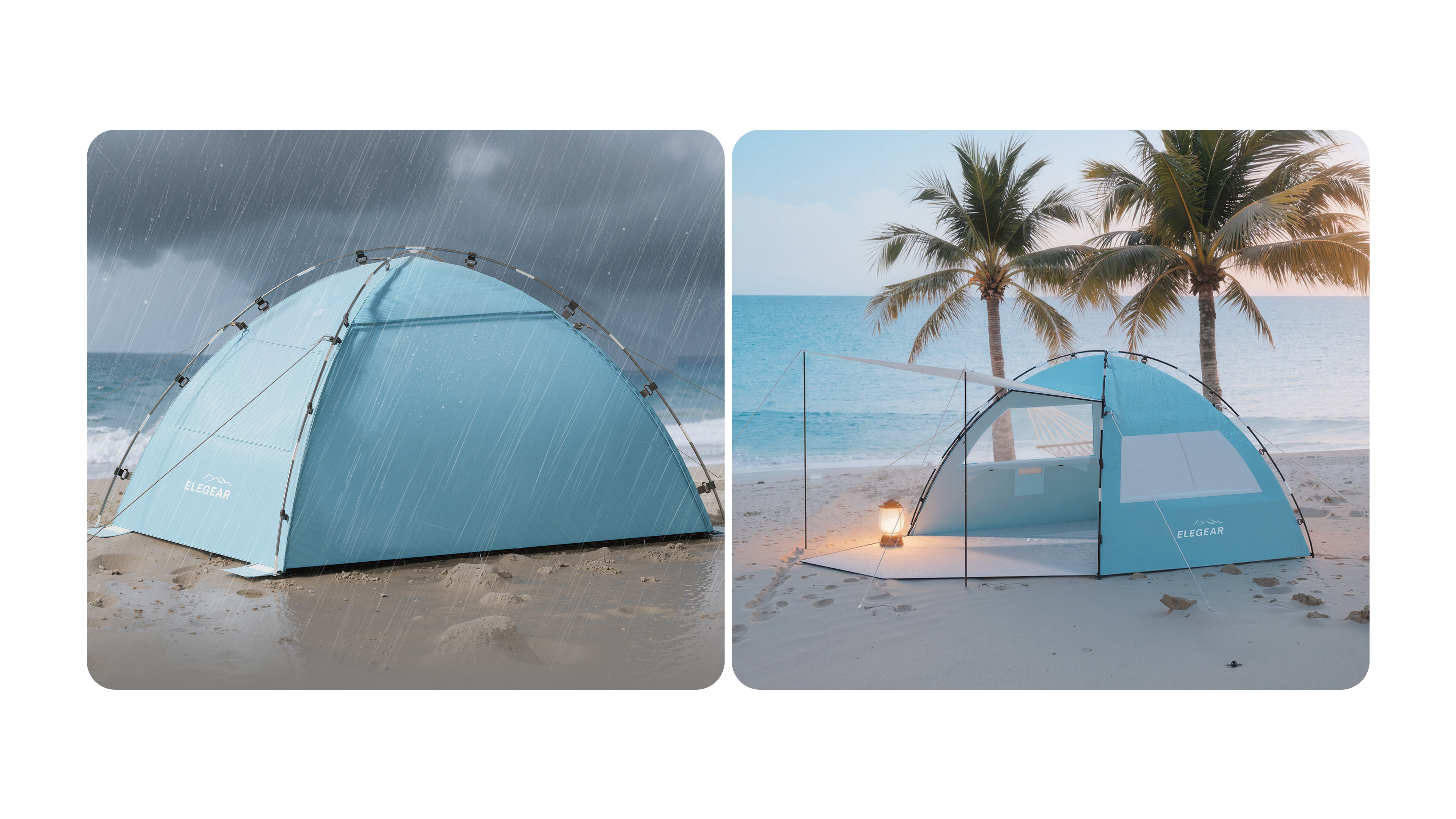This design focuses on "multi-scenario versatility" as its core concept. Addressing the limitations of traditional beach tents—which often suffer from singular functions and rigid forms—this design introduces an extendable sun canopy and a multi-opening structure. by controlling the combination of the canopy, front and rear doors, and side vents, the tent can transition seamlessly between fully enclosed, semi-enclosed, and open states. This ensures that sun protection, rain resistance, ventilation, and privacy are no longer trade-offs, but dynamic features that adapt to changing environmental conditions. The tent's visual identity is defined by the integration of the sun canopy and the main body structure. Its overall proportions are designed around its expanded footprint, ensuring it maintains a stable and cohesive visual form even when fully deployed. The minimalist sky-blue colorway reduces visual strain in bright environments and helps minimize heat absorption. Furthermore, the overall form utilizes clear structural zoning, allowing users to intuitively understand how to use the tent simply by looking at its exterior. Constructed from 190T double-layer silver-coated polyester, the tent features a UPF 50+ rating, blocking up to 99% of UV rays and effectively reducing internal temperatures for extended beach and camping use. The extendable front canopy expands the shaded area, while the mesh ventilation windows and zippered rear door create a cross-ventilation system, ensuring airflow even when fully shaded. The interior comfortably accommodates 4–5 people, striking an optimal balance between sheltered space and breathable comfort.