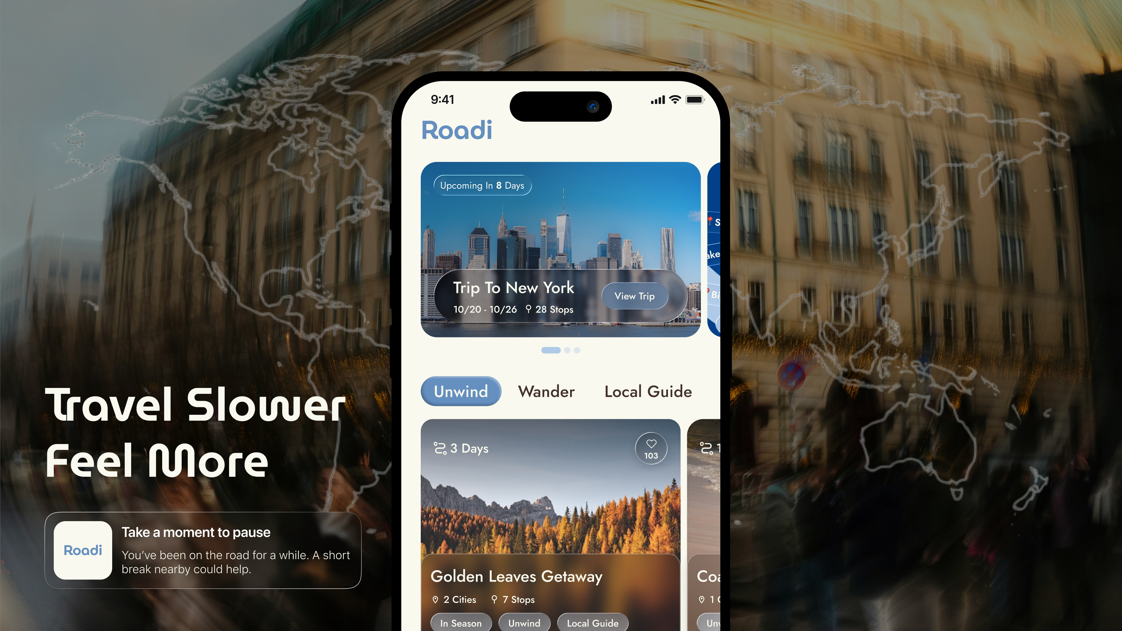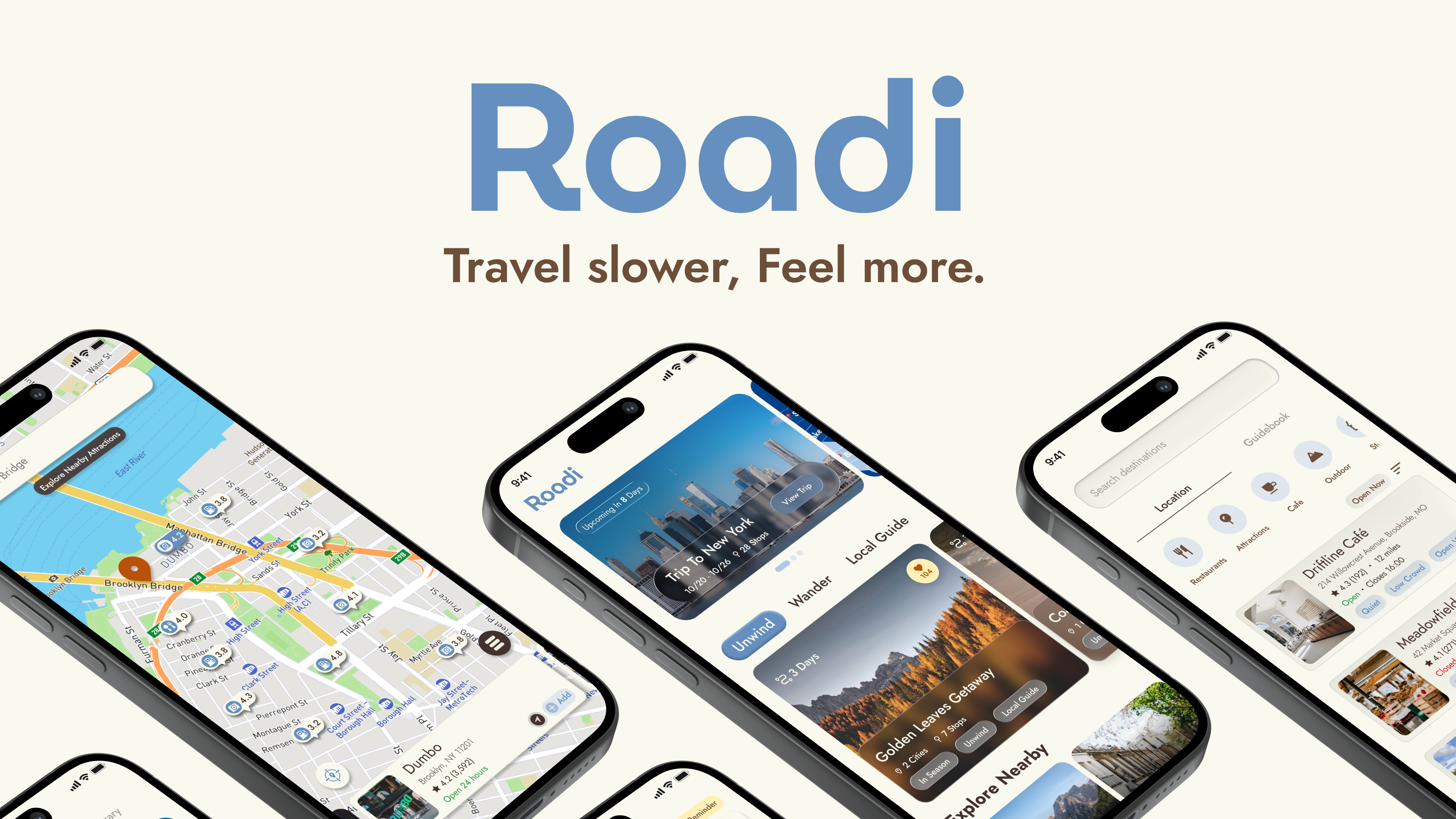 Roadi is a mobile app designed for people who seek slow travel, travel that prioritizes emotional well-being, presence, and genuine connection over speed and quantity. Instead of encouraging users to go farther, faster, or to more places, Roadi invites travelers to slow down, stay present, and experience more through fewer, more meaningful moments. Roadi rethinks travel navigation through a psychological and experiential lens, asking a different question: How can a journey feel calmer, more intentional, and more restorative?