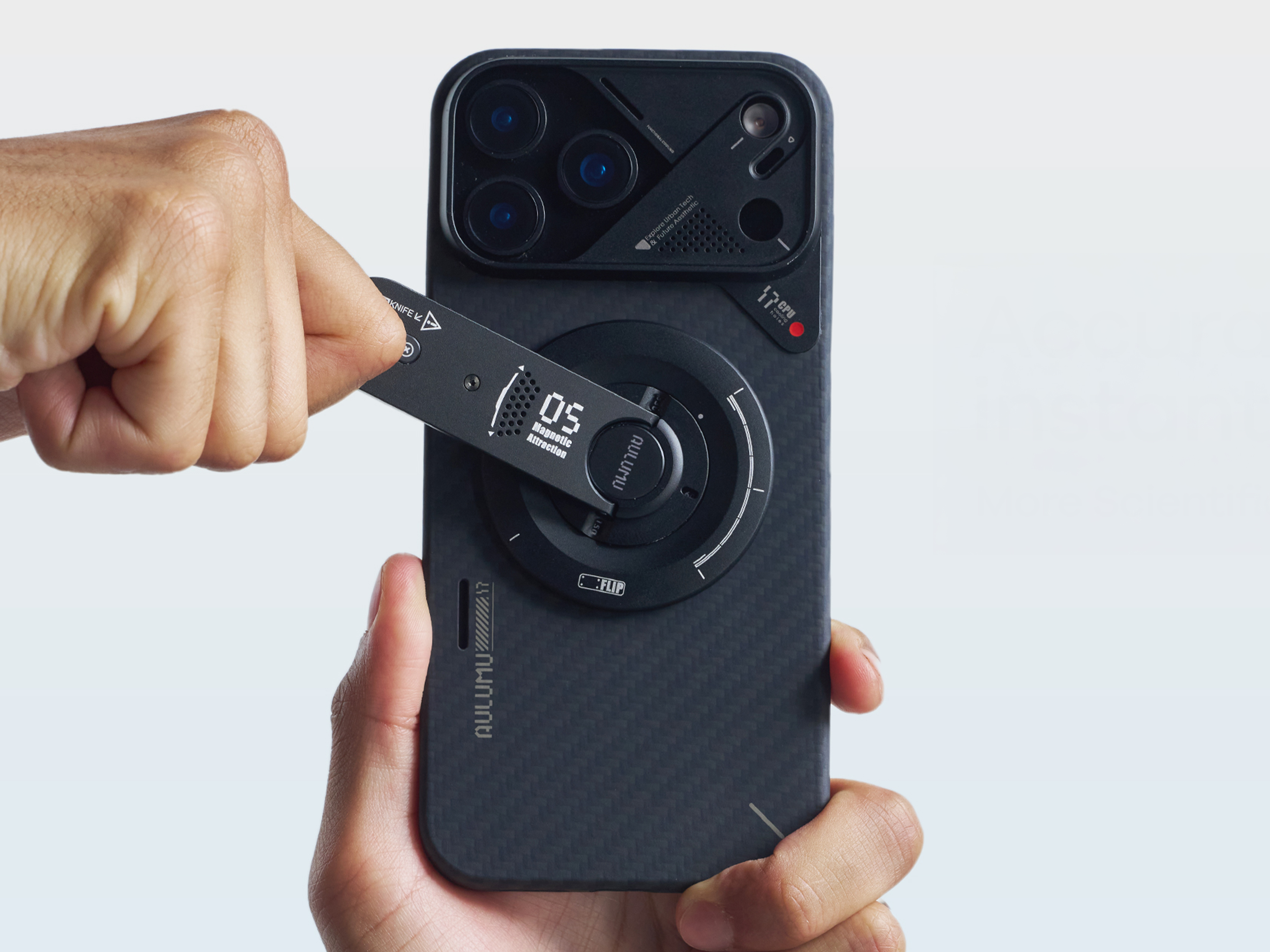G05 Air redefines the phone stand, transforming it from a simple support accessory into a portable ‘micro tool station’. By integrating a phone stand, a mini toolkit (flathead screwdriver/saw blade/SIM ejector tool/stainless steel blade), a box cutter, a stress-relief spinner, a protractor, and a phone grip into an ultra-thin (6.5mm) and ultra-light (38g) body, it provides multiple scenario-specific functions such as support, unboxing, stress relief, measurement, SIM card replacement, and basic repairs, precisely accommodating fragmented scenarios in daily life. At the same time, G05 Air incorporates a full-scenario support system: it features a 25N magnetic module, offering a maximum load capacity of 2.5kg; it supports stepless angle adjustment (0°–90°) and 360° smooth rotation, adapting to diverse scenarios (video watching/conference calls/gaming, etc.); its Phone Grip function reduces pressure on the pinky finger, ensuring comfort during prolonged use. Moreover, G05 Air produces the satisfying ‘click’ sound during rotation and allows infinite rotation, soothing users in tactile and auditory ways. Such a product fully meets users’ demands for efficiency, convenience, and psychological satisfaction.