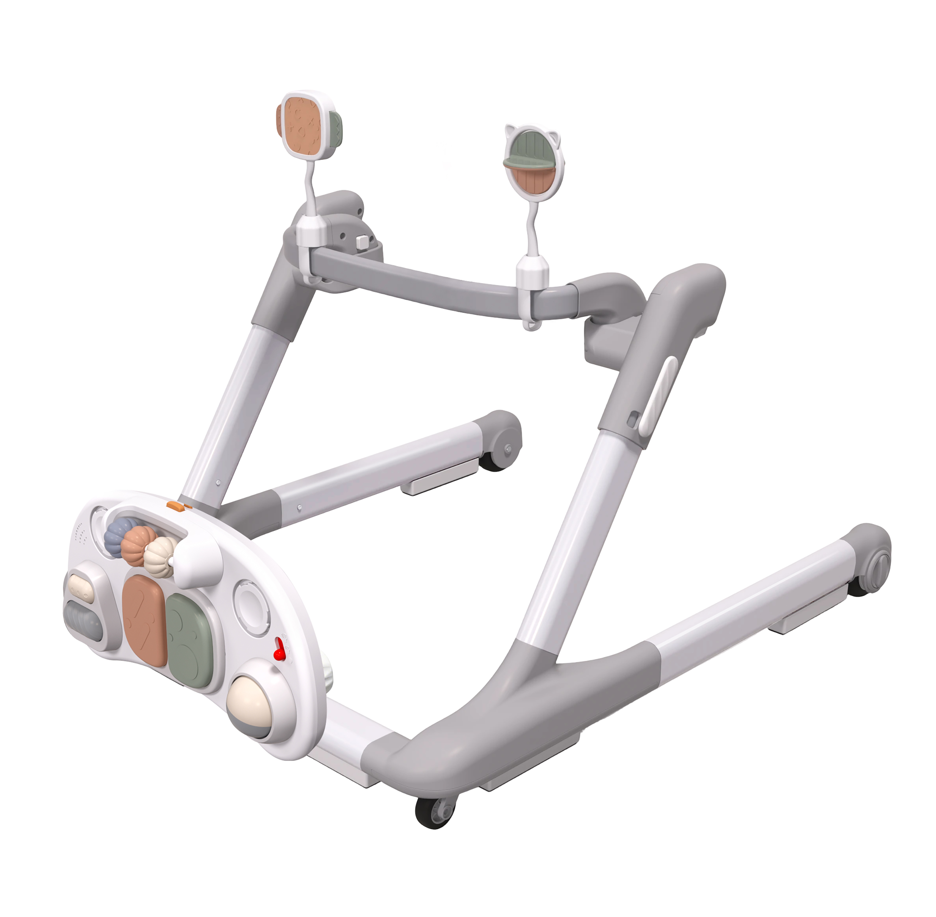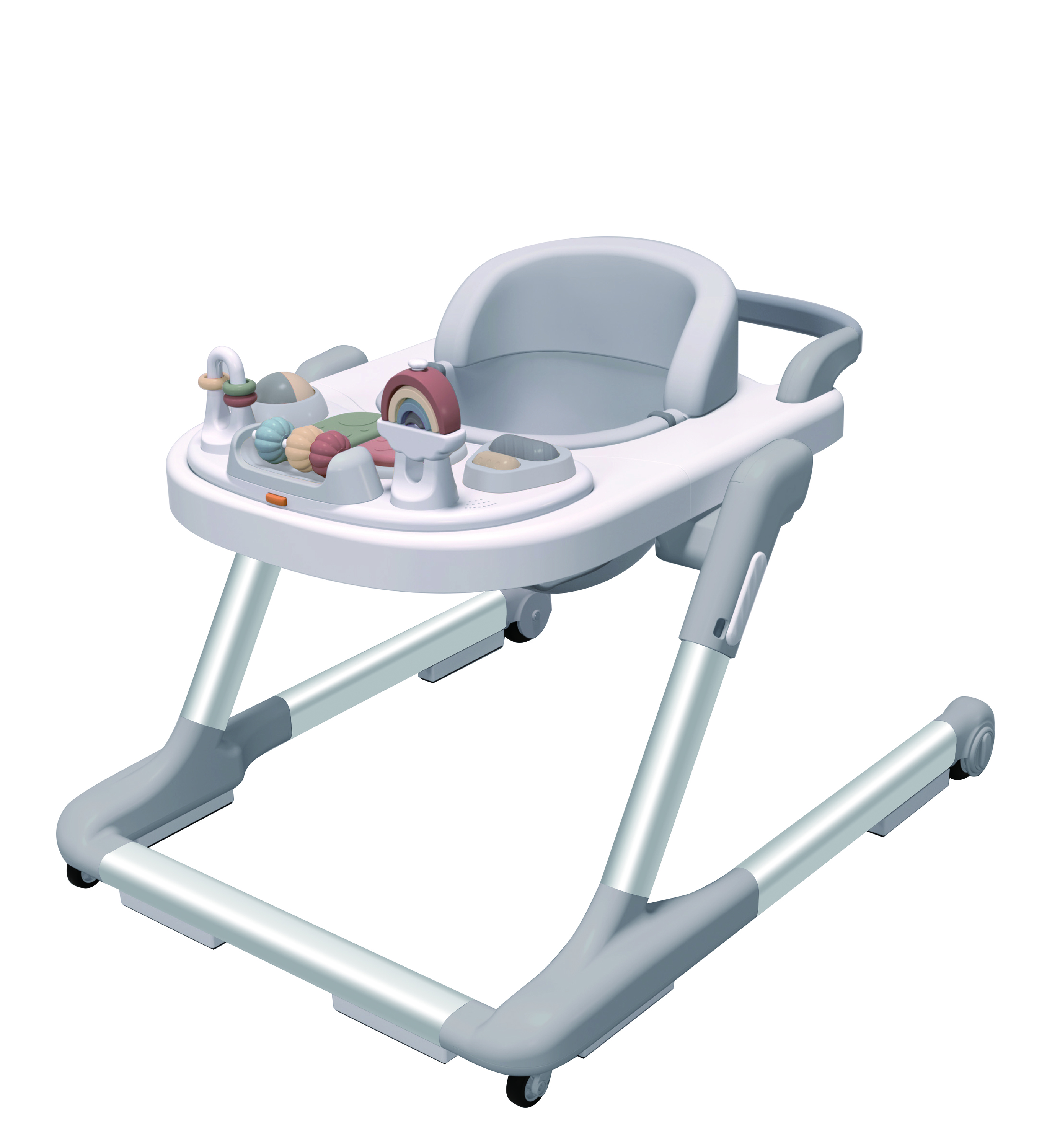 This baby walker boasts an innovative, highly integrated reconfigurable frame that enables quick conversion between four functional modes—baby gym, stable seated walker, hand-push assist walker and feeding chair/table—with no tools required, seamlessly supporting the four key developmental behaviors of lying, standing, moving and eating for infants from birth up to approximately 18 months.