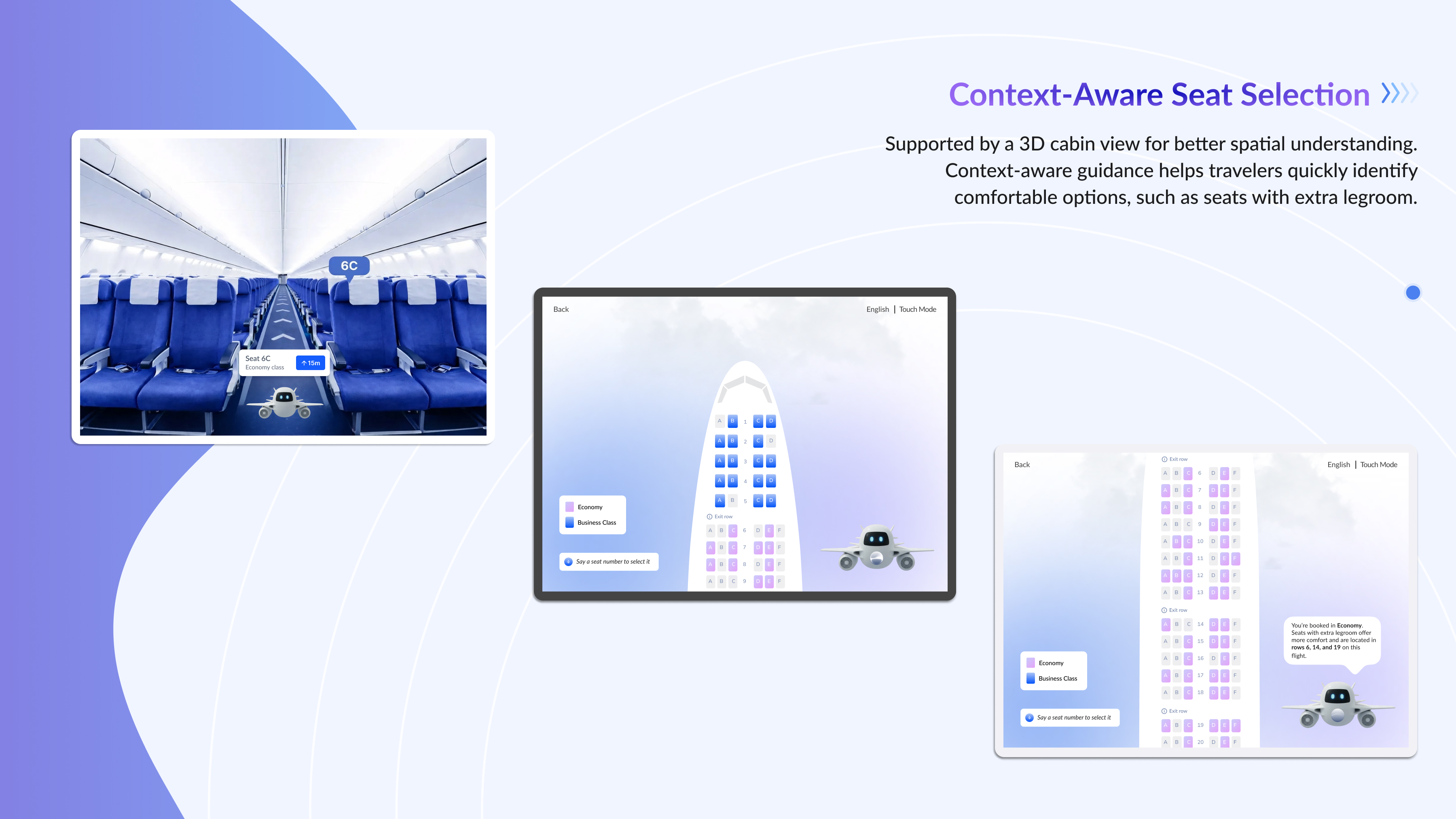 Through secure NFC-based interaction zones, Airo integrates with existing Digital ID frameworks to enable quick identity verification with a single tap. Travelers are greeted by name and presented with relevant flight information, ready for check-in without having to handle physical documents. For more specific or customized needs, Airo offers features such as 3D cabin-view seat selection for better spatial understanding.